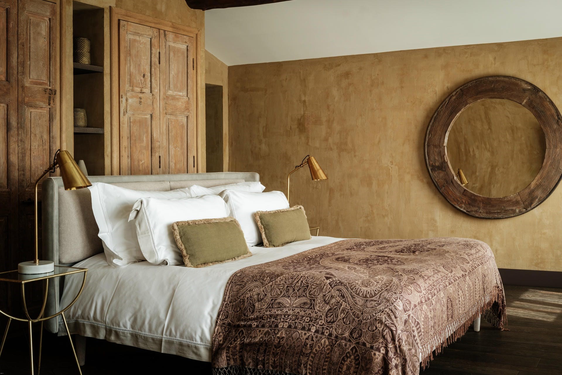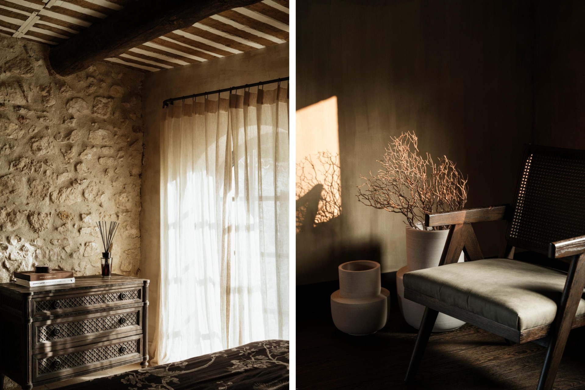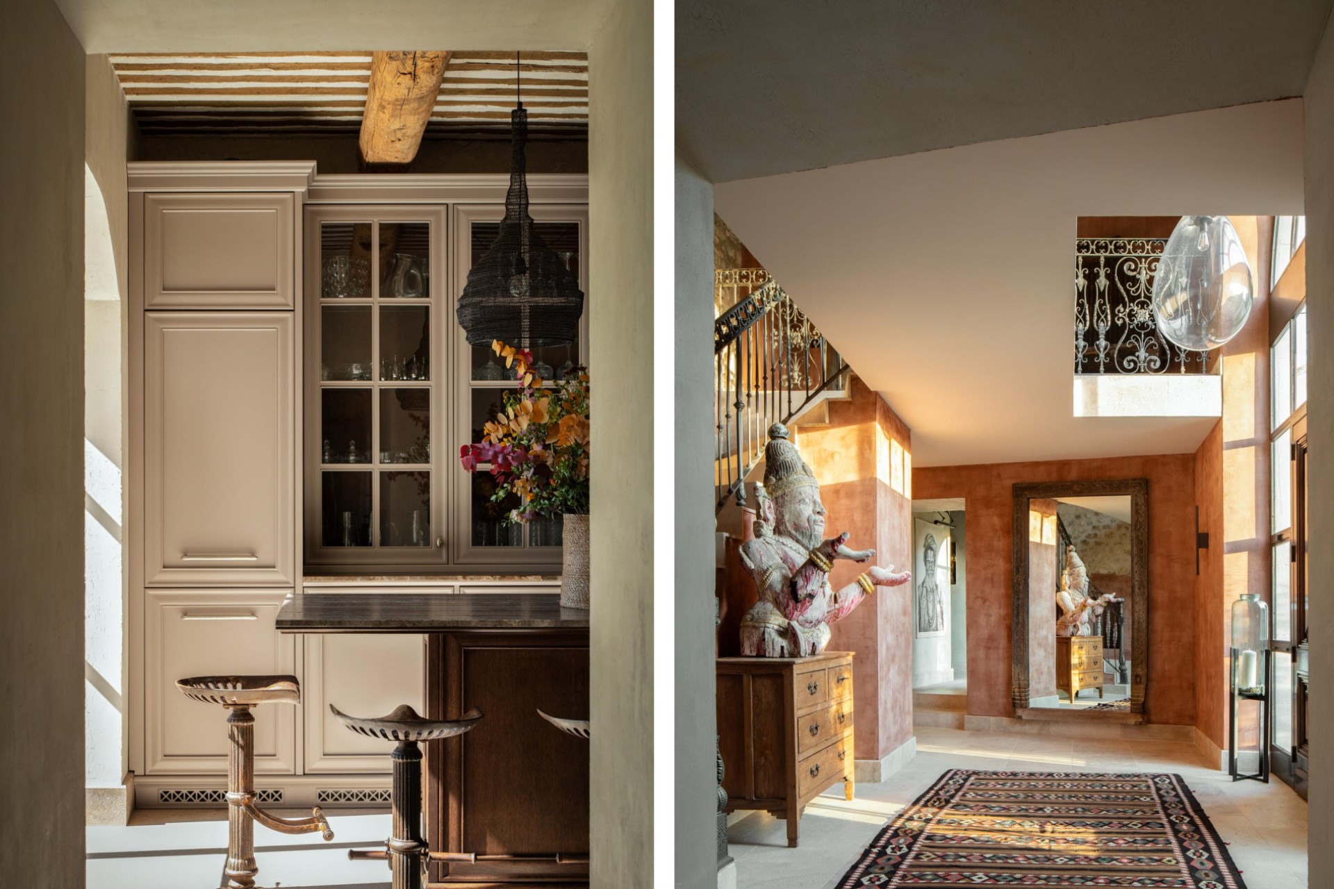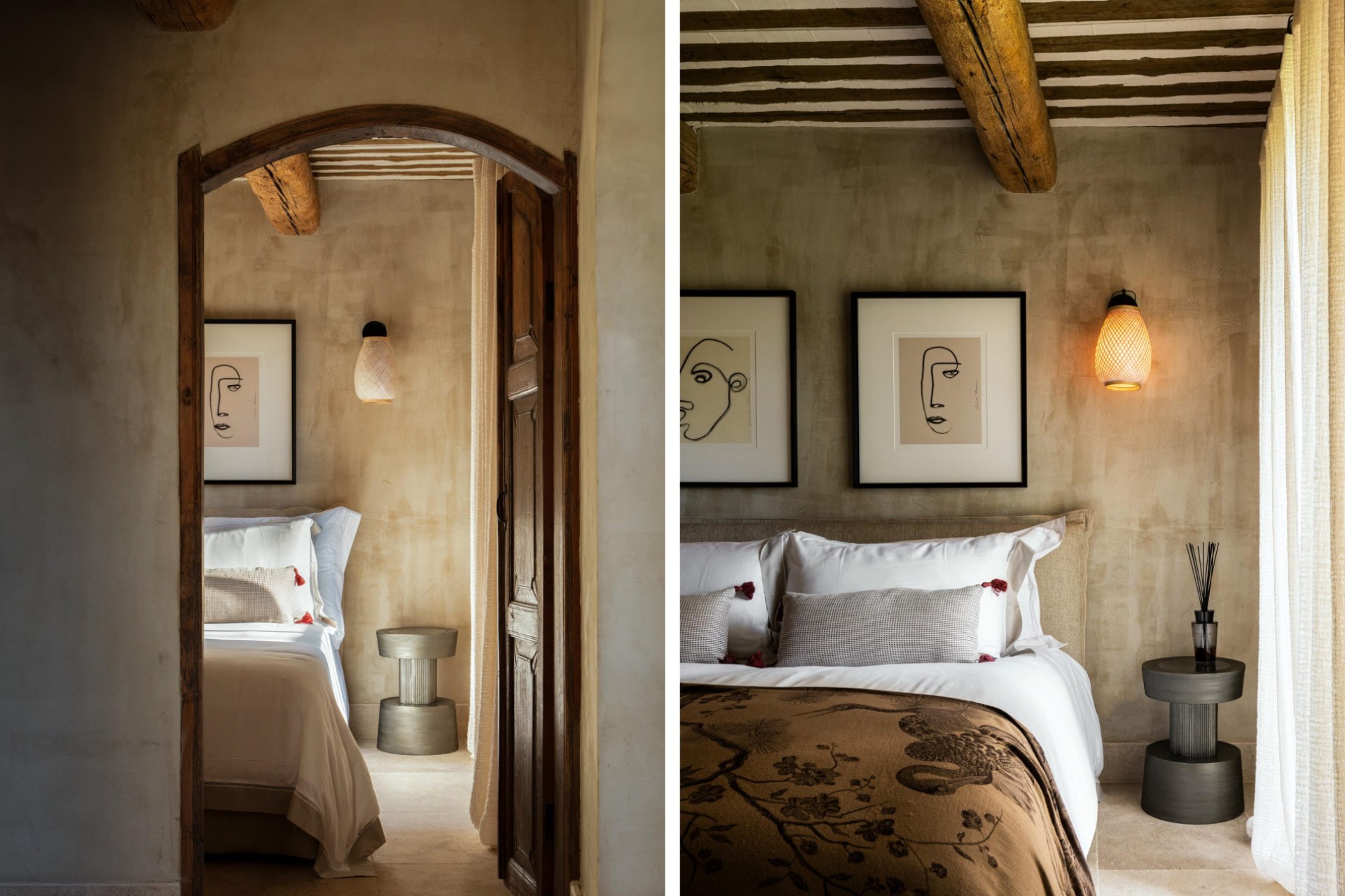 Indoors, the 18th-century bastide has been expertly restored. Floors laid with polished local limestone or dark oak, exposed ceiling beams hung with pendant lighting, and cosy fireplaces create a modern farmhouse feel.
