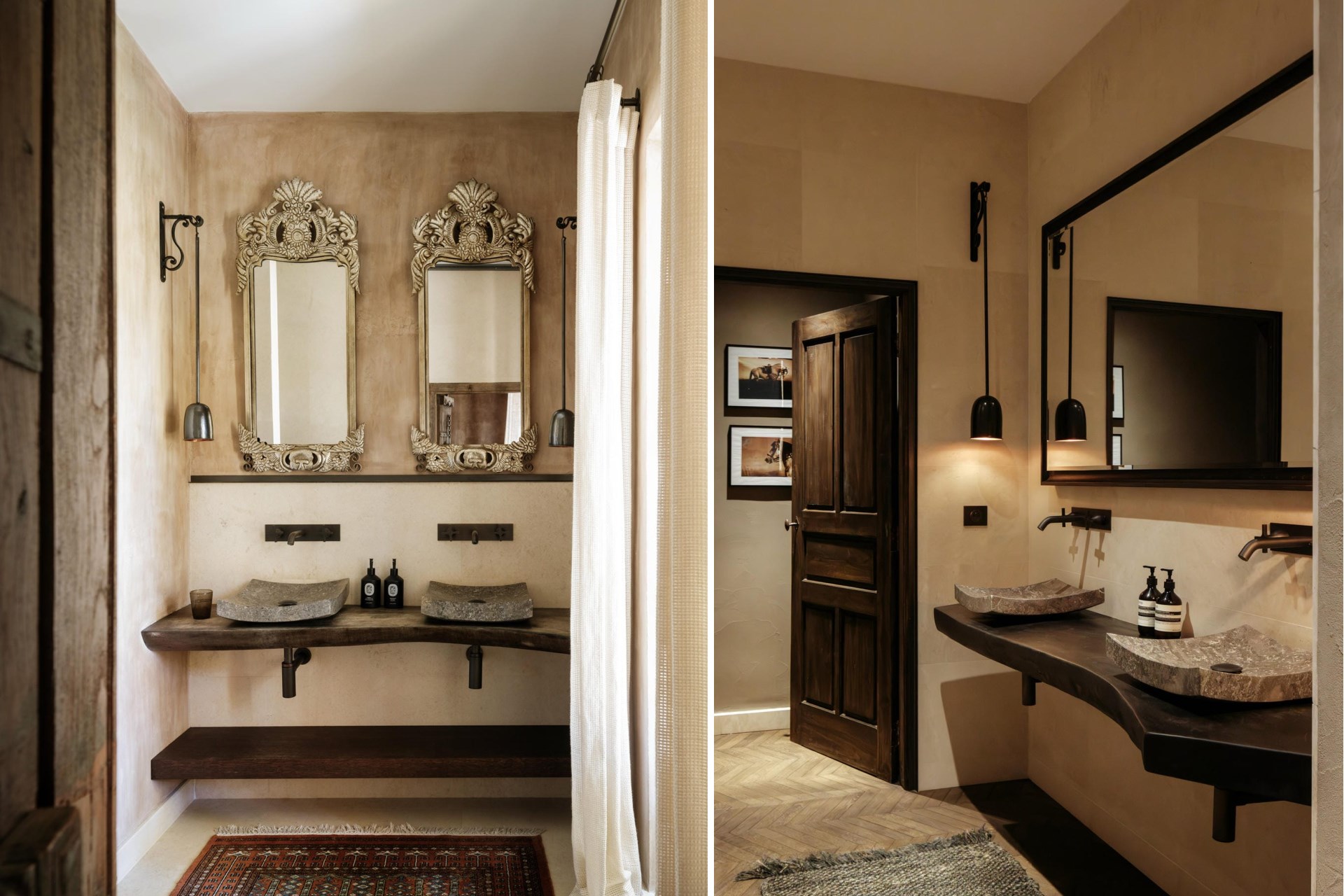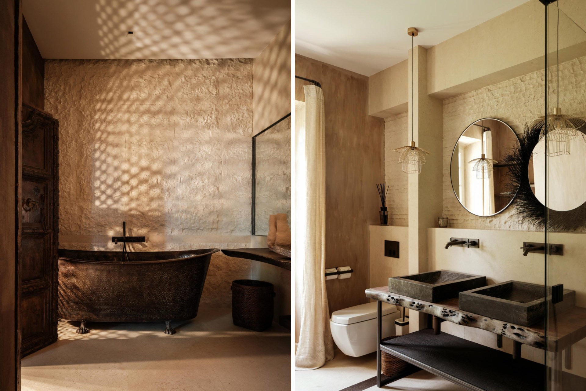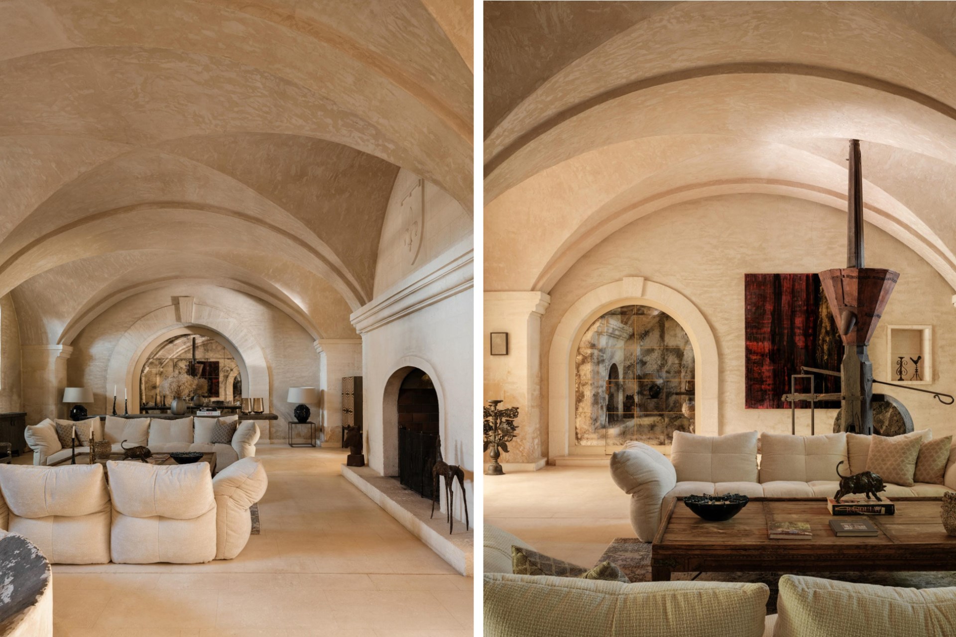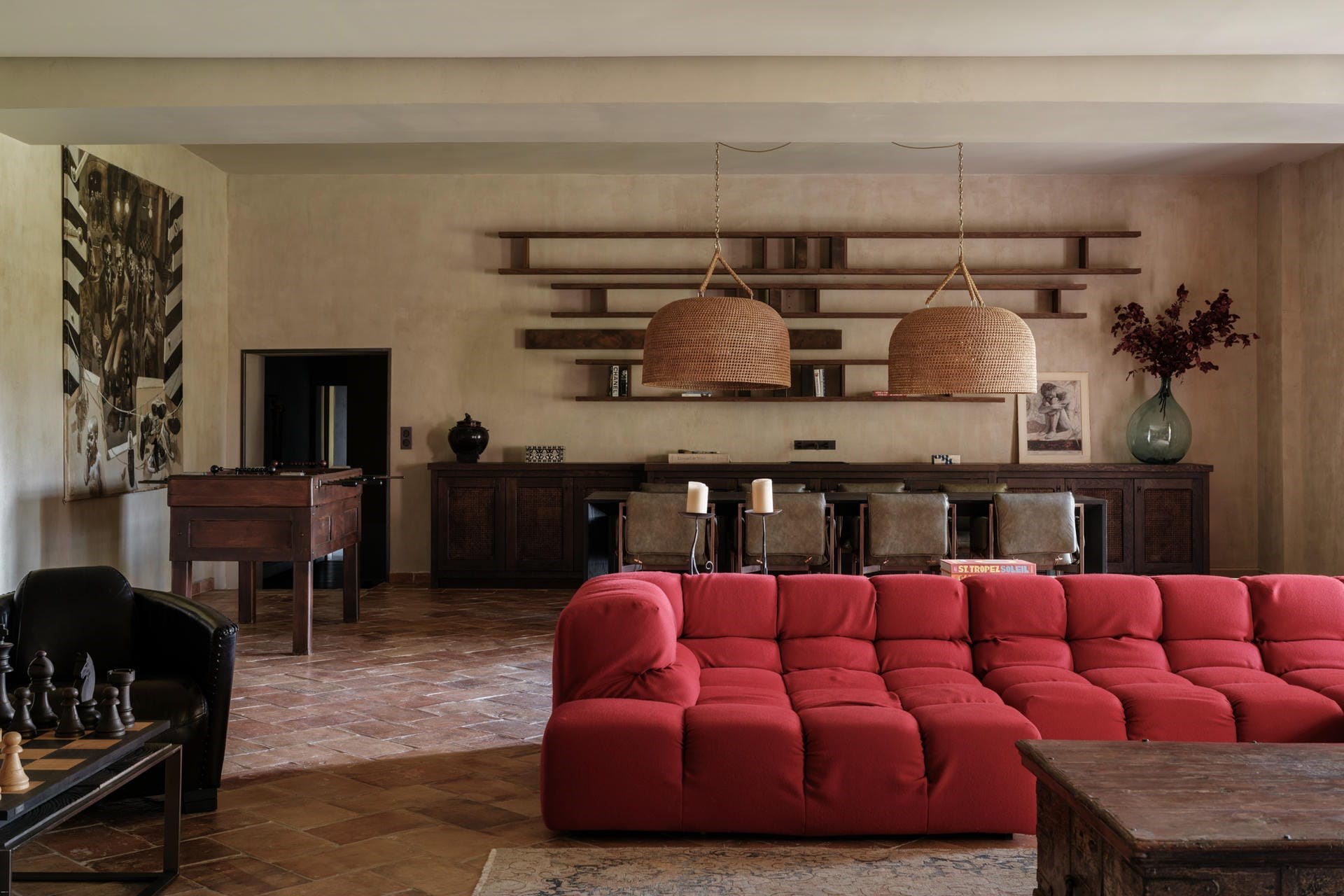 Nature is at the forefront of the building’s design, with local materials such as clay, sand, and limestone used throughout the interiors. There are various living areas, including a spacious lounge with domed ceilings and a stunning fireplace, as well as a bar and cinema room, which can also serve as a conference room for seminars, or event space for special occasions.
