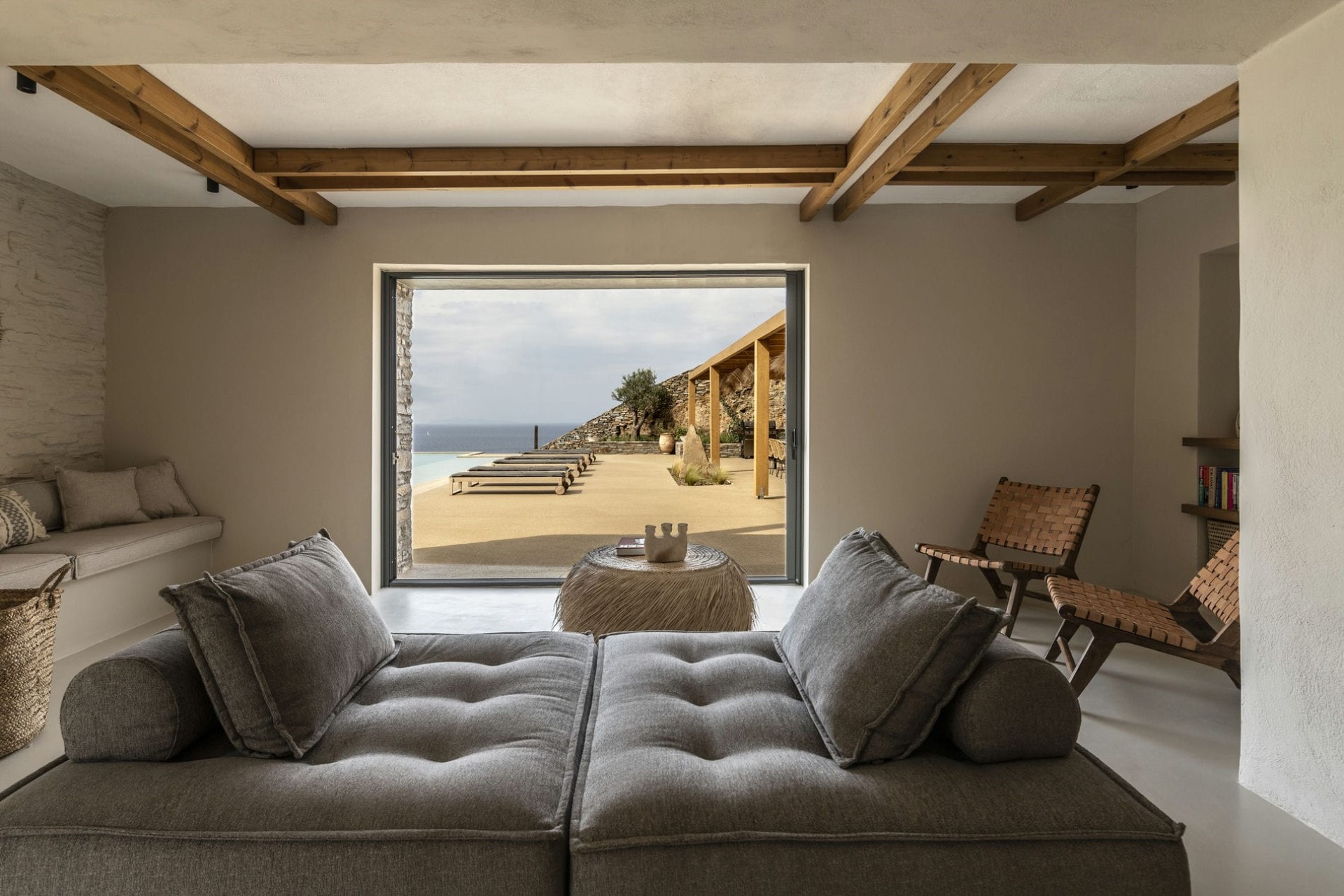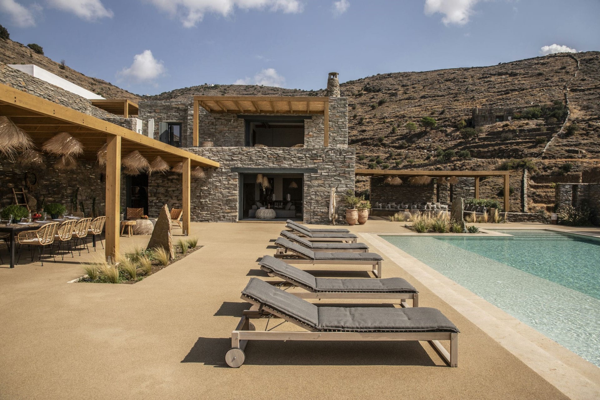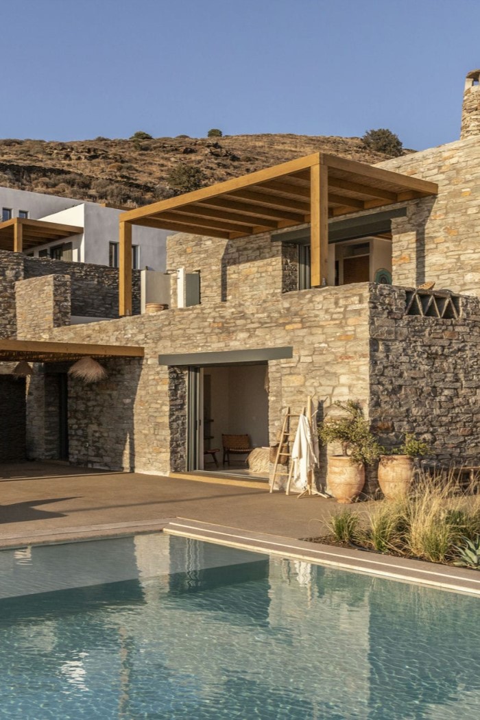 The villa is a multi-level masterpiece, with its exposed stone facade seamlessly blending into the surrounding rocks. Each level is adorned with terraces that offer breathtaking views of the Aegean Sea and the rugged island landscape.