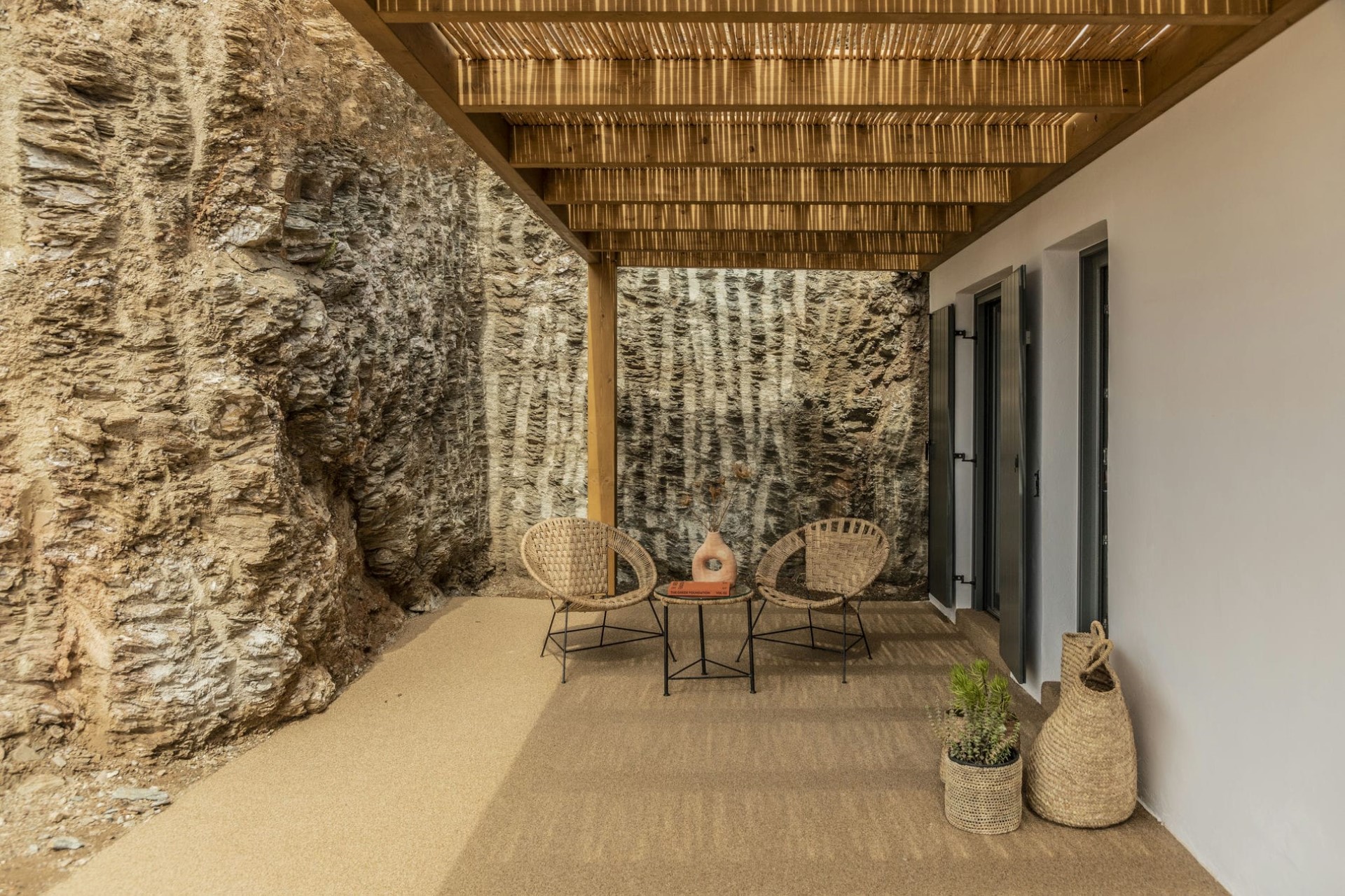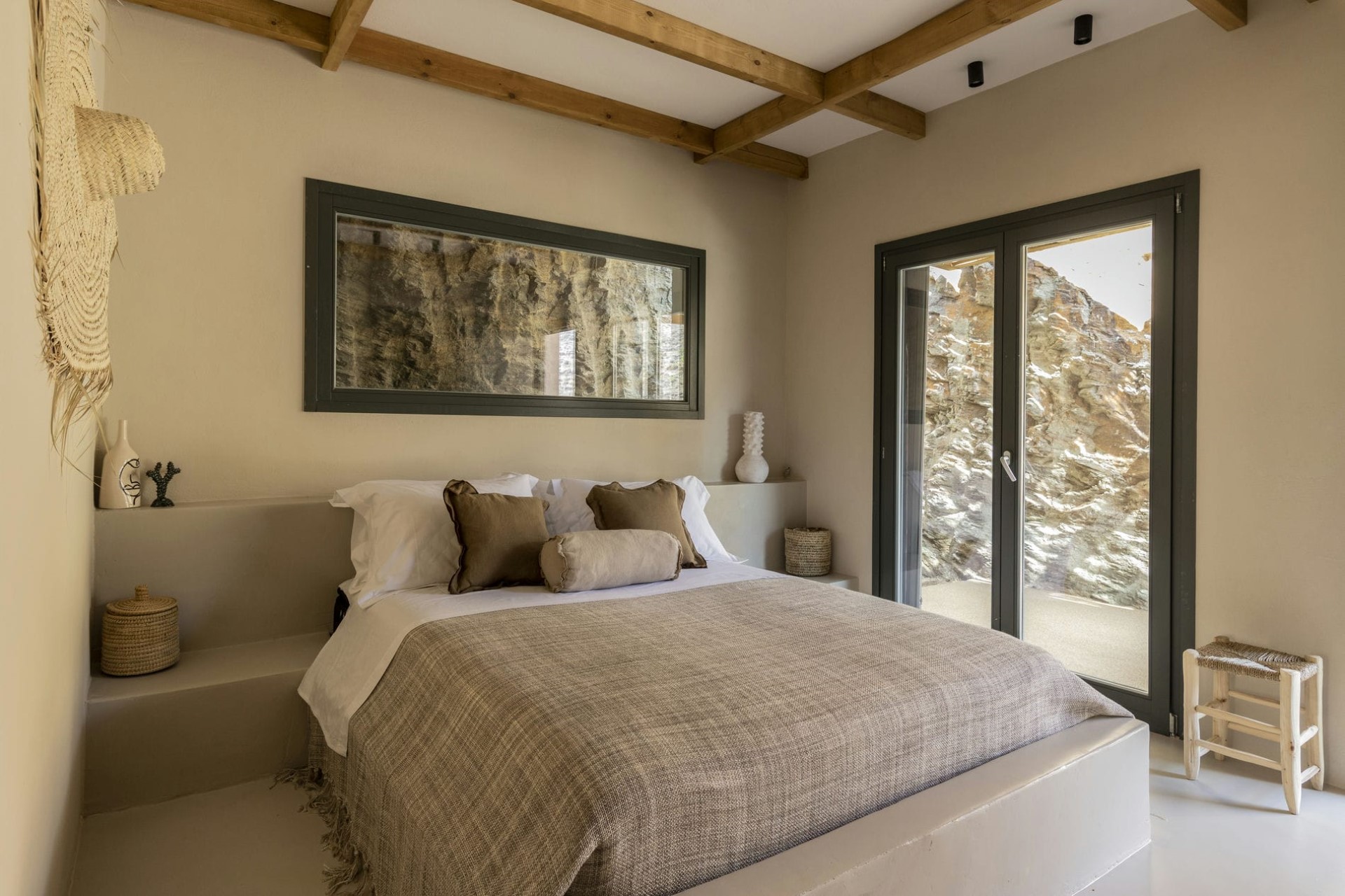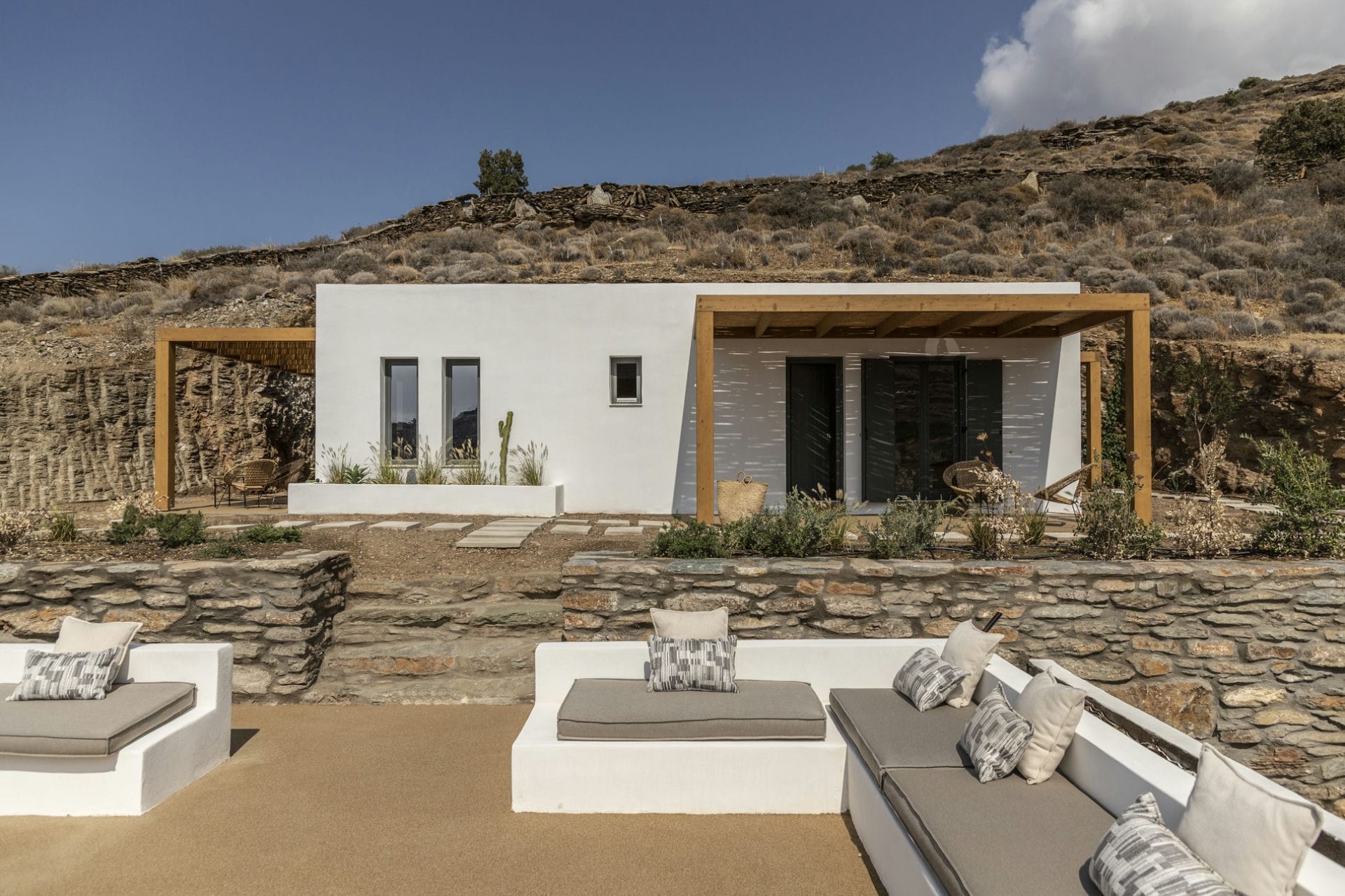 The villa is a multi-level masterpiece, with its exposed stone facade seamlessly blending into the surrounding rocks. Each level is adorned with terraces that offer breathtaking views of the Aegean Sea and the rugged island landscape.