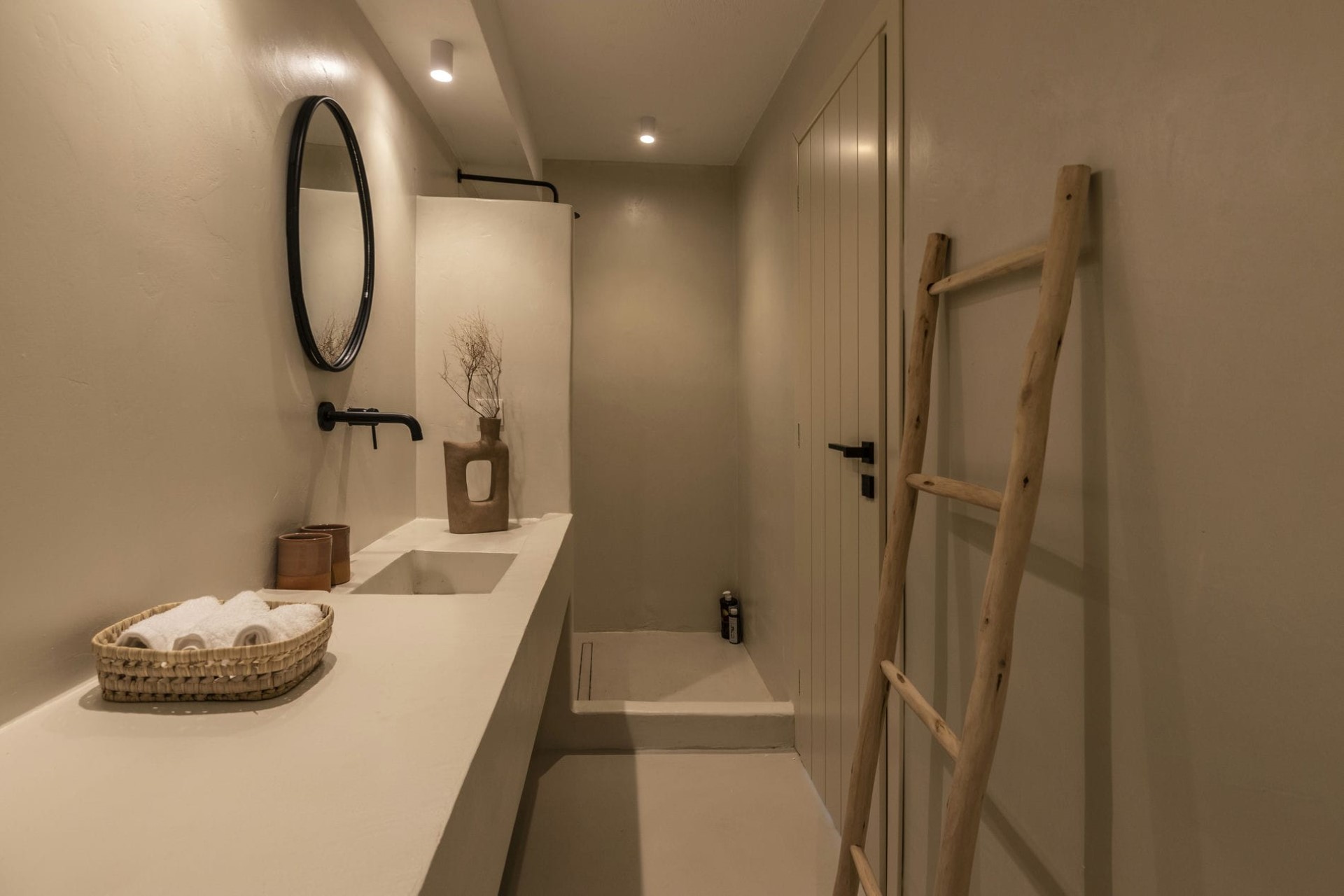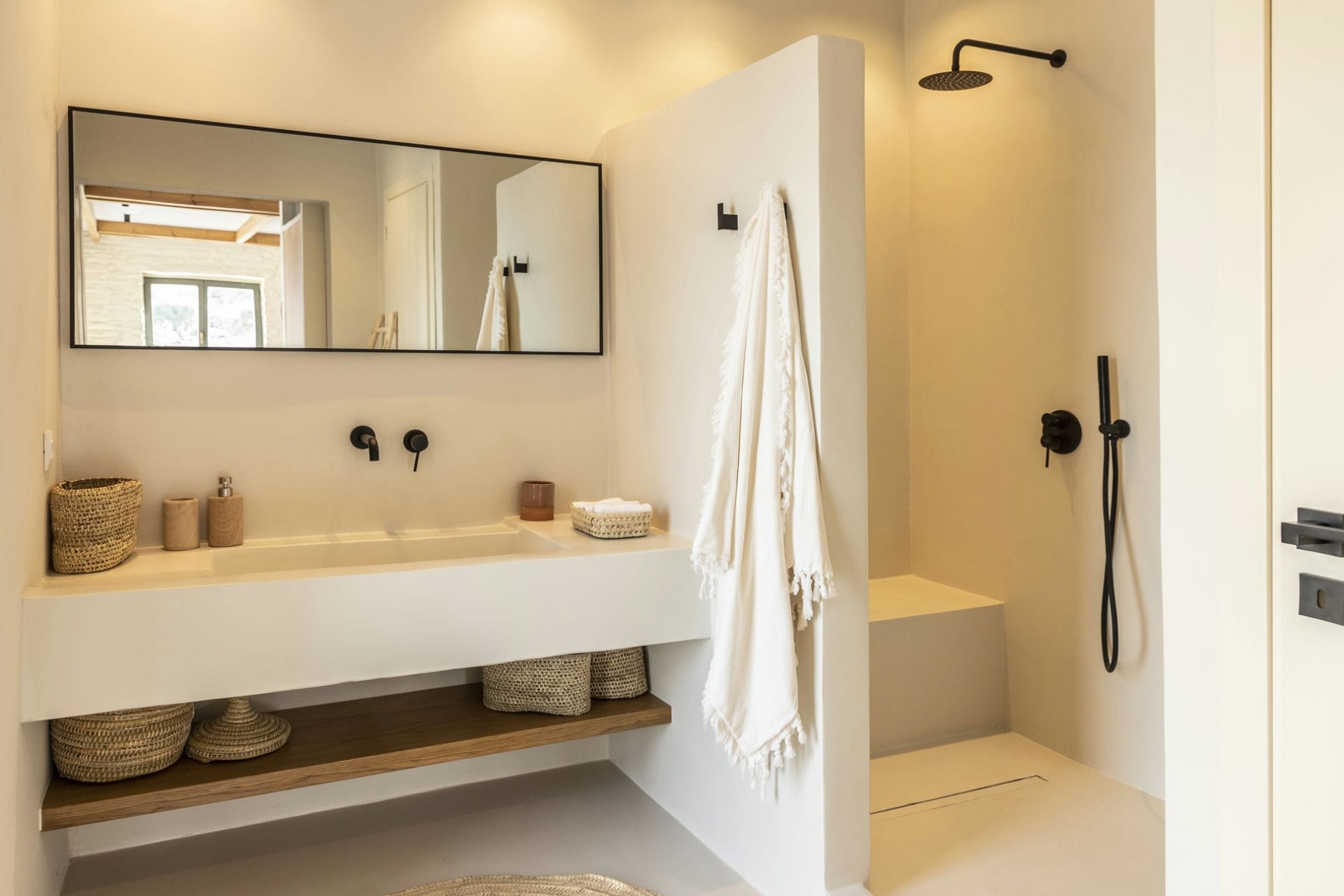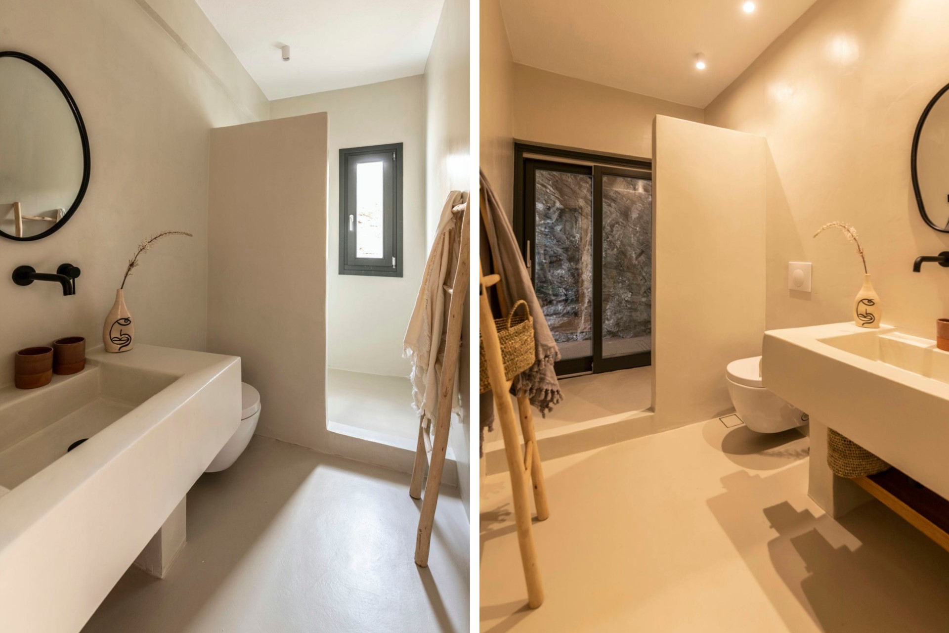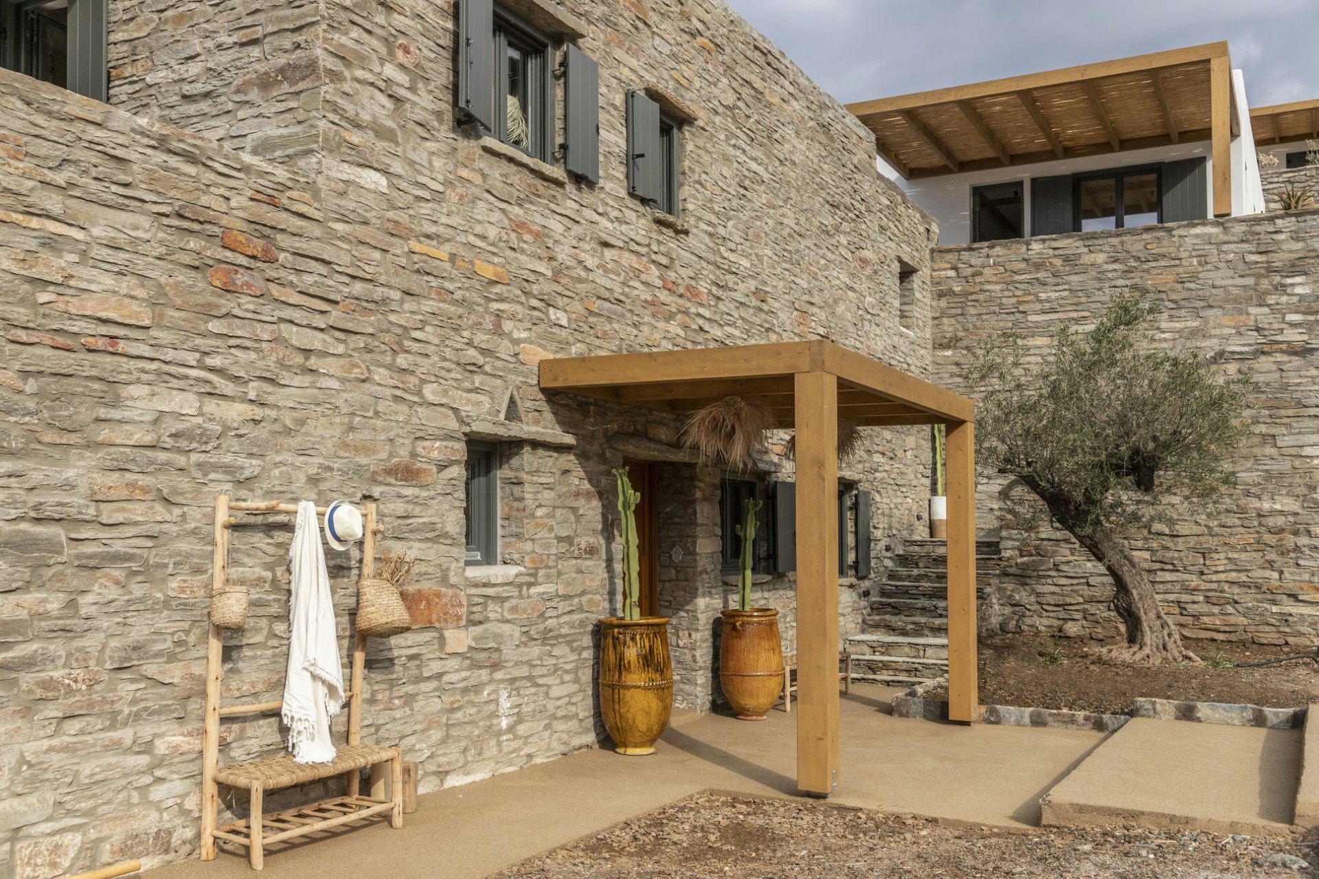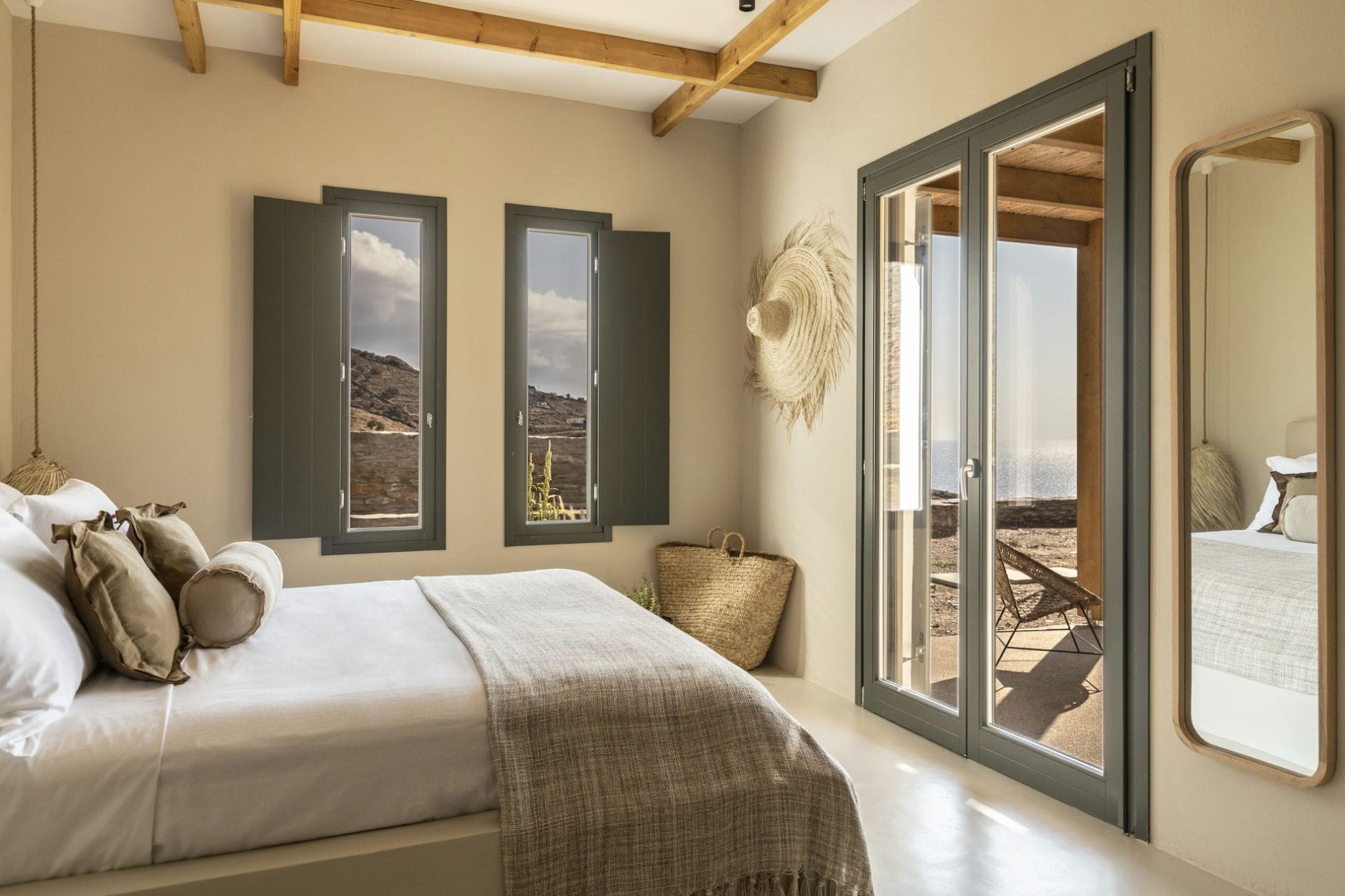 Koundouraki (Master) – king-size bed, en-suite bathroom with shower + outdoor shower, and private terrace with sea views