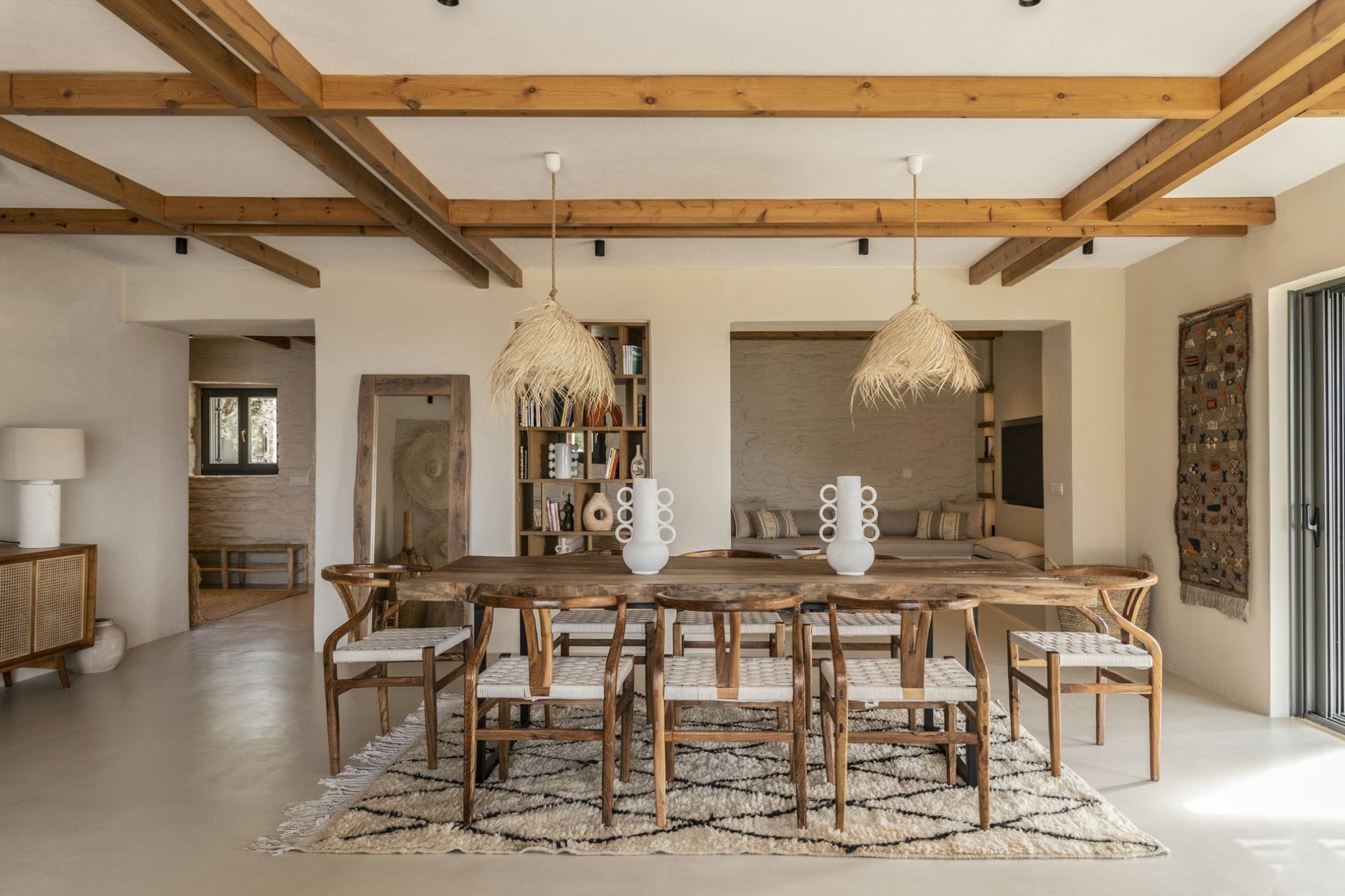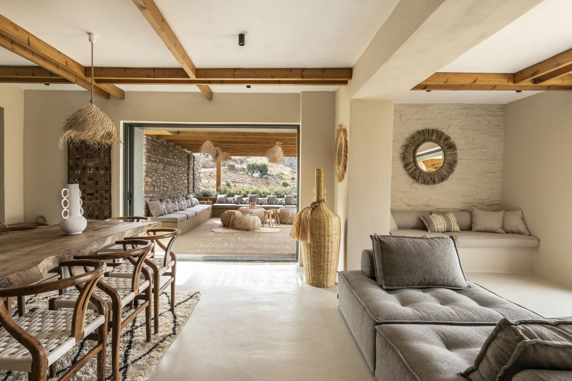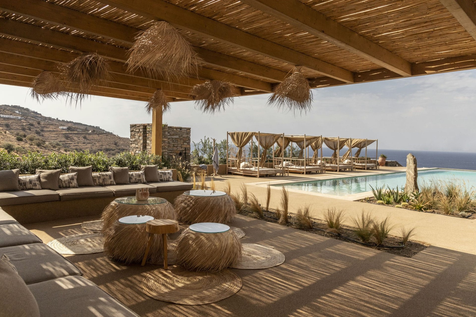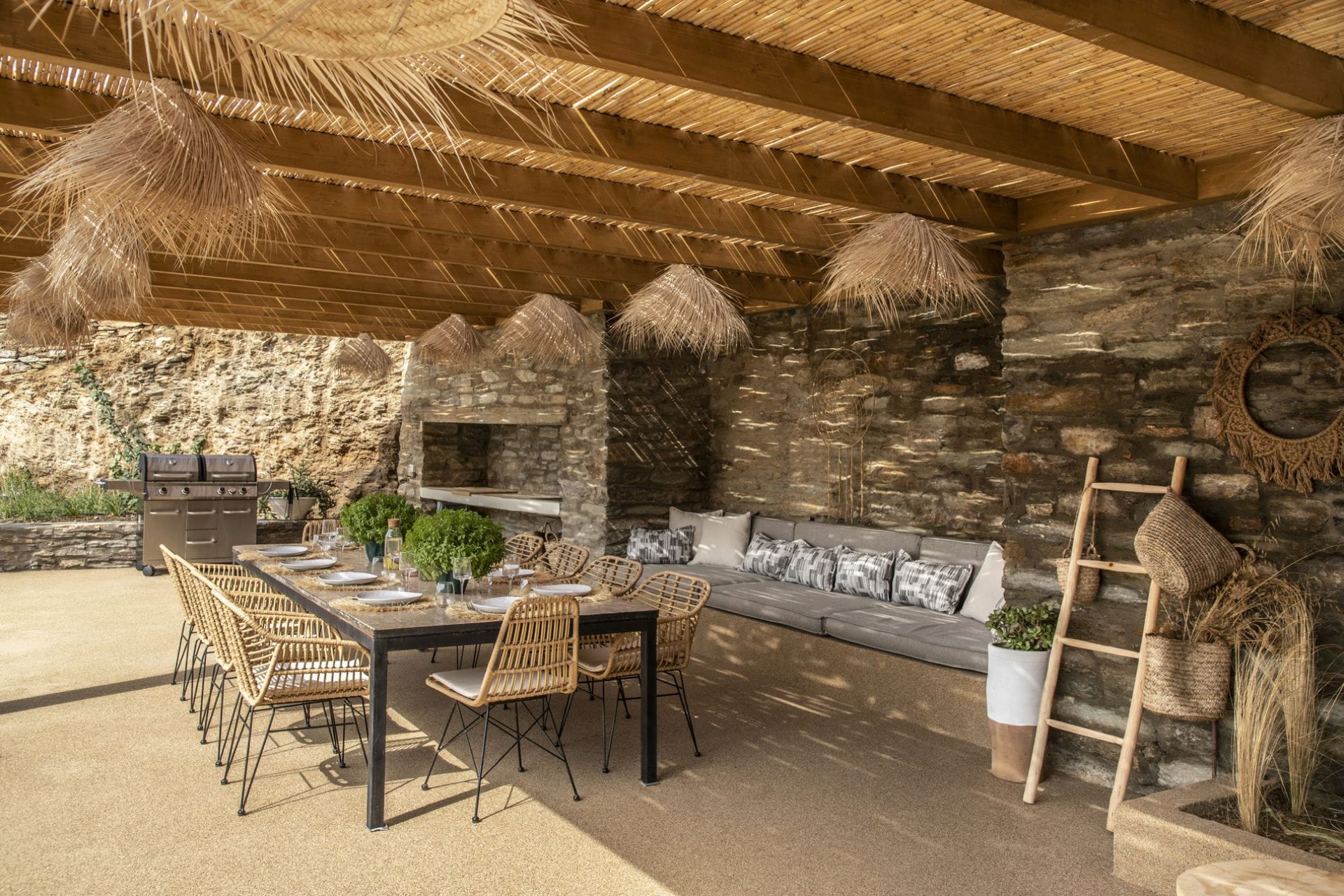 The main terrace is home to a spectacular 18-metre swimming pool lined with day beds and sun loungers. At the pool’s far end, a shaded outdoor lounge area provides the perfect place for post-dip relaxation. To the side, another shady pergola offers a dining and barbecue area. Both are adorned with bohemian-style lighting and soft furnishings, so guests can enjoy relaxed al fresco living with sensational views.