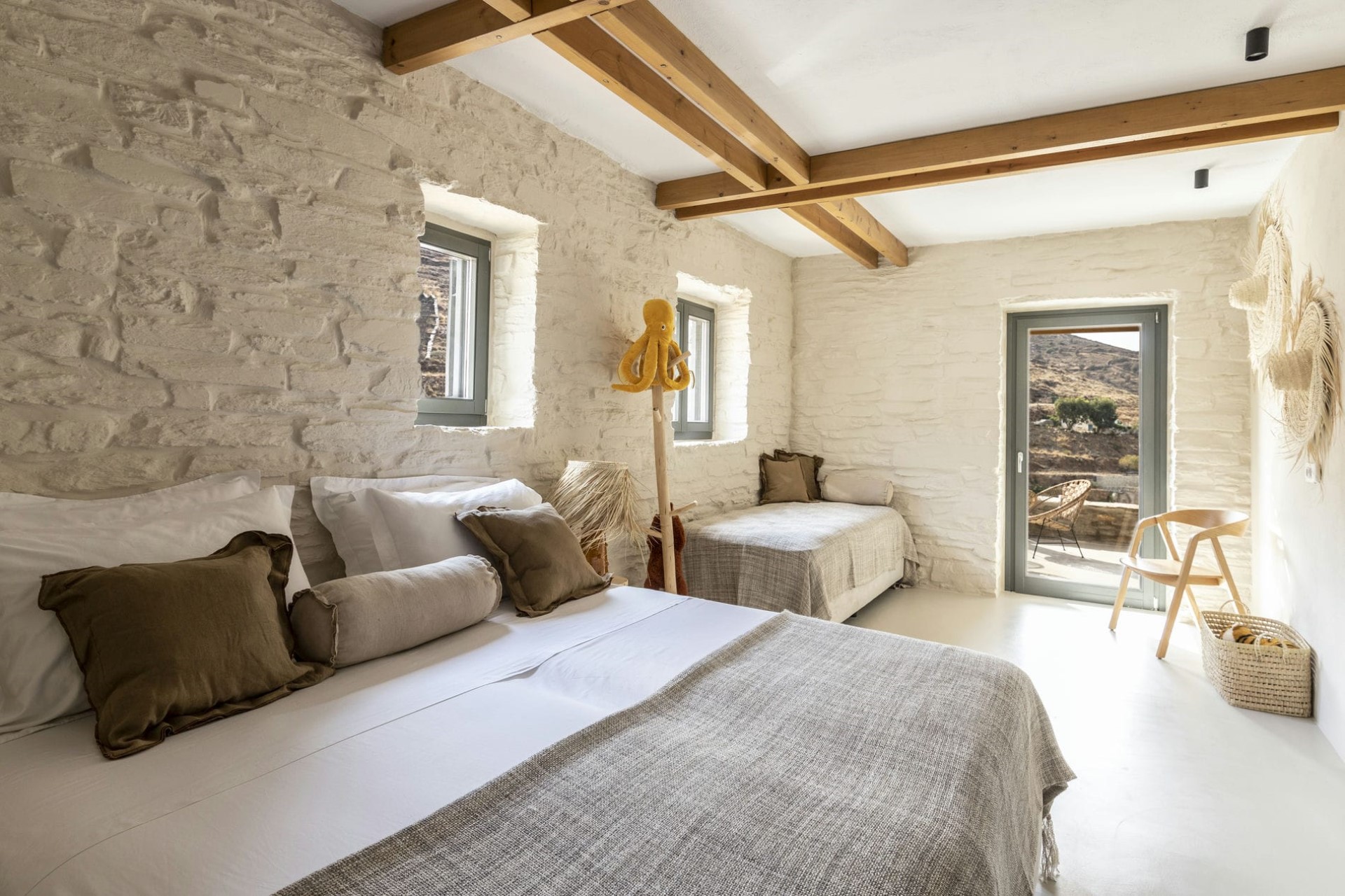 Korissia – queen-size bed (converted to twins on request), en-suite bathroom with shower + outdoor shower, and terrace access