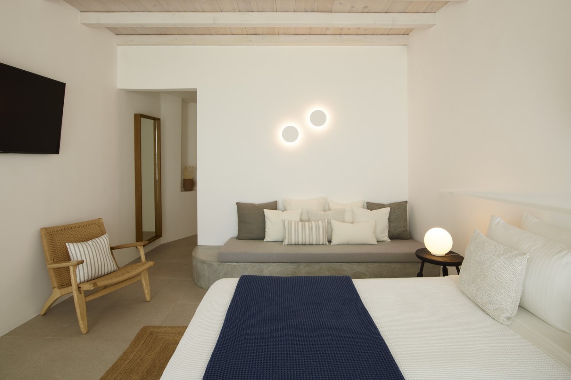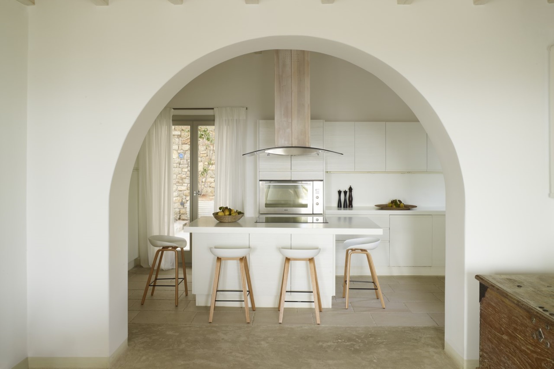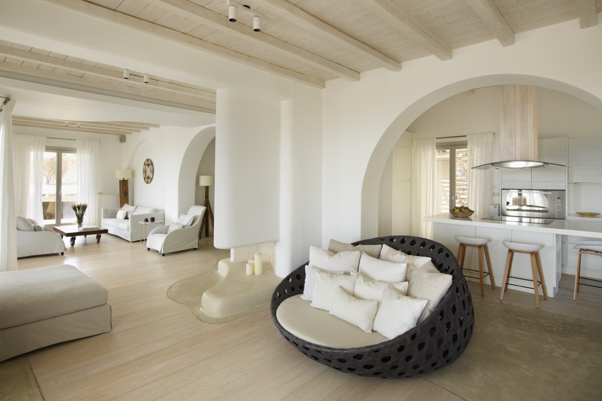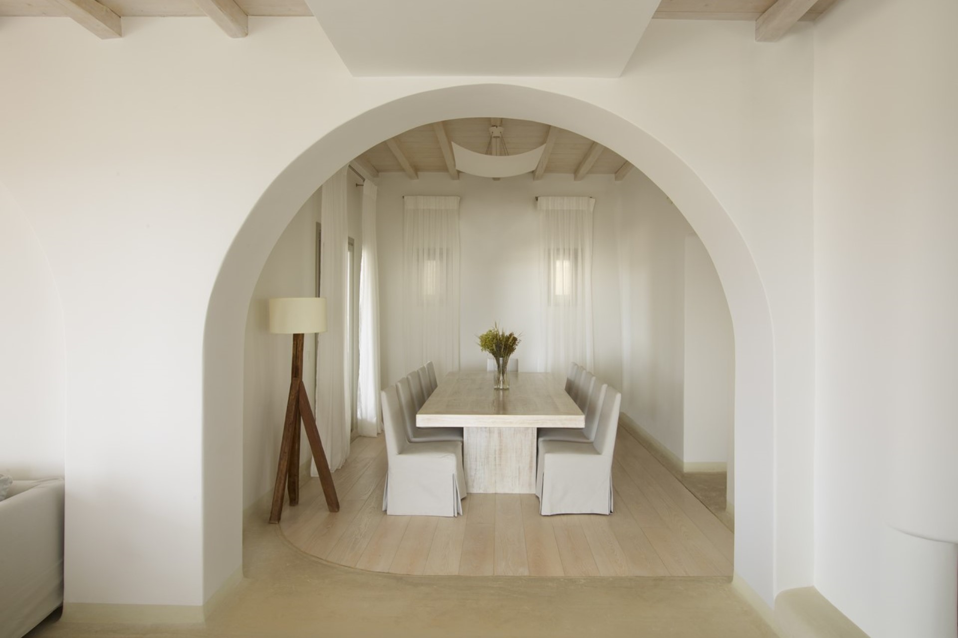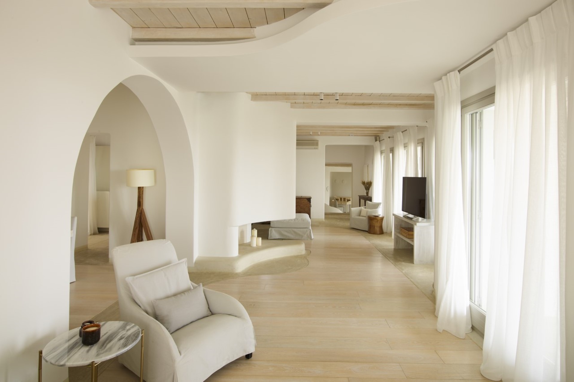This main villa makes use of the natural light adorning each room, and the minimalist style accentuates the feeling of light and space. The living area is predominantly swathed in white with curved walls and archways, as is typical of Greek architecture. Hosting contemporary furnishings and simple seating, guests can relax in the living areas, and feel the breeze from the sea through the French doors.