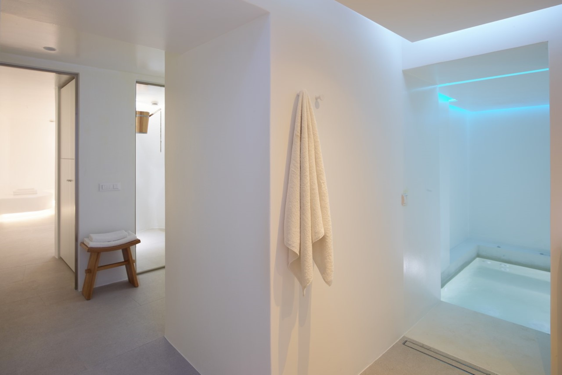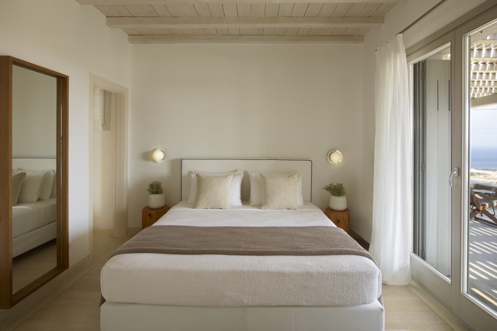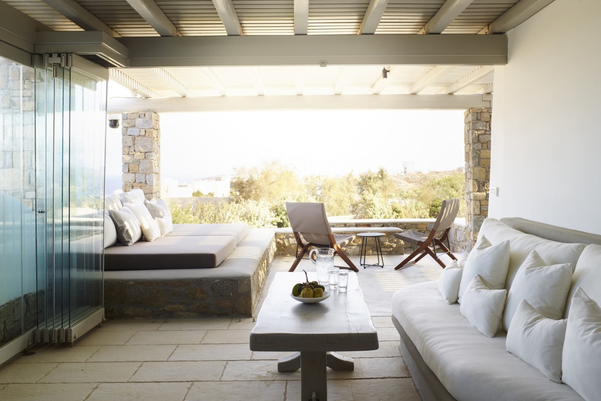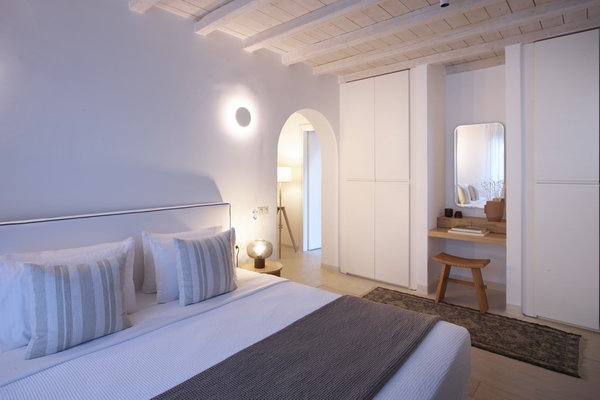 This main villa makes use of the natural light adorning each room, and the minimalist style accentuates the feeling of light and space. The living area is predominantly swathed in white with curved walls and archways, as is typical of Greek architecture. Hosting contemporary furnishings and simple seating, guests can relax in the living areas, and feel the breeze from the sea through the French doors.