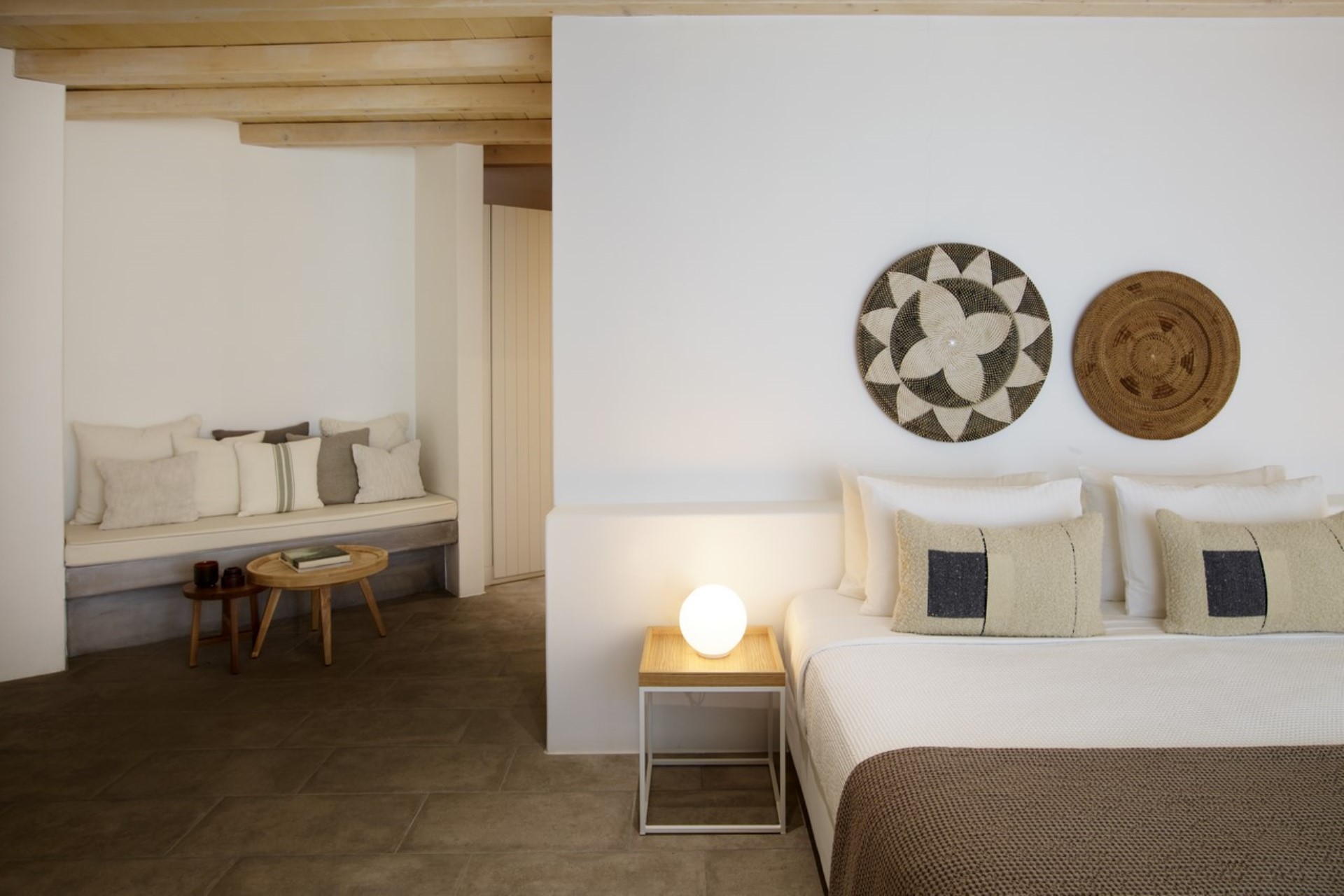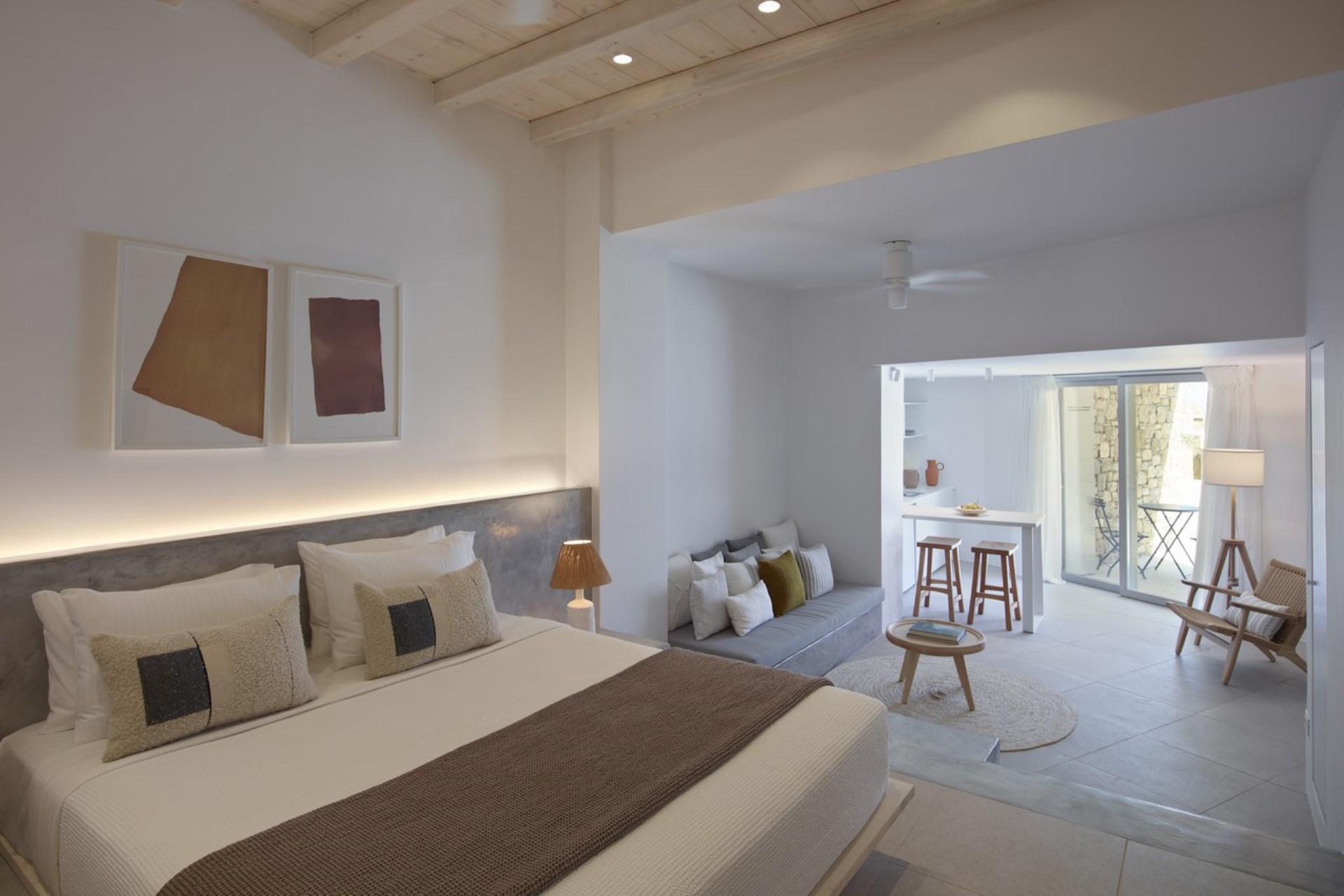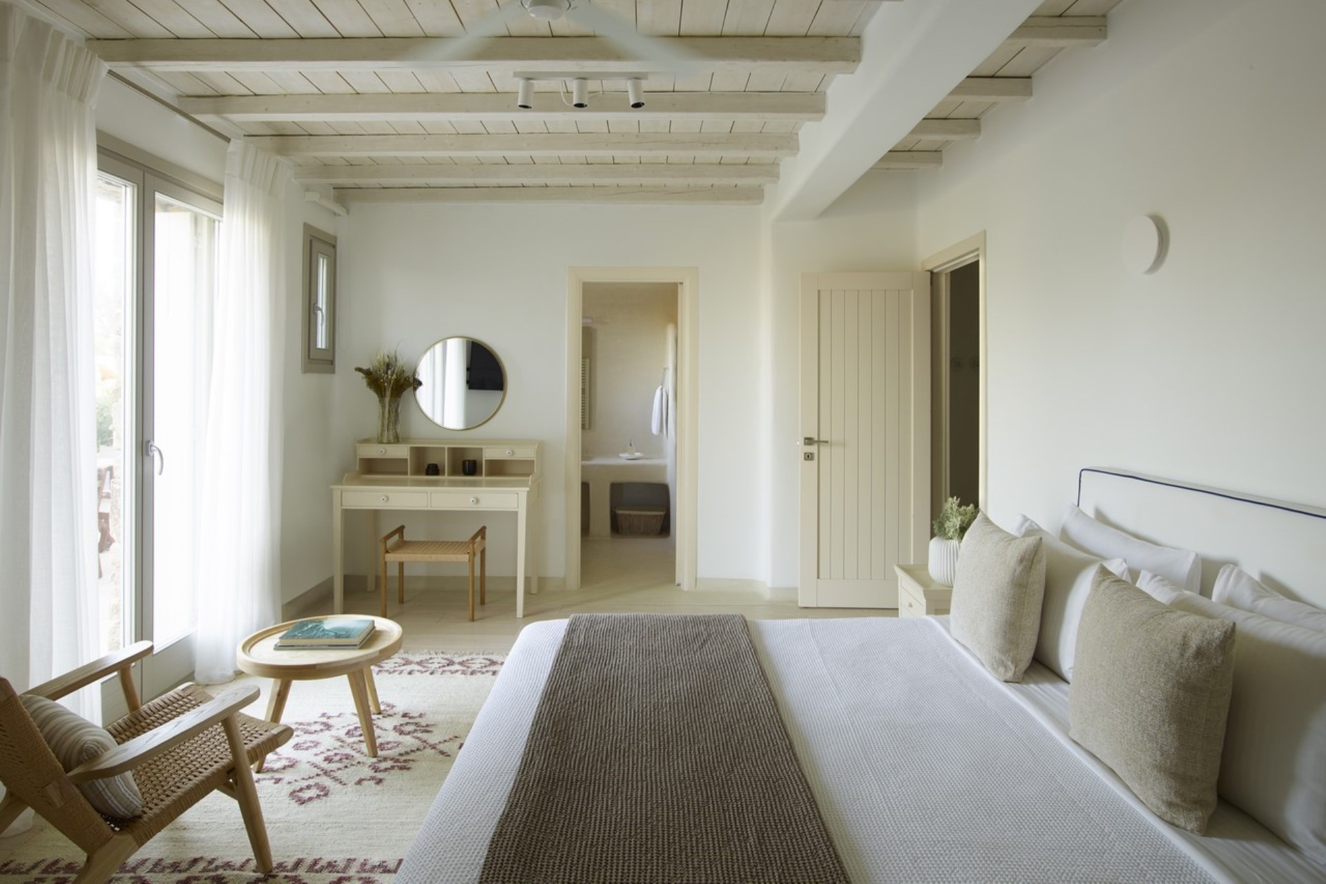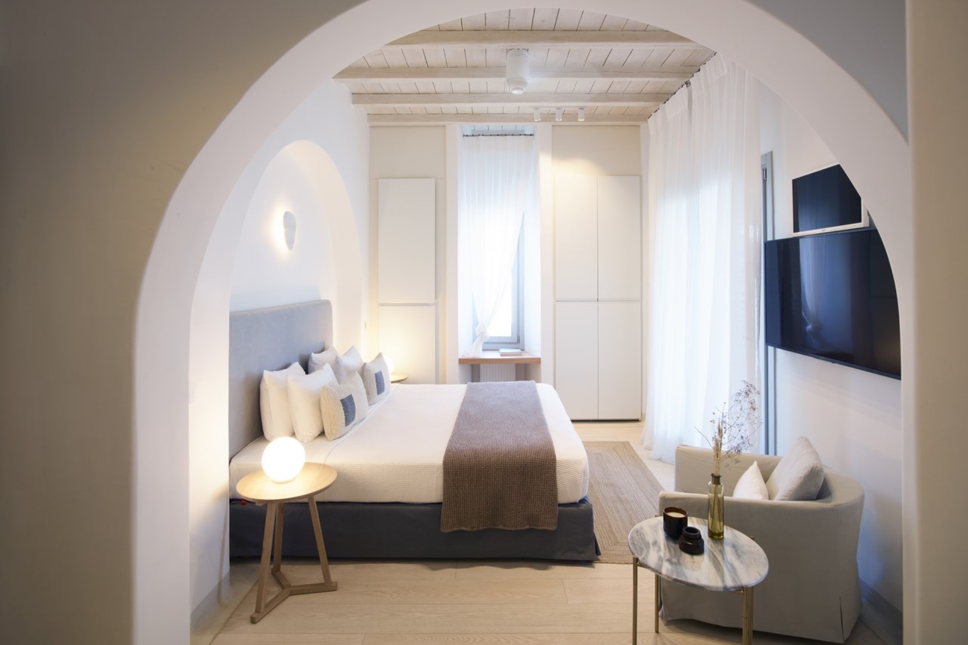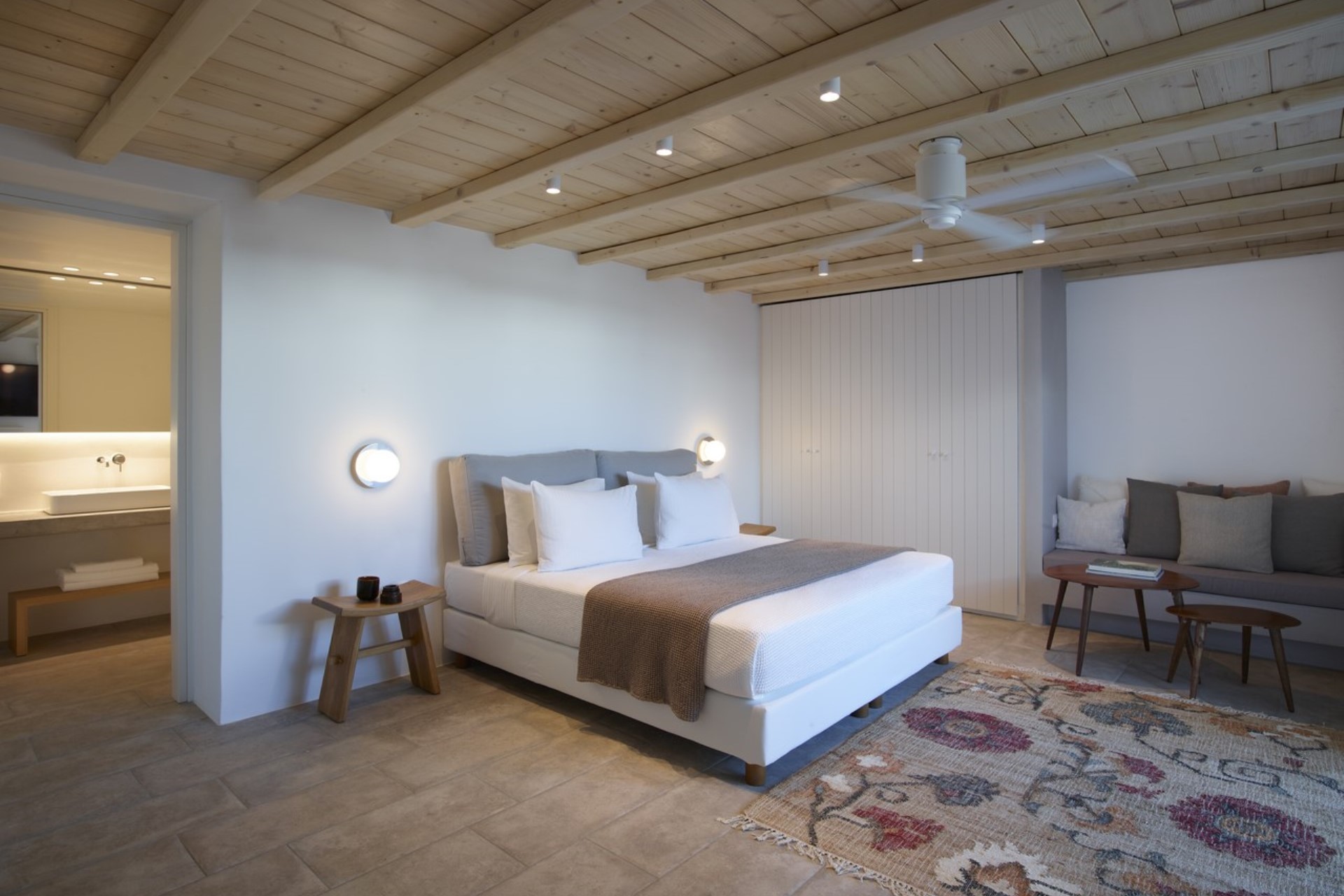 This main villa makes use of the natural light adorning each room, and the minimalist style accentuates the feeling of light and space. The living area is predominantly swathed in white with curved walls and archways, as is typical of Greek architecture. Hosting contemporary furnishings and simple seating, guests can relax in the living areas, and feel the breeze from the sea through the French doors.