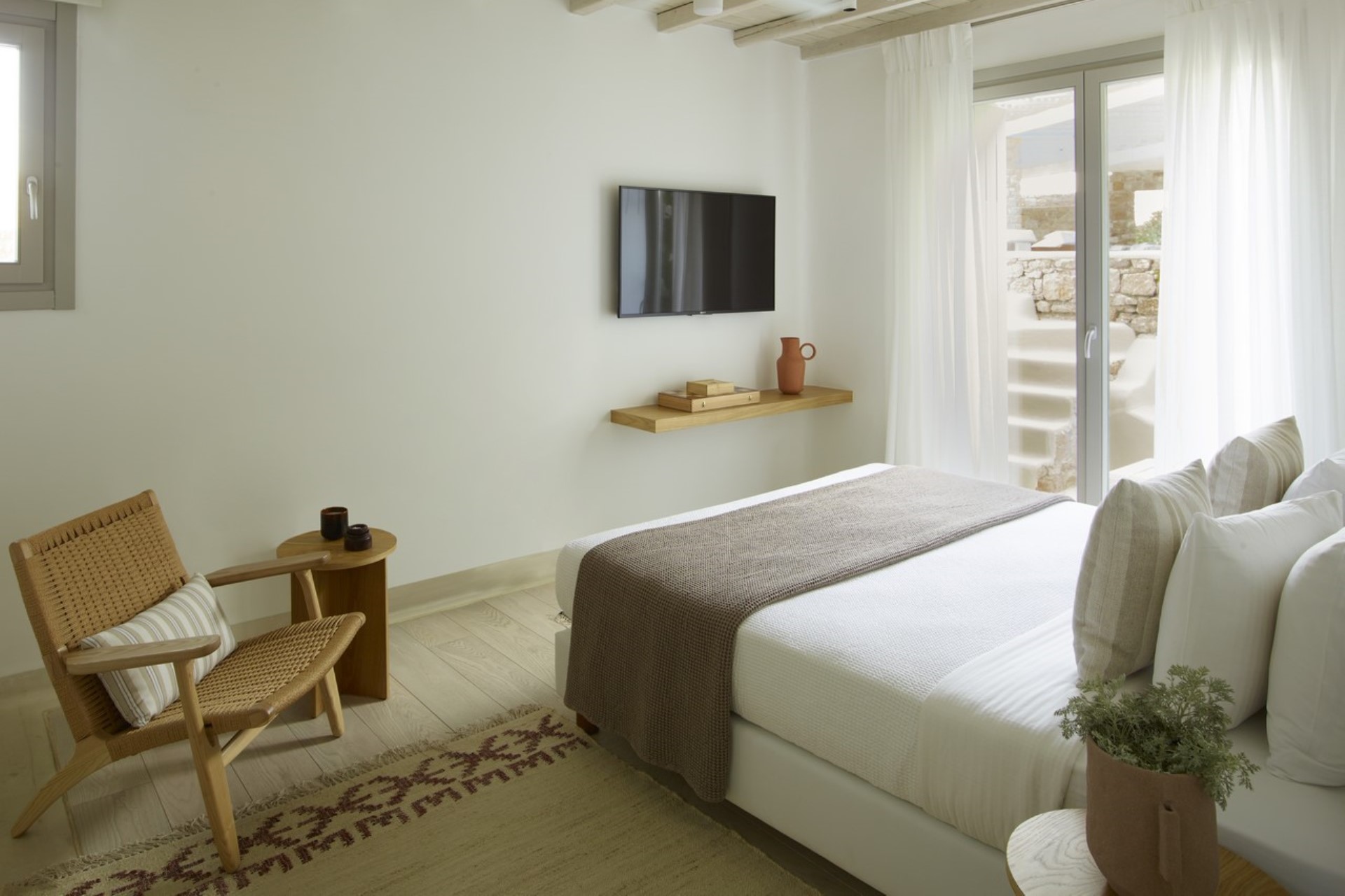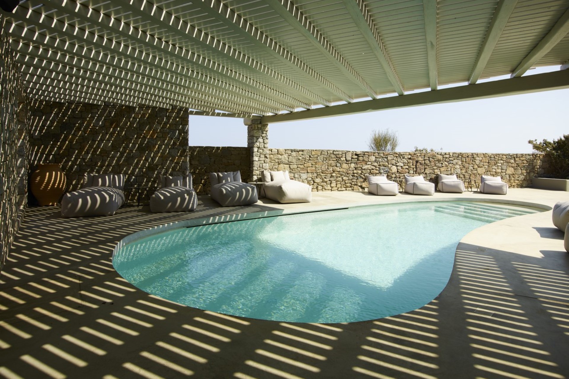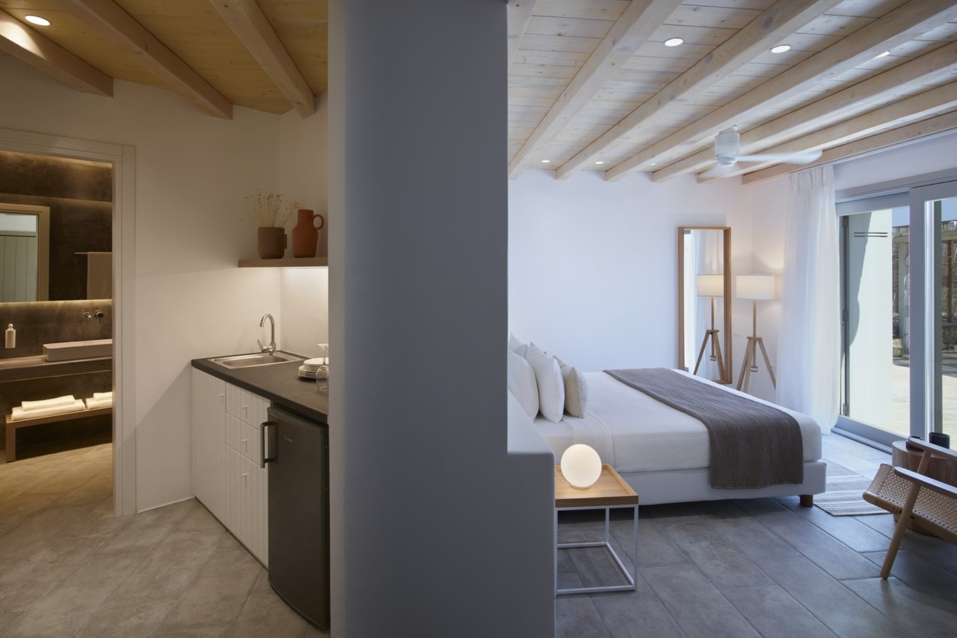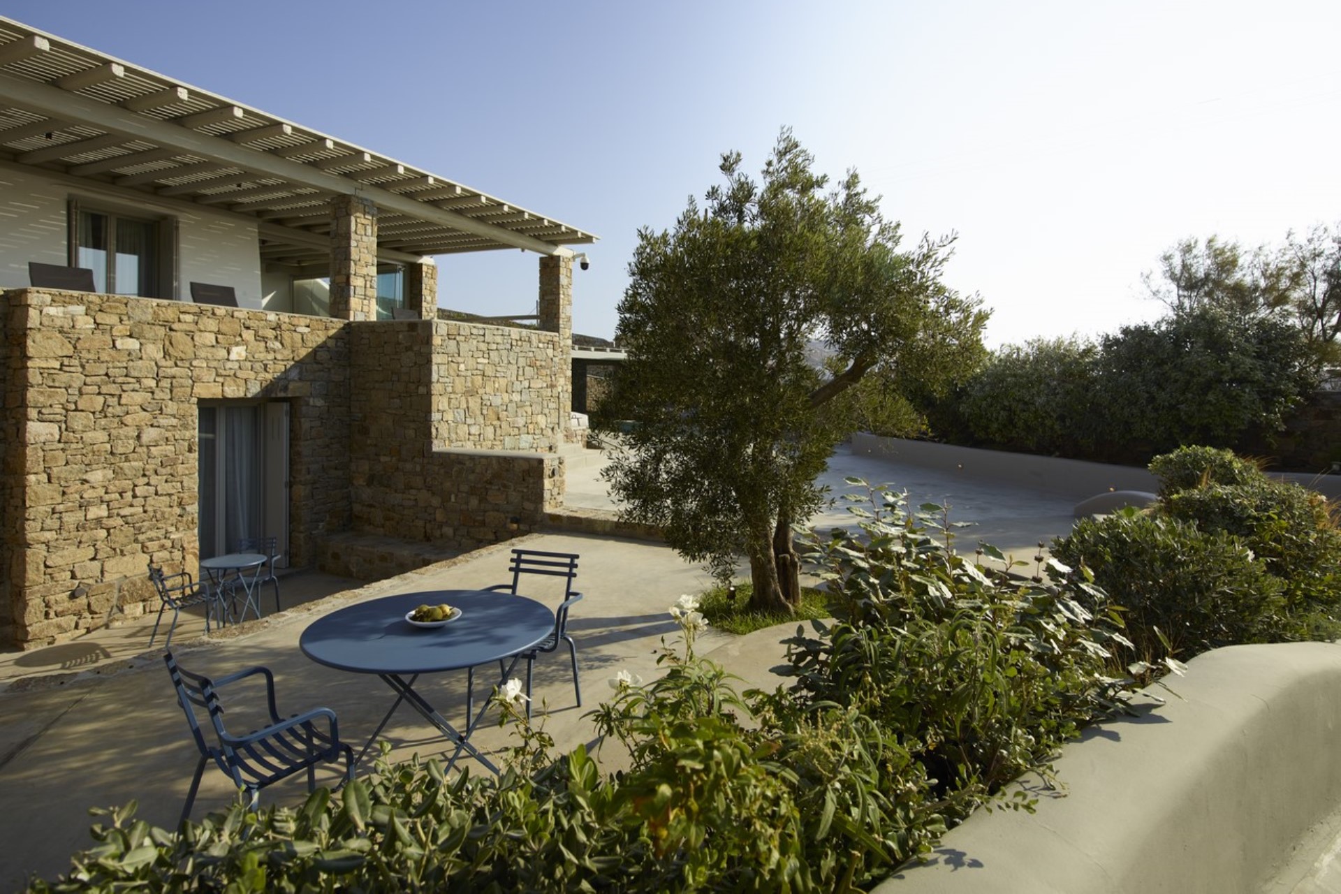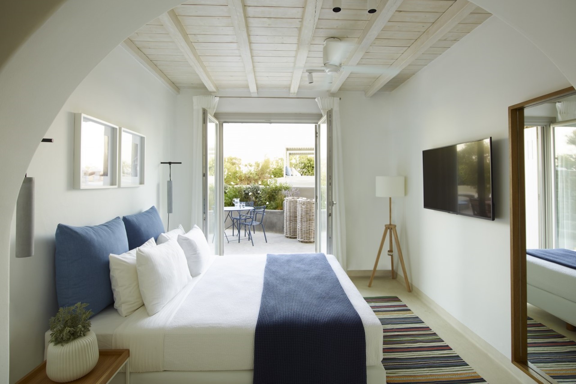 This main villa makes use of the natural light adorning each room, and the minimalist style accentuates the feeling of light and space. The living area is predominantly swathed in white with curved walls and archways, as is typical of Greek architecture. Hosting contemporary furnishings and simple seating, guests can relax in the living areas, and feel the breeze from the sea through the French doors.