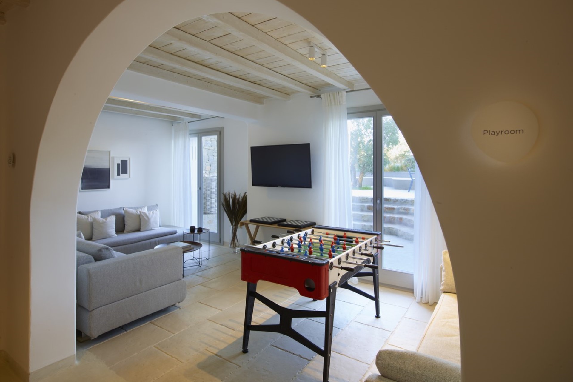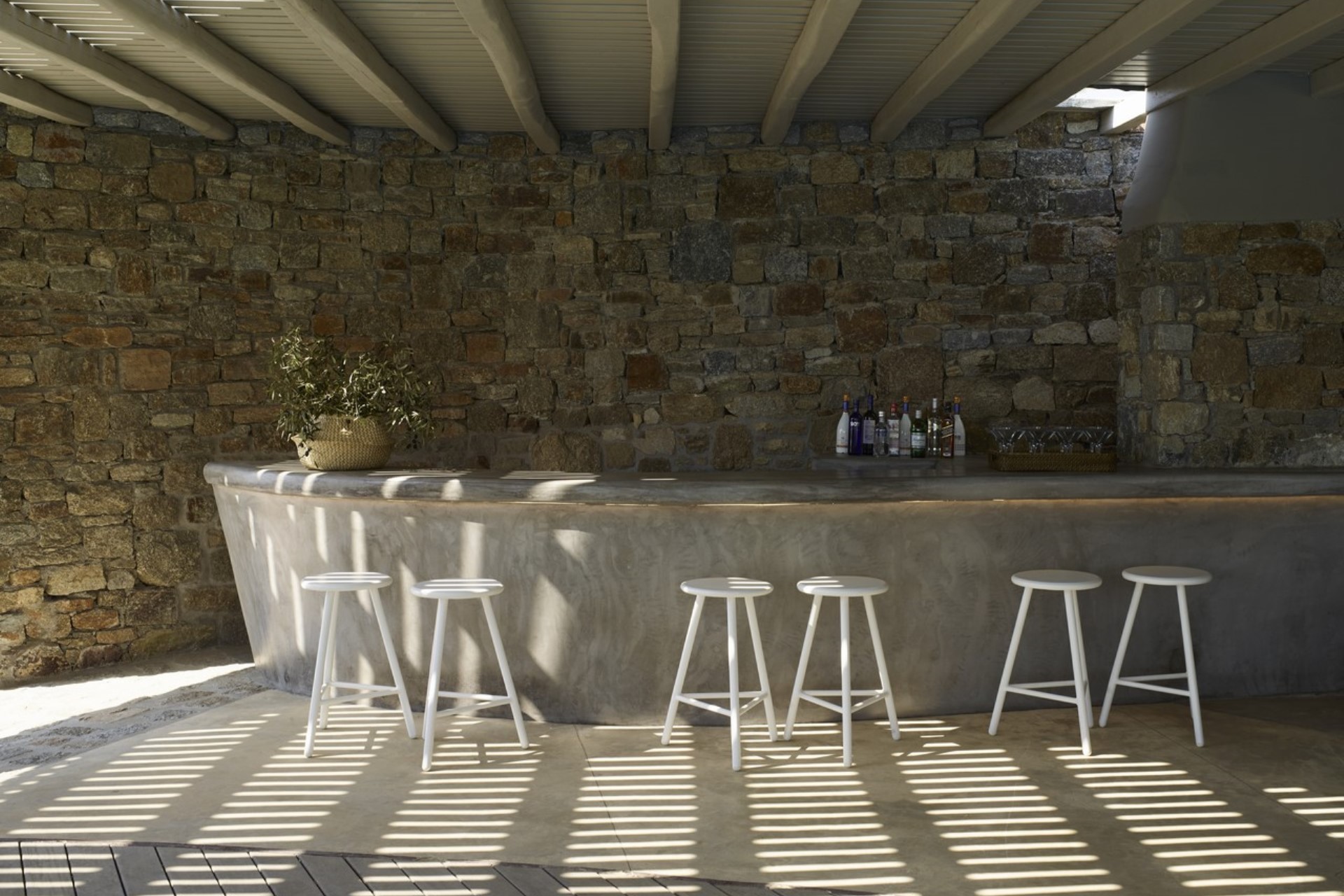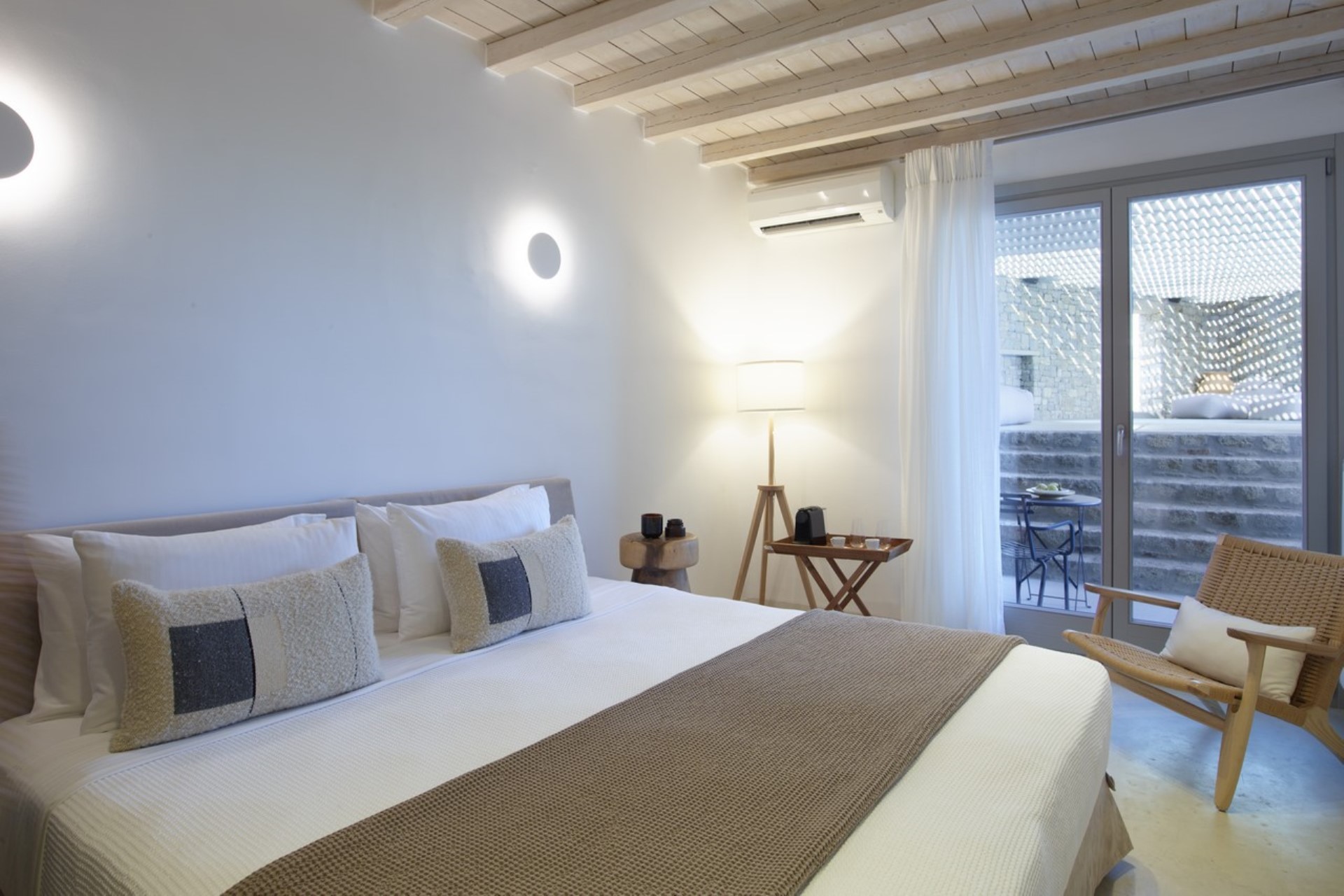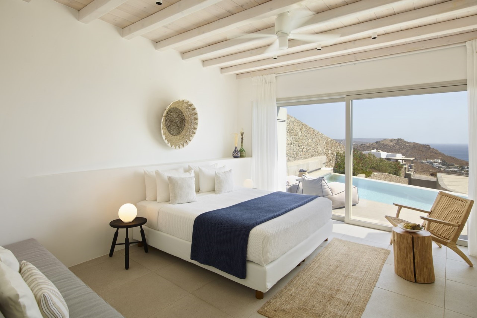 This main villa makes use of the natural light adorning each room, and the minimalist style accentuates the feeling of light and space. The living area is predominantly swathed in white with curved walls and archways, as is typical of Greek architecture. Hosting contemporary furnishings and simple seating, guests can relax in the living areas, and feel the breeze from the sea through the French doors.