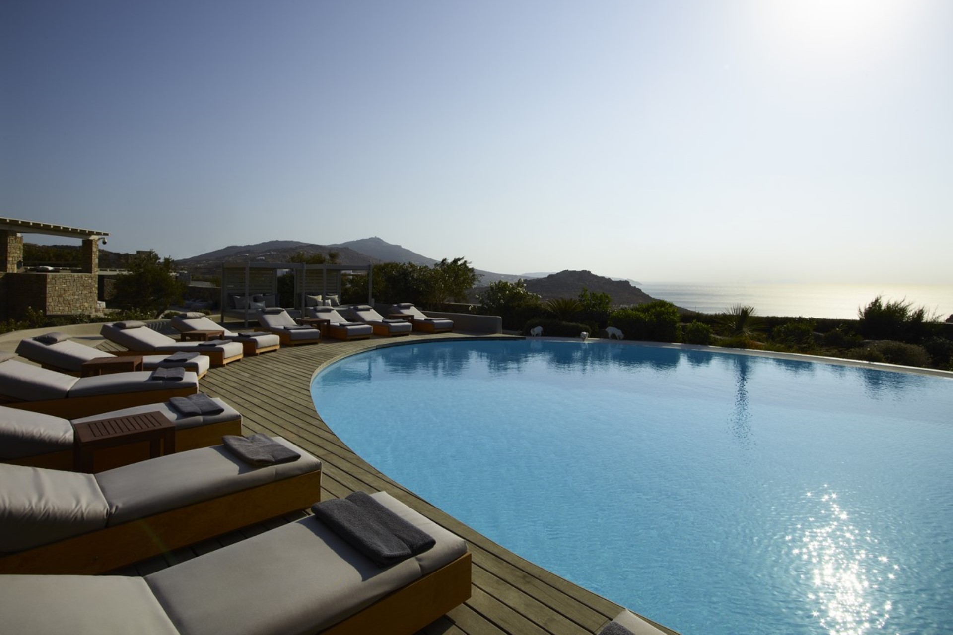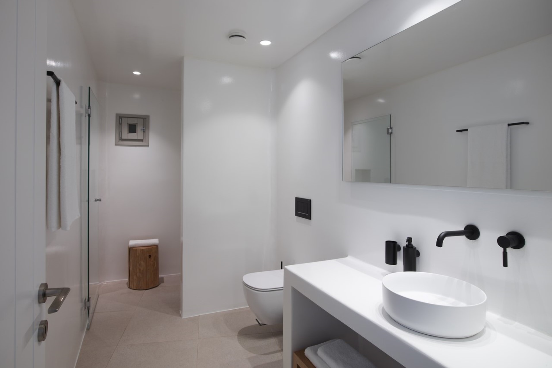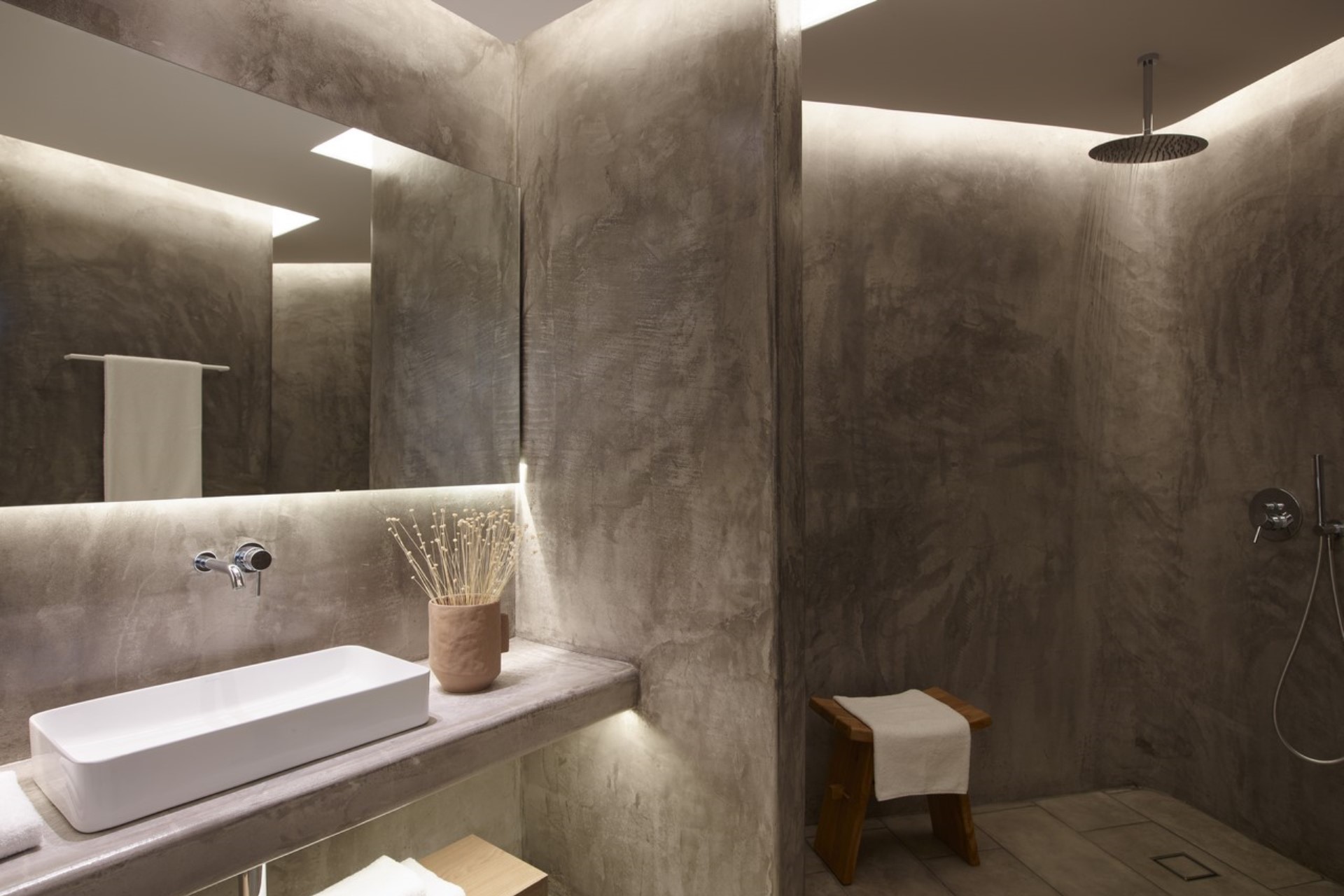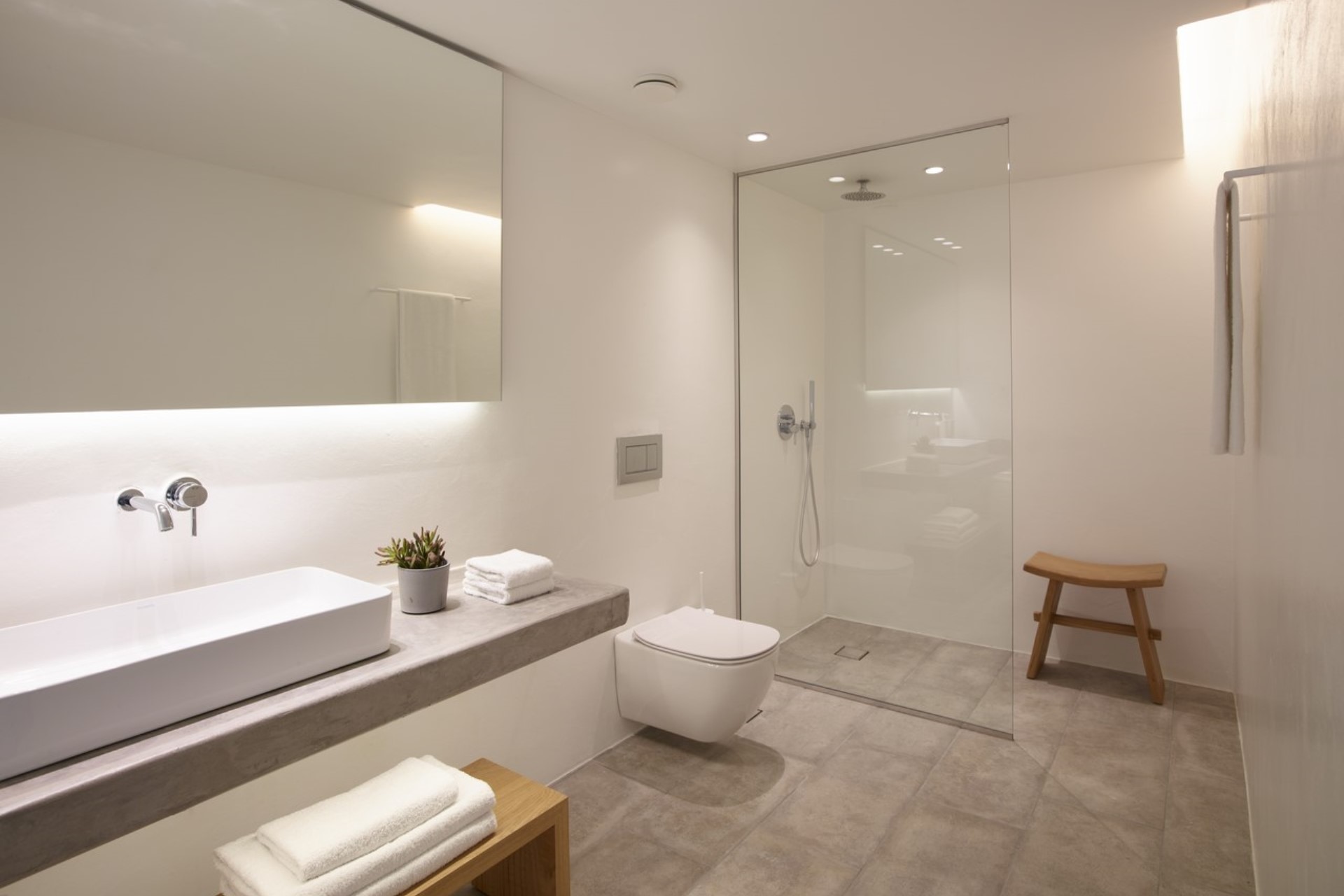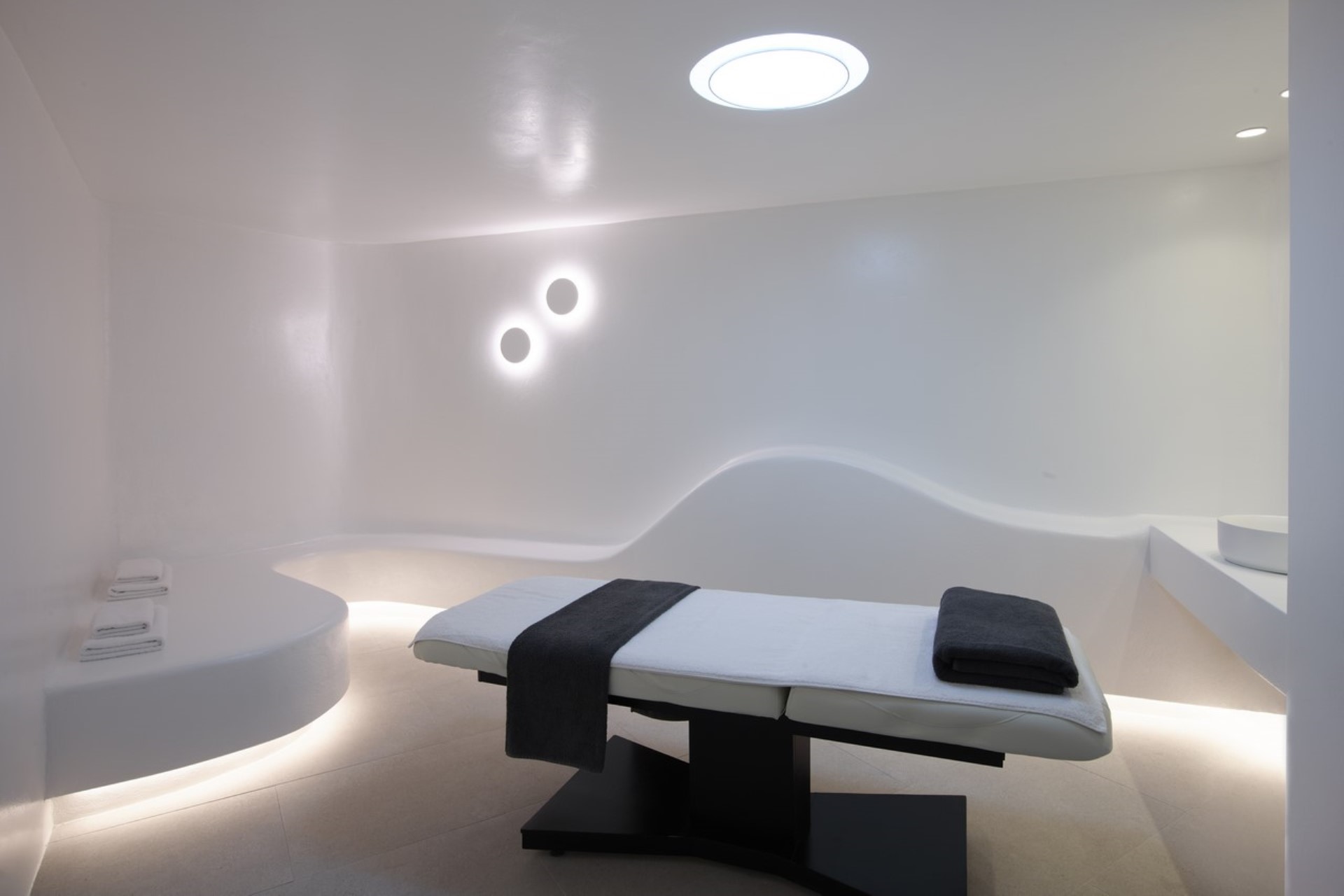 This main villa makes use of the natural light adorning each room, and the minimalist style accentuates the feeling of light and space. The living area is predominantly swathed in white with curved walls and archways, as is typical of Greek architecture. Hosting contemporary furnishings and simple seating, guests can relax in the living areas, and feel the breeze from the sea through the French doors.