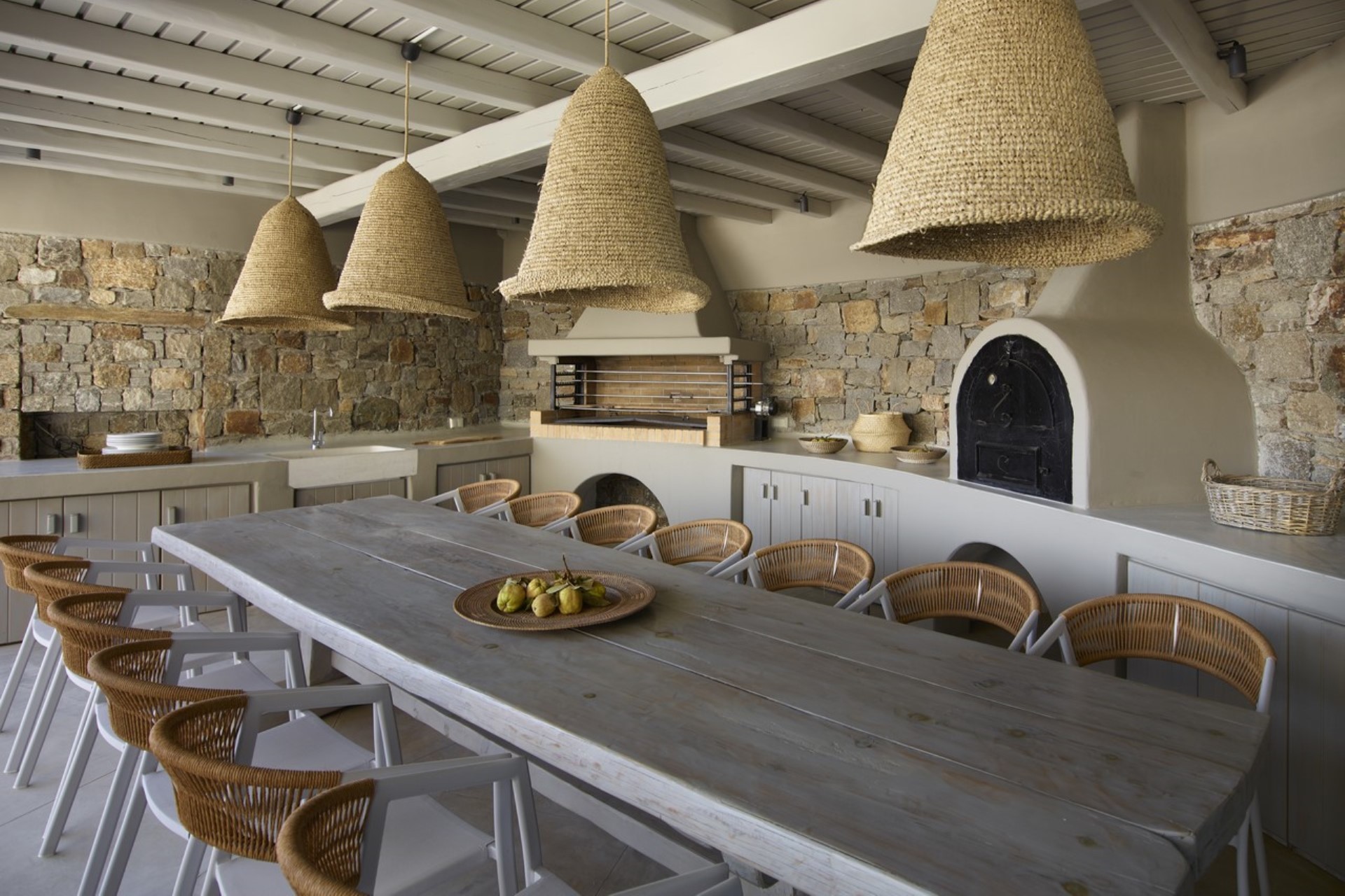 There are three infinity swimming pools of varying sizes, surrounded by sun loungers and cabanas. A large hammock on the terrace exudes relaxation and a restful ambience, in keeping with the rest of the villa. Perfect for al fresco dining is the outdoor kitchen with barbecue and wood fire oven.