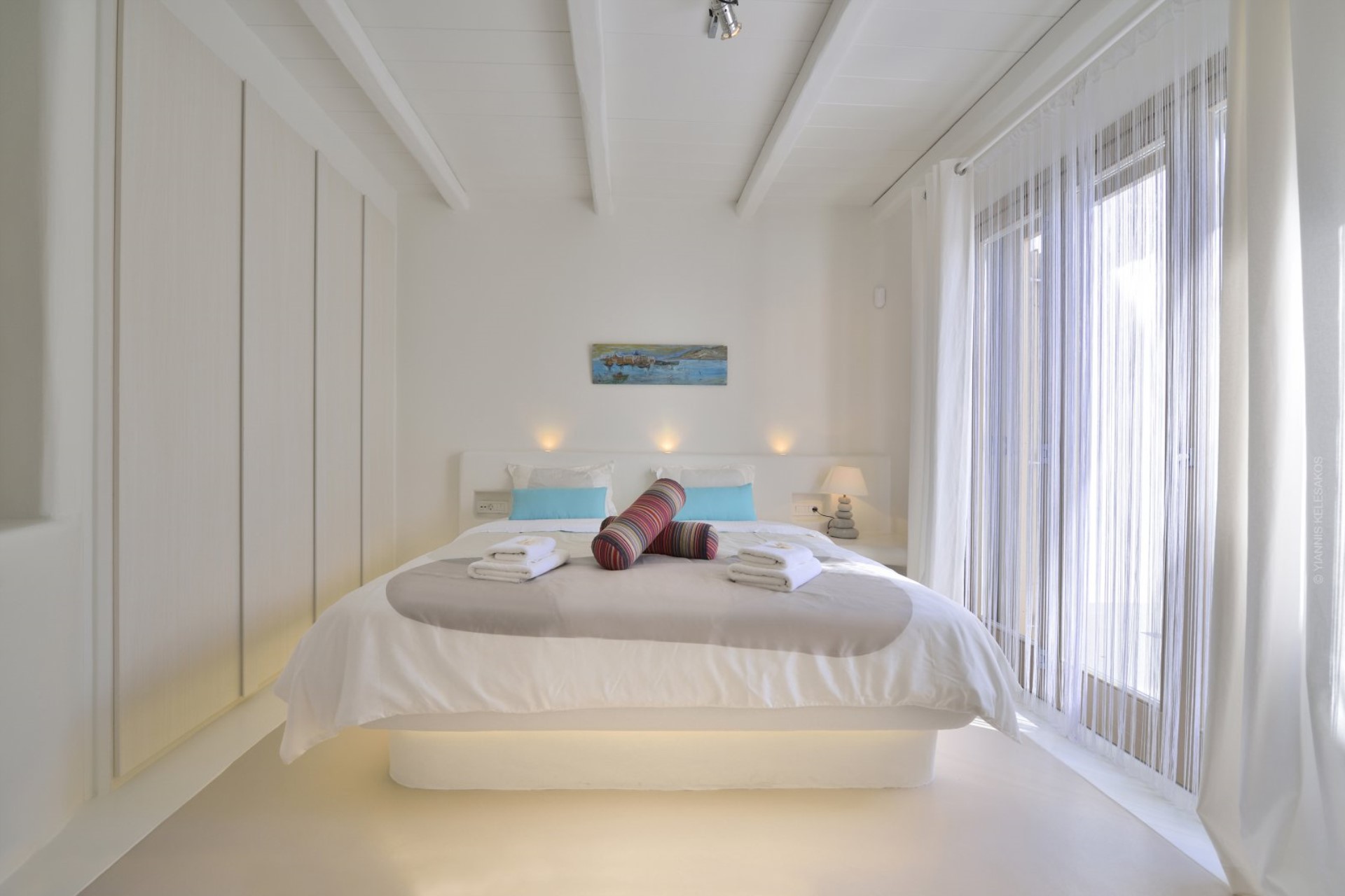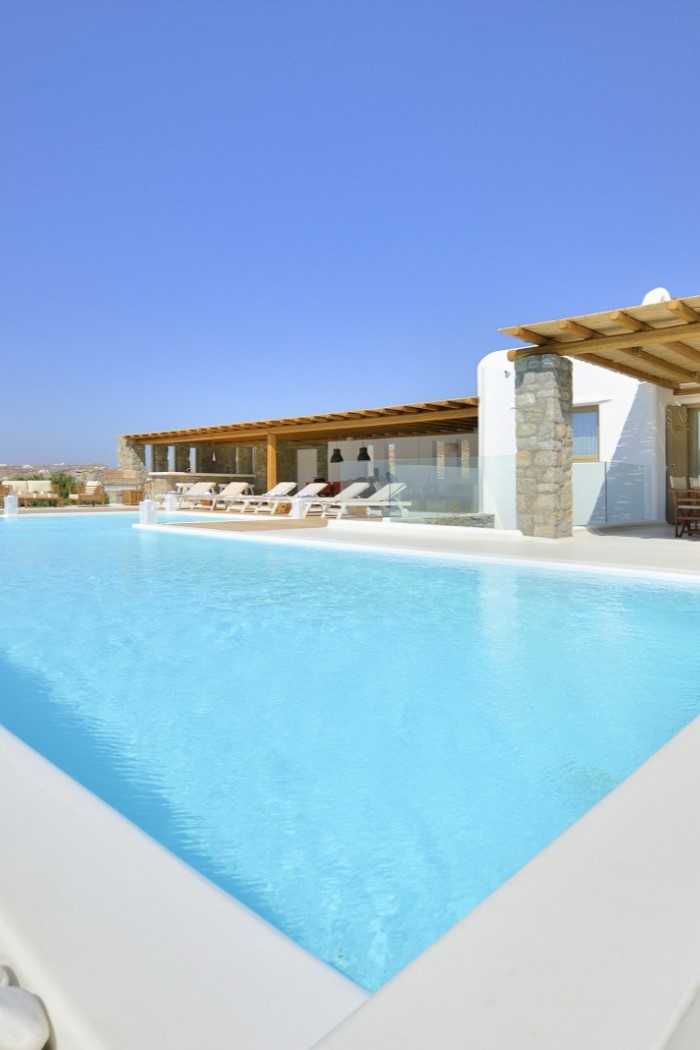 Perched on a hillside, Villa Gravity offers one of the most beautiful sights from the island of Mykonos. It opens up to a panoramic view of the mesmerizing deep blue water of the Aegean Sea and the two Cyclades islands of Naxos and Paros can be spotted from afar.