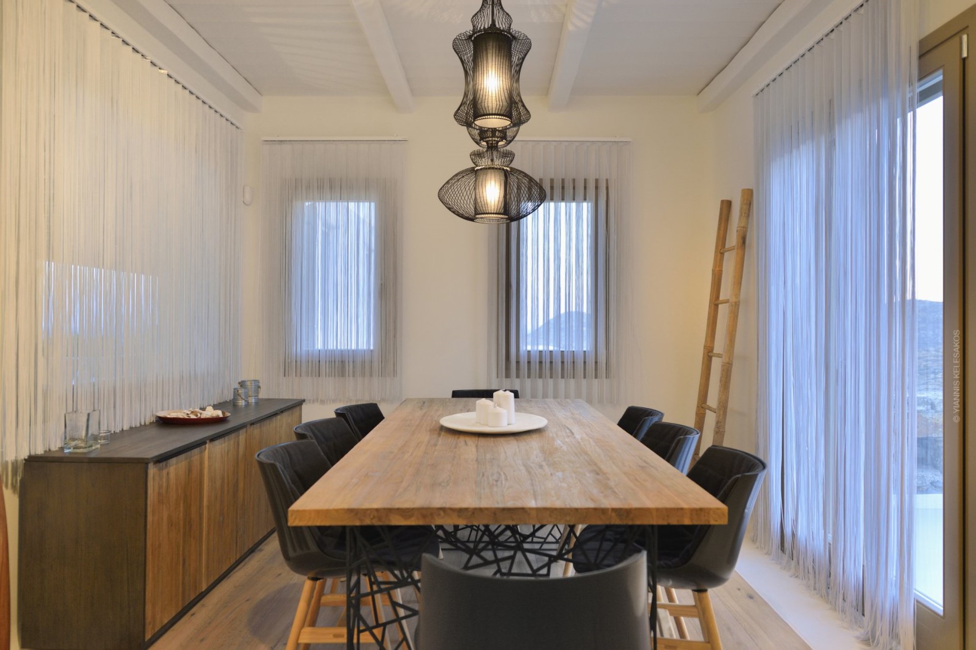 Villa Gravity is surrounded by an extensive manicured garden and features very spacious terraces and a sun deck on the side of the large swimming pool. While refreshing in the pool and soaking up some Greek sun, the guests can marvel at the fantastic sea views. The comfort and luxury provided by the villa and its surroundings will ensure that the guests will feel a great sense of relaxation and wellness. Moreover, to fully enjoy the great weather in Mykonos and have a splurge while taking in these breathtaking scenic views, guests can enjoy great dining experiences at the outdoor dining table or unwind on the comfy large couches on the side of the pool. After getting enough sun and refreshment outside, it is also possible to retreat into the modern and serene interior space where the ample living and dining areas are found.