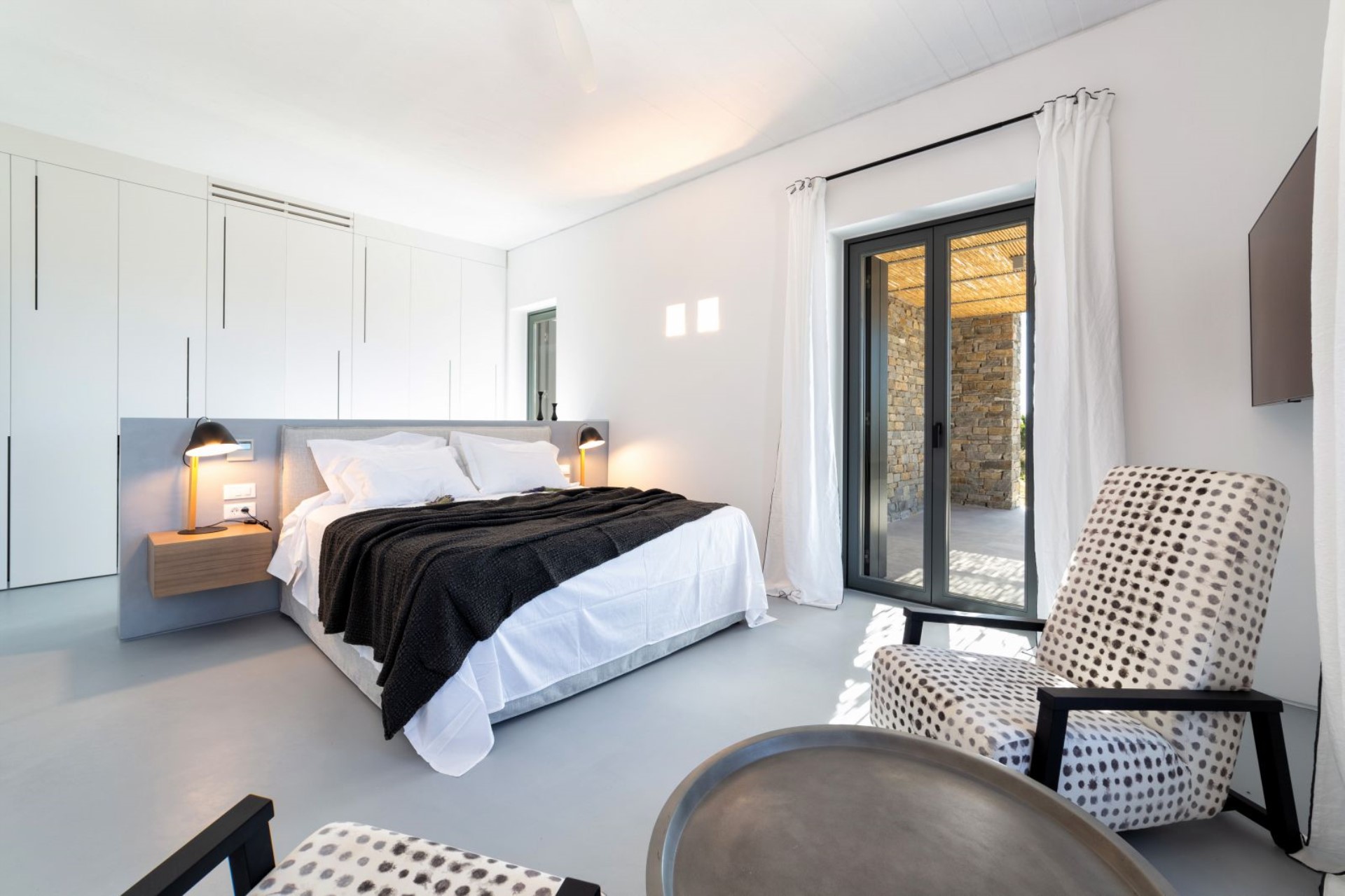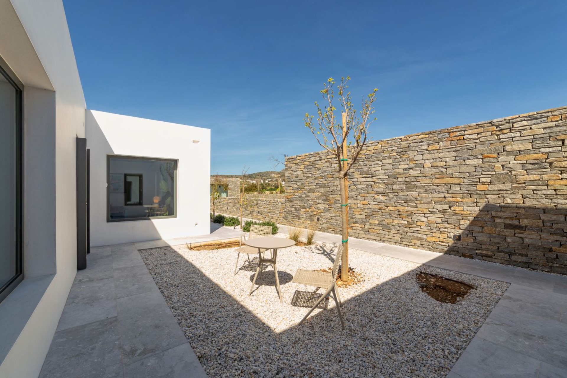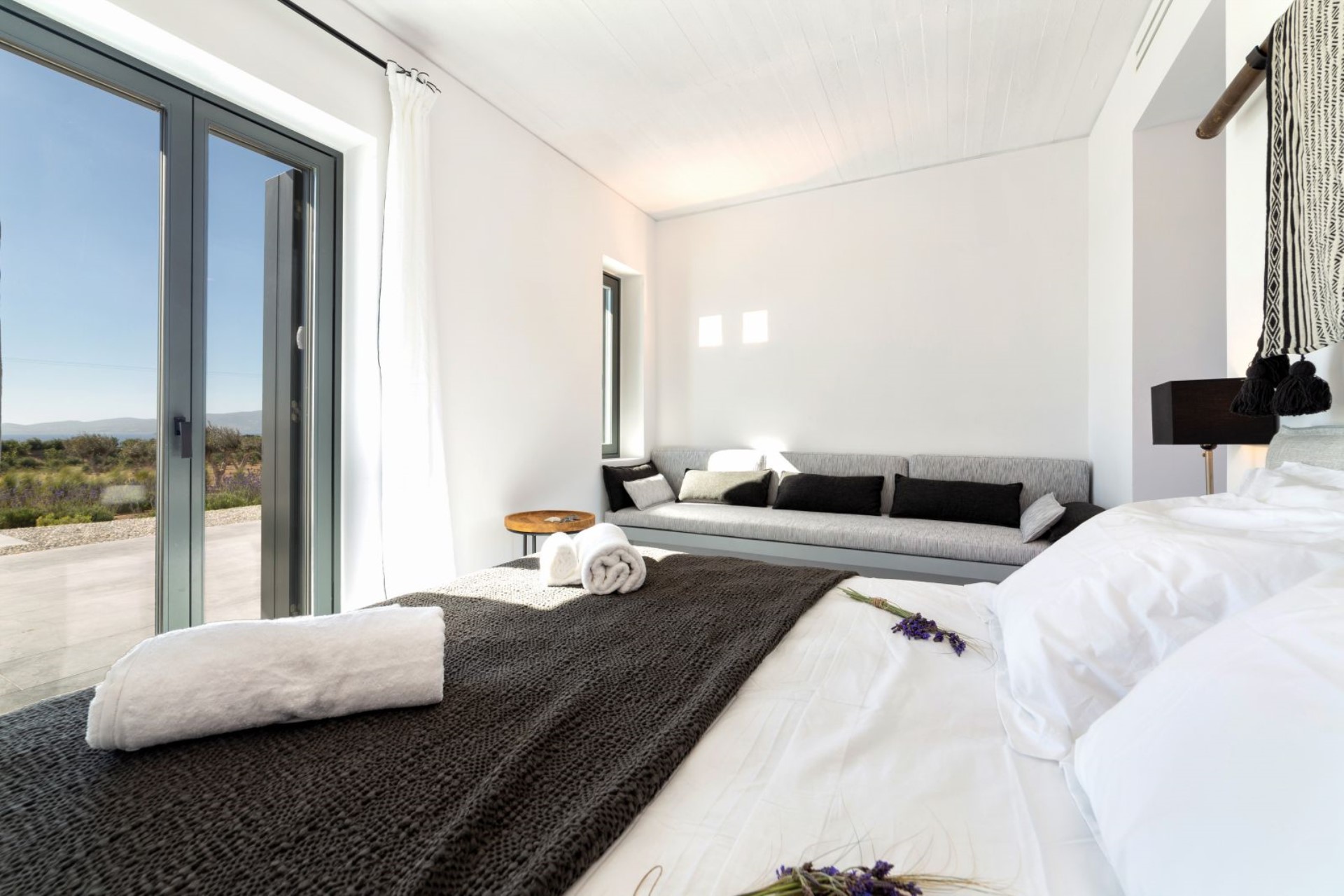 With sea views in front and lush hillside behind, Villa Iris in Paros is surrounded by stunning nature. Further enhancing the natural feel, the beautifully-landscaped garden – which was inspired by artist Paul Klee’s paintings – is filled with and array of native Cycladic and Greek flowers, bushes, and trees.