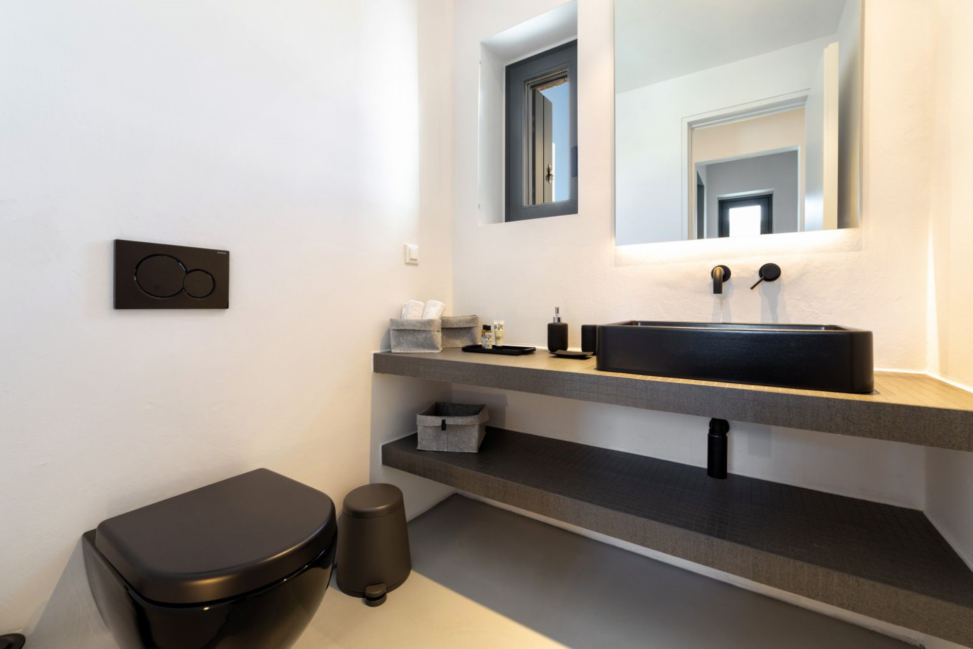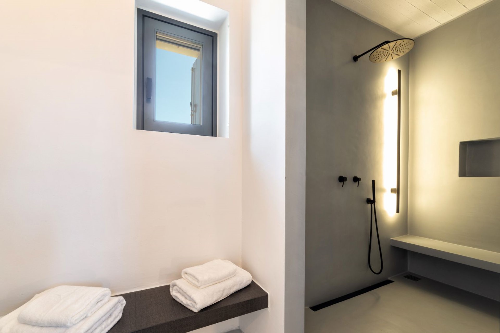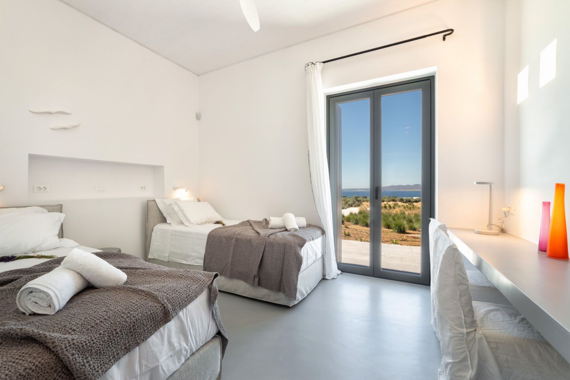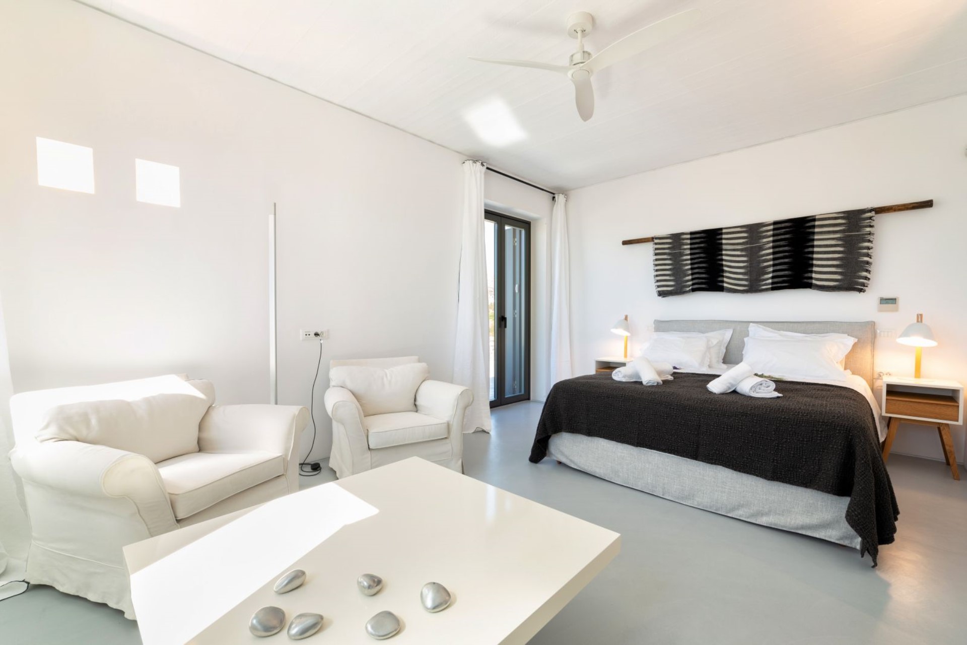 With sea views in front and lush hillside behind, Villa Iris in Paros is surrounded by stunning nature. Further enhancing the natural feel, the beautifully-landscaped garden – which was inspired by artist Paul Klee’s paintings – is filled with and array of native Cycladic and Greek flowers, bushes, and trees.