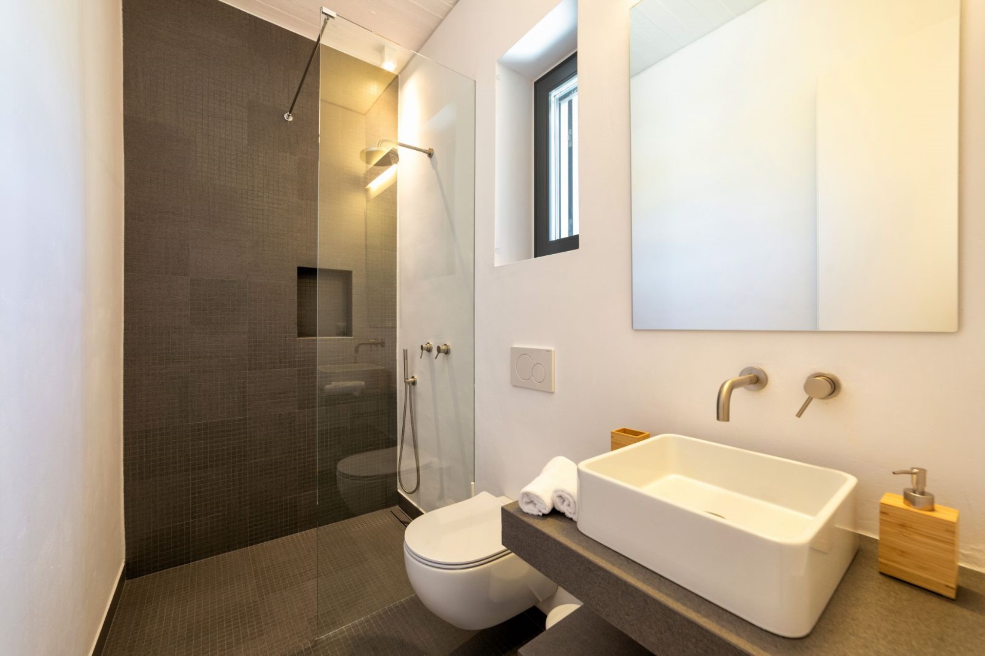 Three bedrooms are accessed via the villa’s interior, including two twin rooms and the master bedroom which features a dressing room, sitting area, large shower and two separate WCs. The other three bedrooms have external access including two interconnecting rooms on the ground floor (one twin and one king-size), and a large bedroom with private patio on the first floor. Each bedroom boasts en-suite or private facilities along with terrace or patio access, and all twin beds can be converted to a king-size bed on request, allowing flexibility for different group compositions.