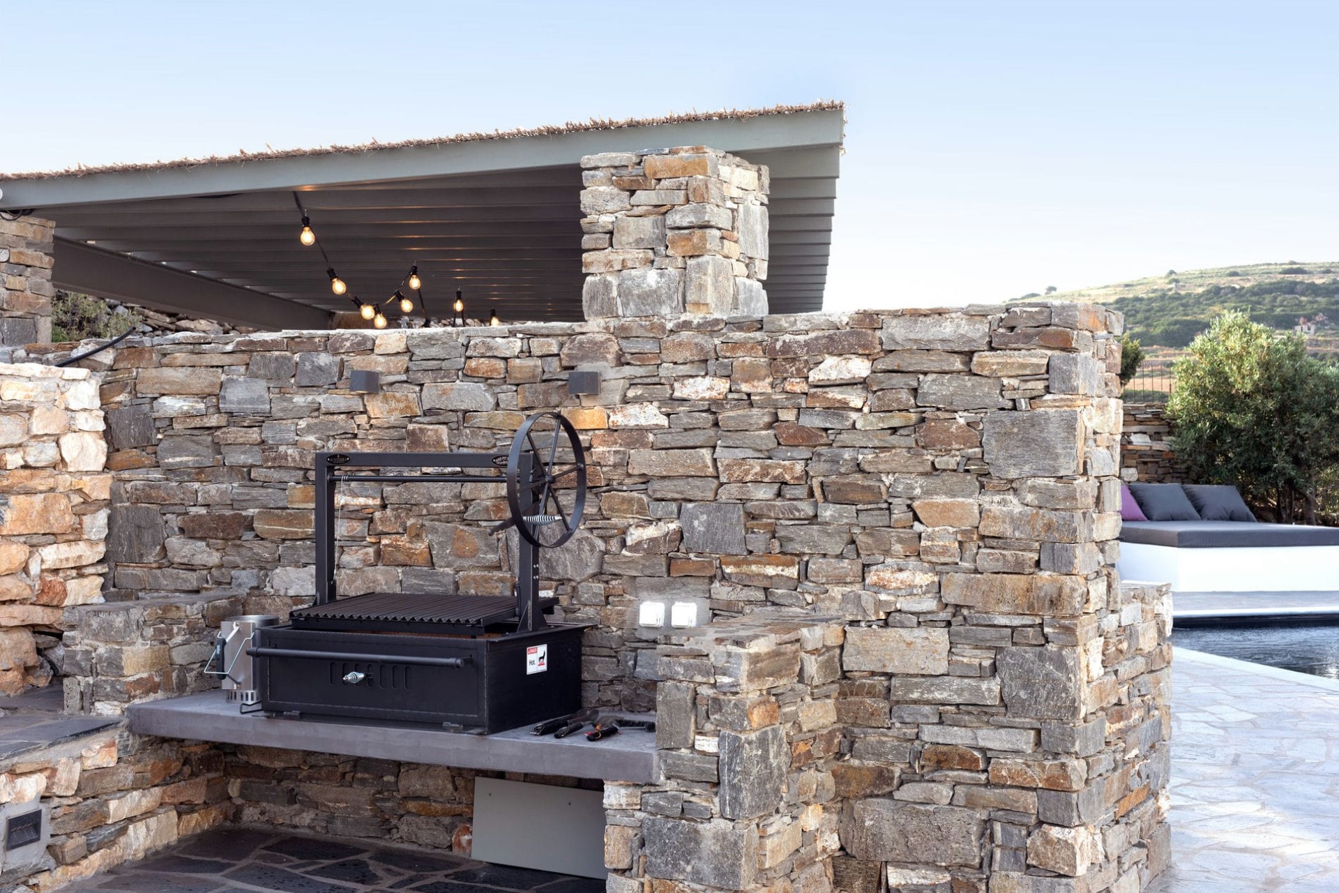 A striking infinity pool, an impressive 20 metres in length, extends over the landscape, offering a luxurious spot for a refreshing dip with a view! Adjacent to the pool, the main terrace provides ample space for al fresco living, complete with sun loungers, bar seating, and a shaded outdoor kitchen and dining area featuring a Santa Maria barbecue.