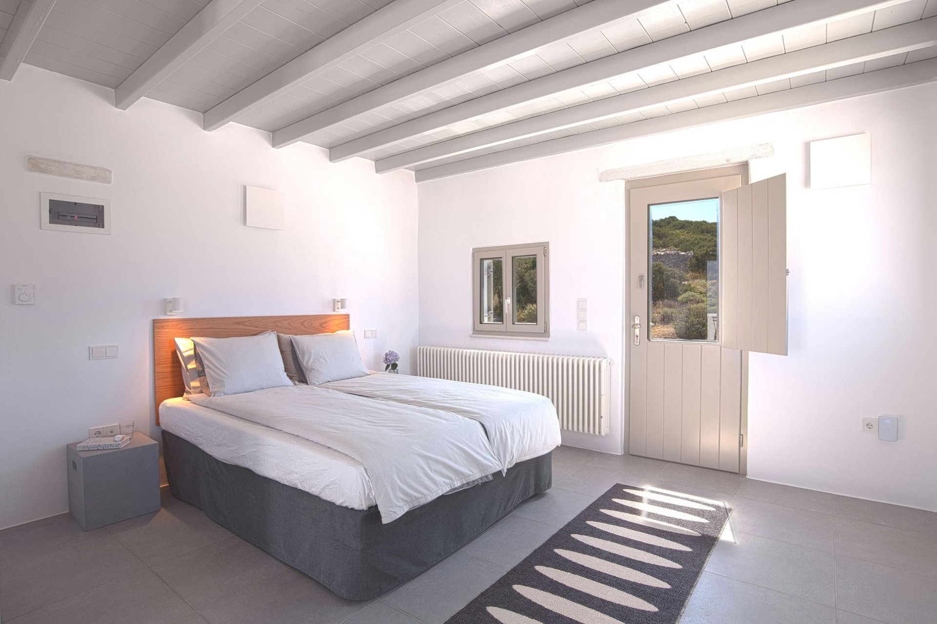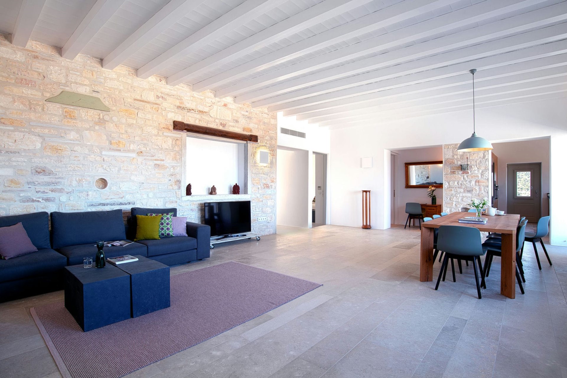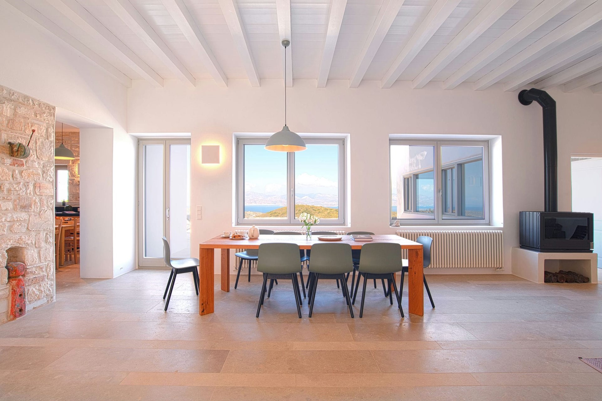 An open-plan living and dining room welcomes guests with chic, contemporary furniture perfectly blended with unique antiques and design pieces dotted throughout. Large windows flood the room with light and offer panoramic views down to the sea and the neighbouring island of Naxos. Moreover, a feature fireplace heats the room in the cooler months, meaning the villa can be enjoyed year-round.