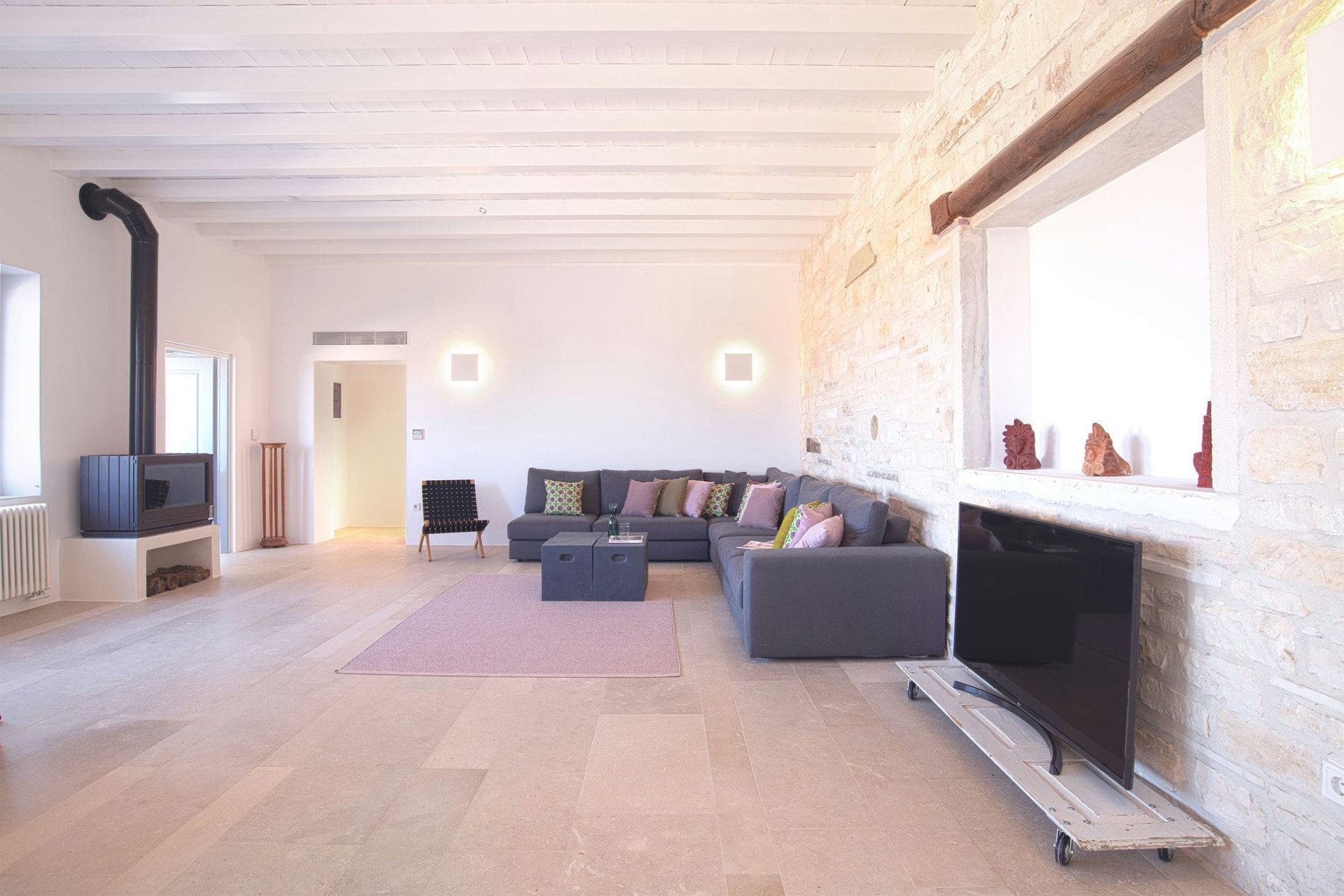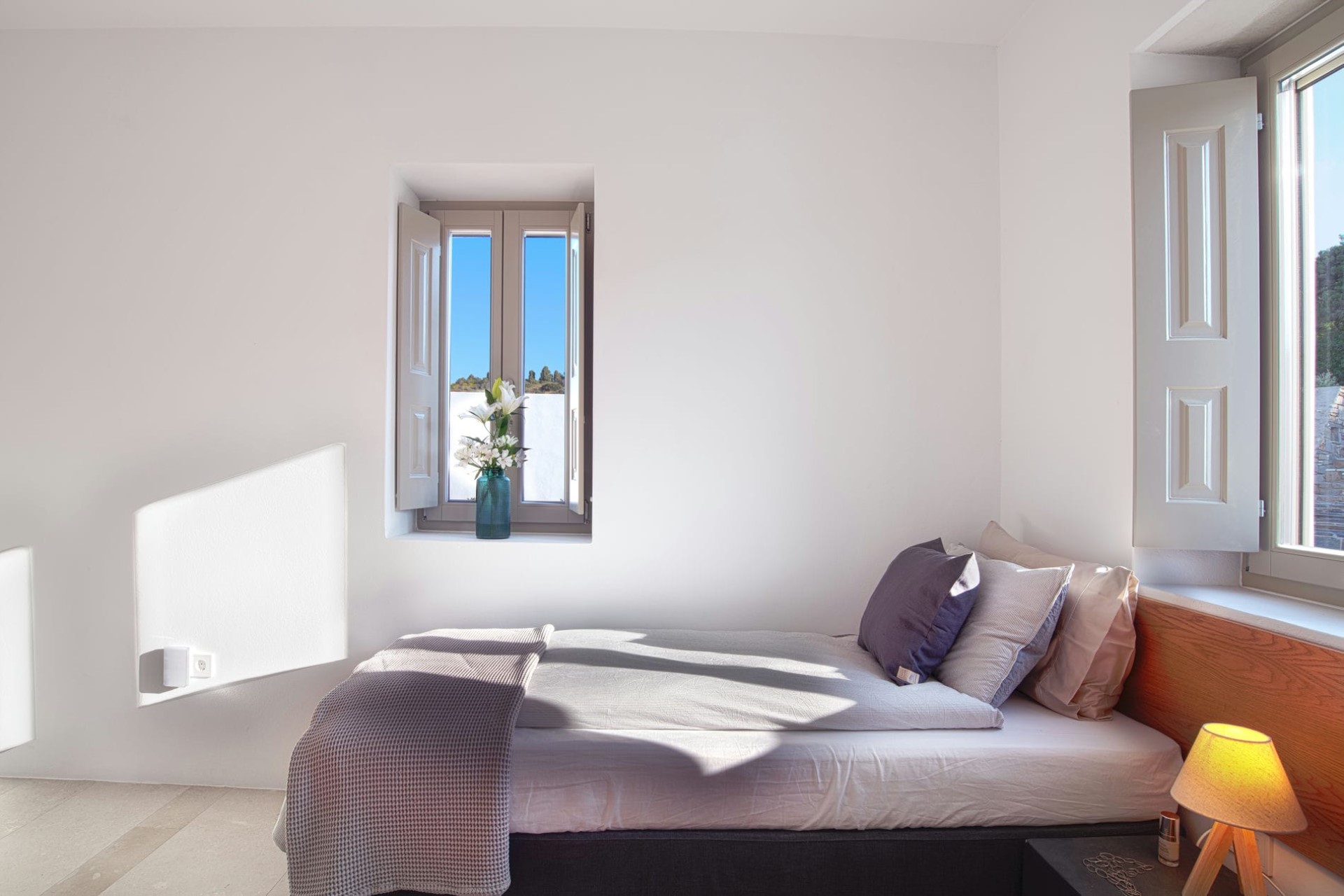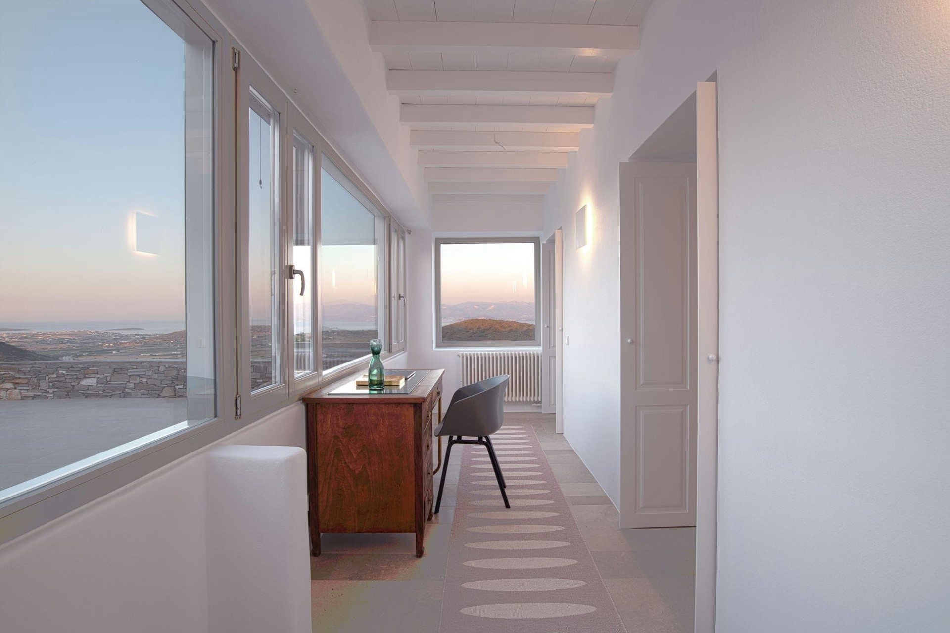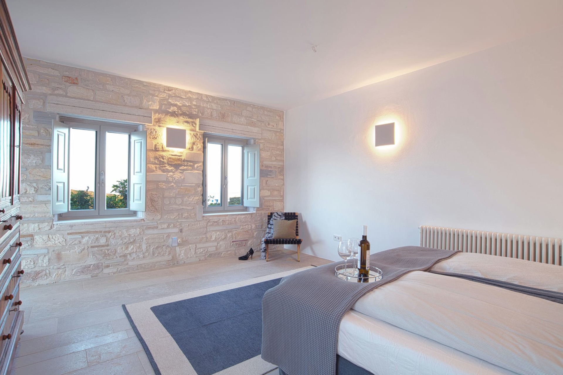 An open-plan living and dining room welcomes guests with chic, contemporary furniture perfectly blended with unique antiques and design pieces dotted throughout. Large windows flood the room with light and offer panoramic views down to the sea and the neighbouring island of Naxos. Moreover, a feature fireplace heats the room in the cooler months, meaning the villa can be enjoyed year-round.