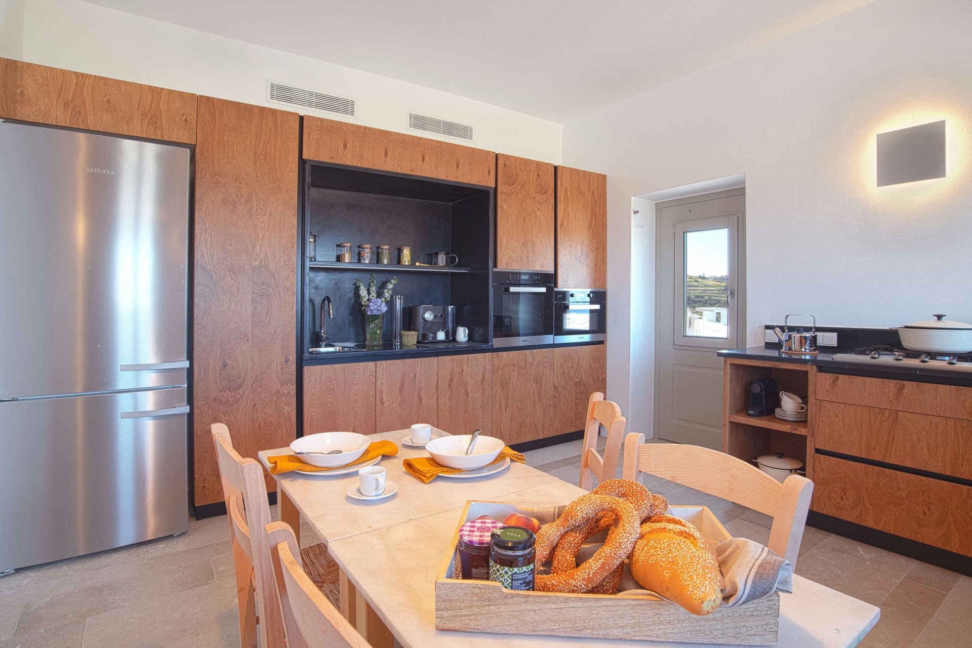Adjoining the living room is a dine-in kitchen fully equipped with high-end appliances. It also offers beautiful sea views and direct access to the vegetable garden for a true farm-to-table experience.