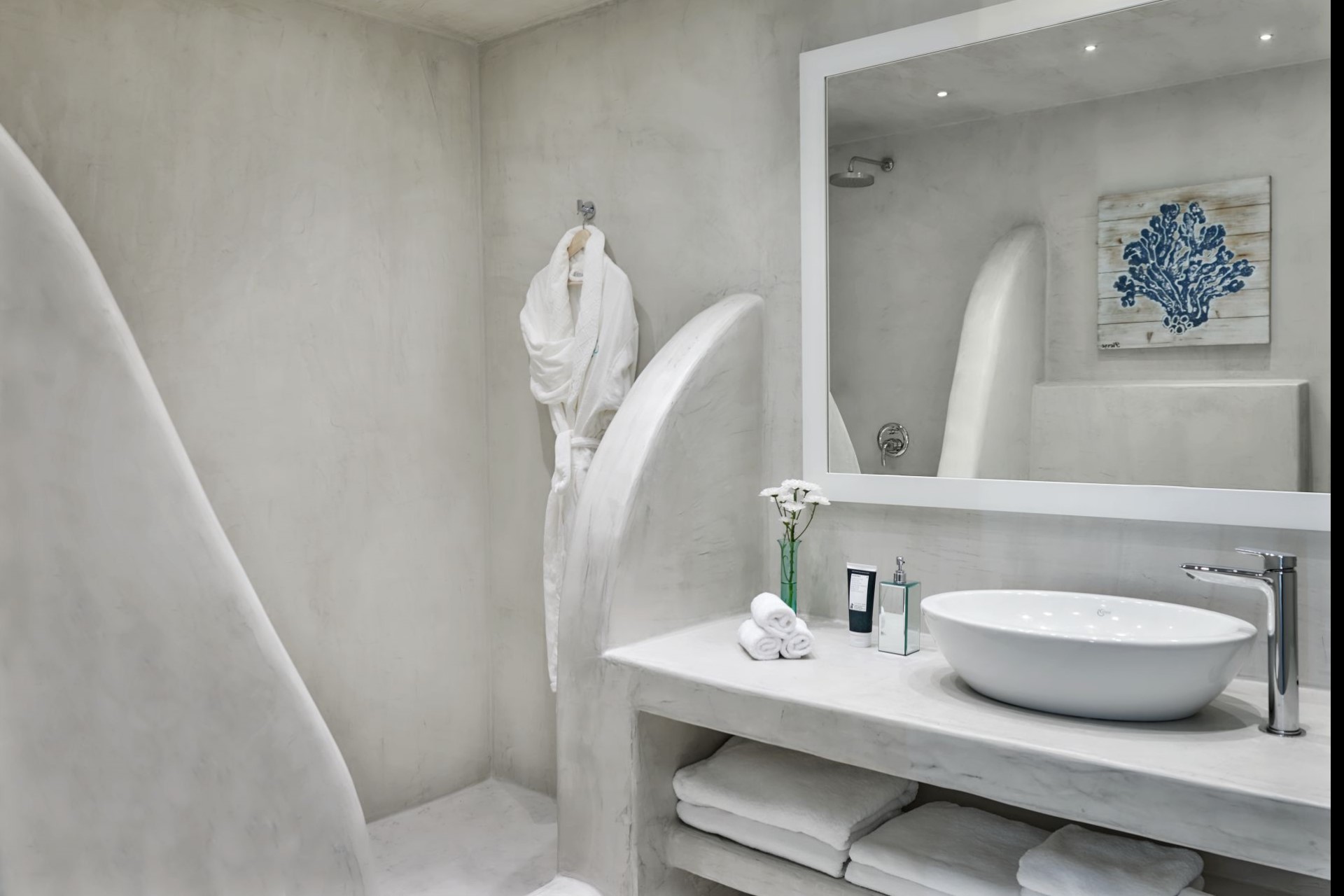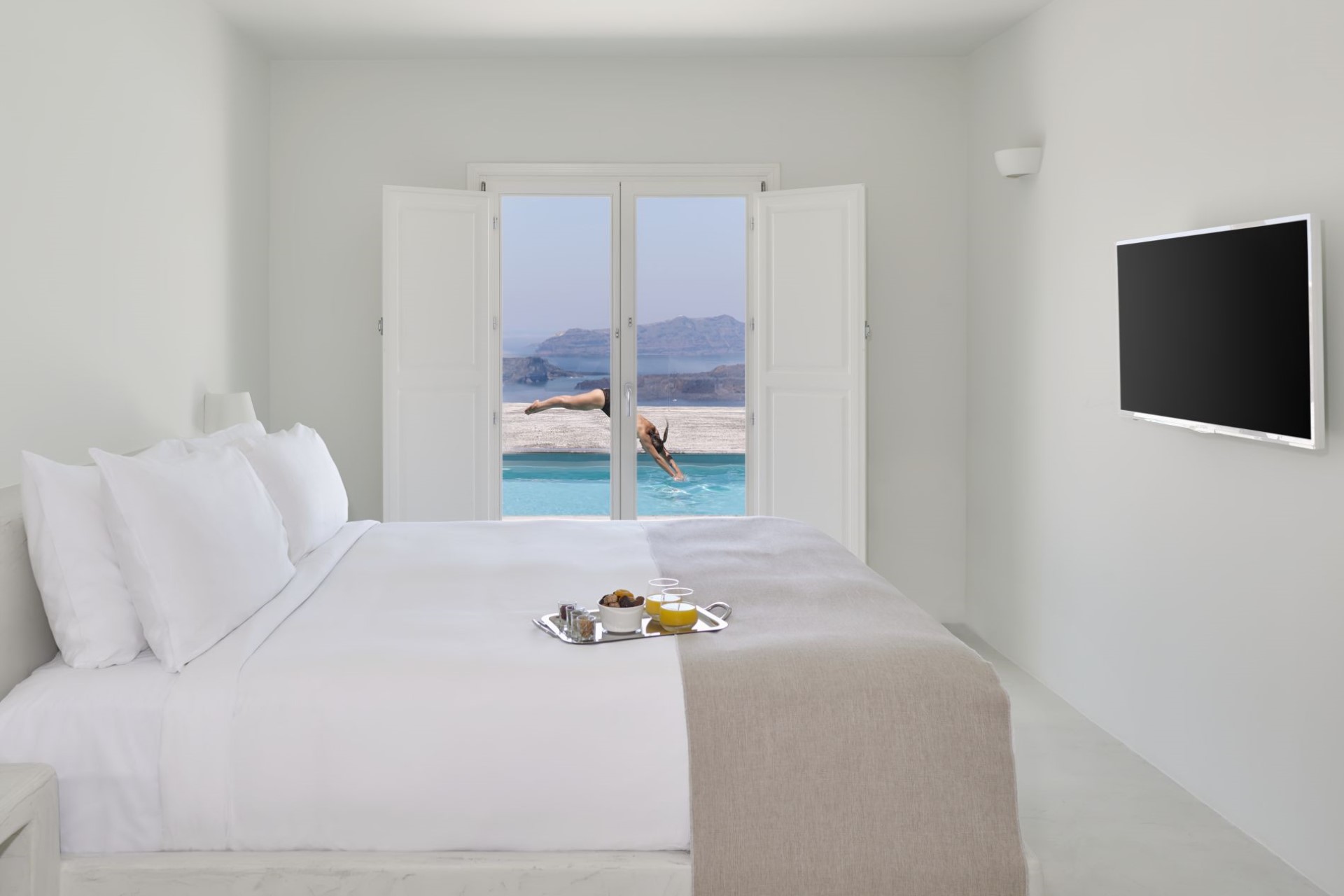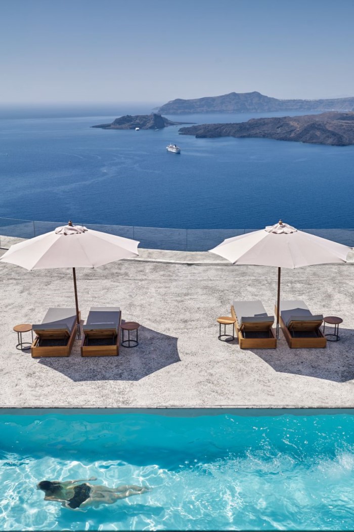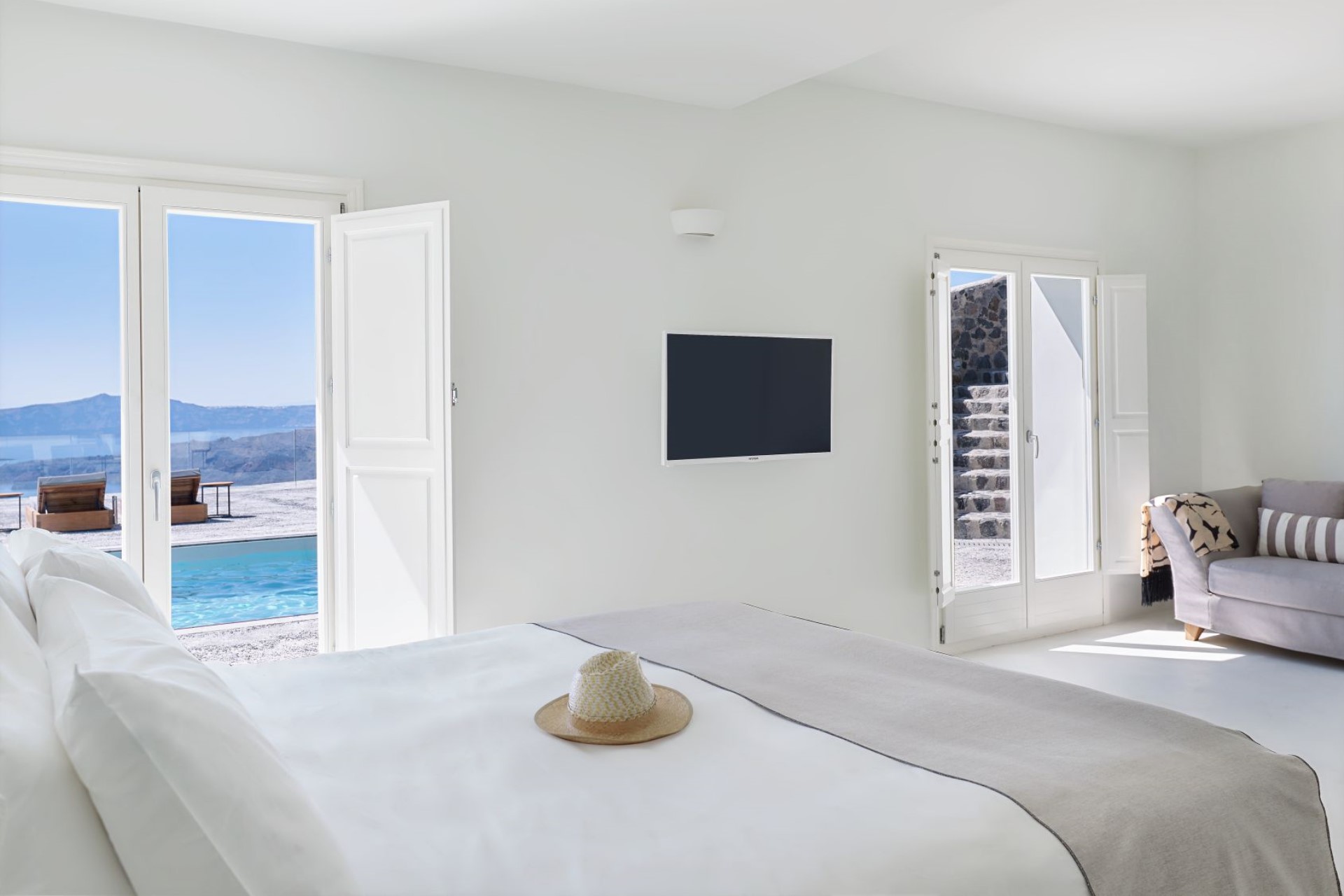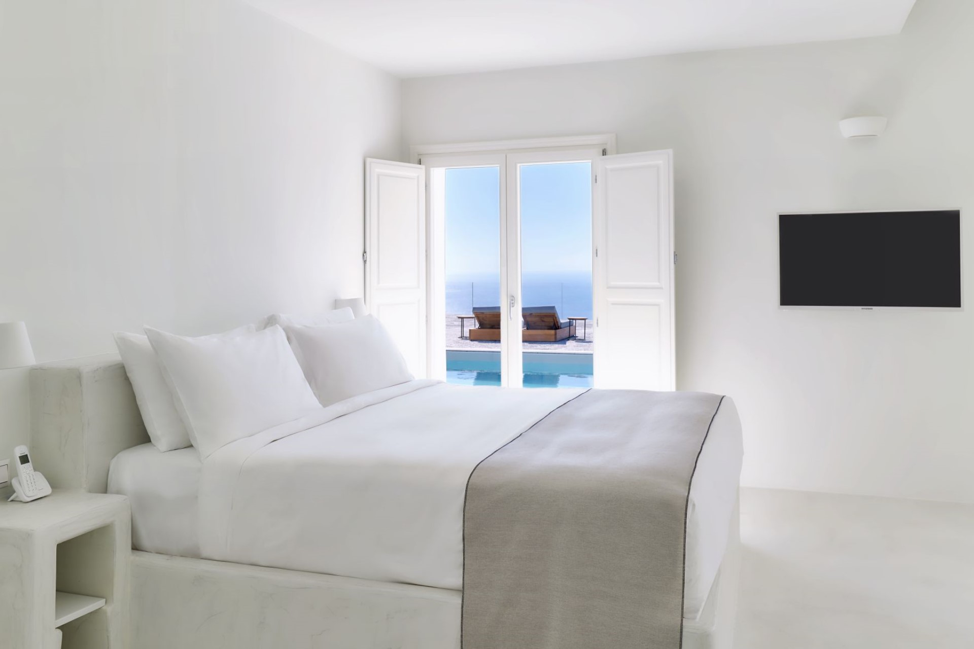 Traditional Cycladic architecture is combined with modern design for a sleek and sophisticated villa design. Neutral tones are used throughout to contrast perfectly with the brilliant blue sea and sky.