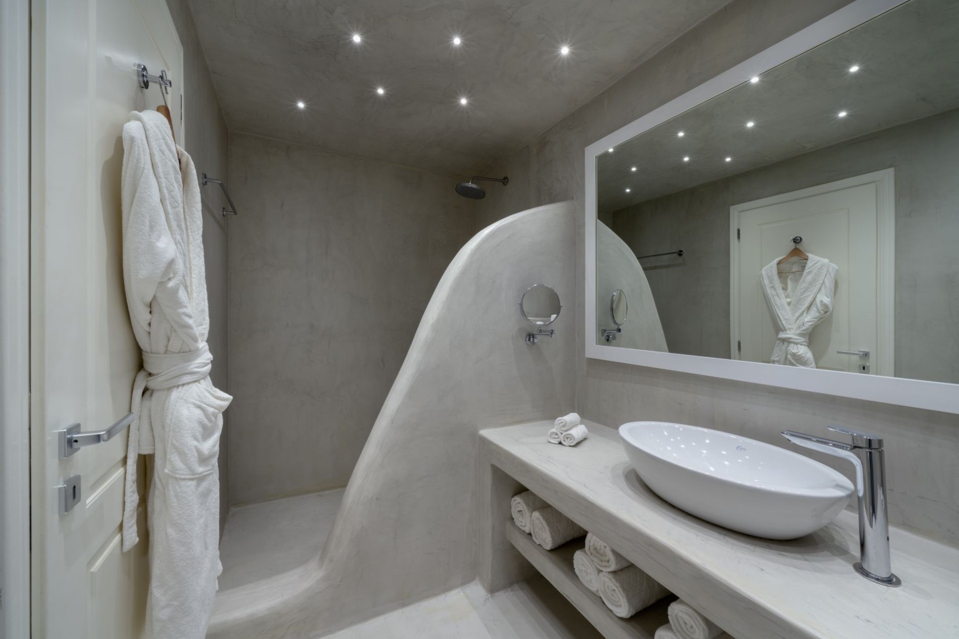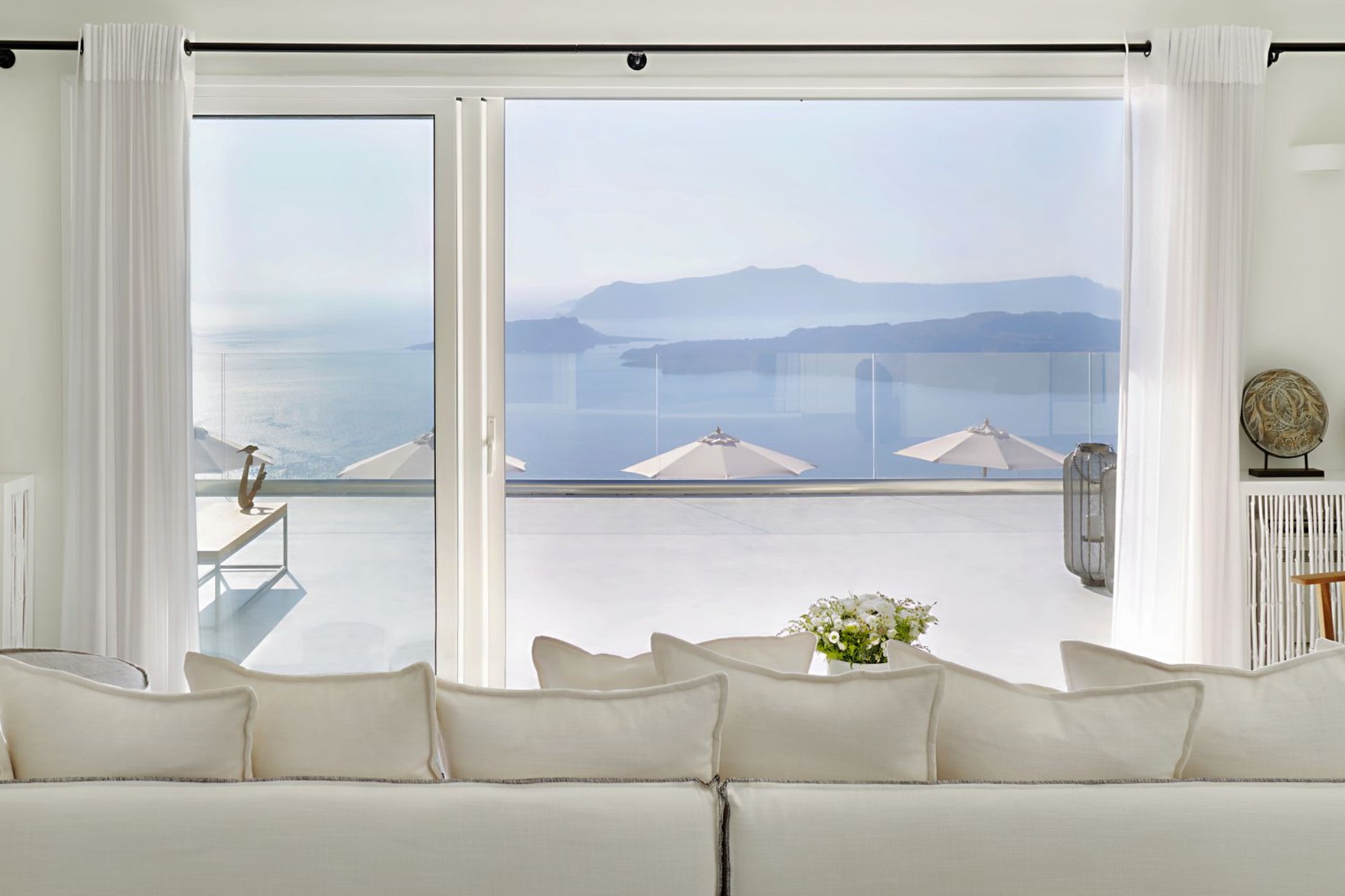 The main living areas are on the top floor of the villa. A spacious lounge room with a domed ceiling features plush seating looking directly out over the caldera, and sliding glass doors open to the first-floor balcony with additional seating, seamlessly integrating indoor and outdoor living. There is also a second living room on the ground floor.