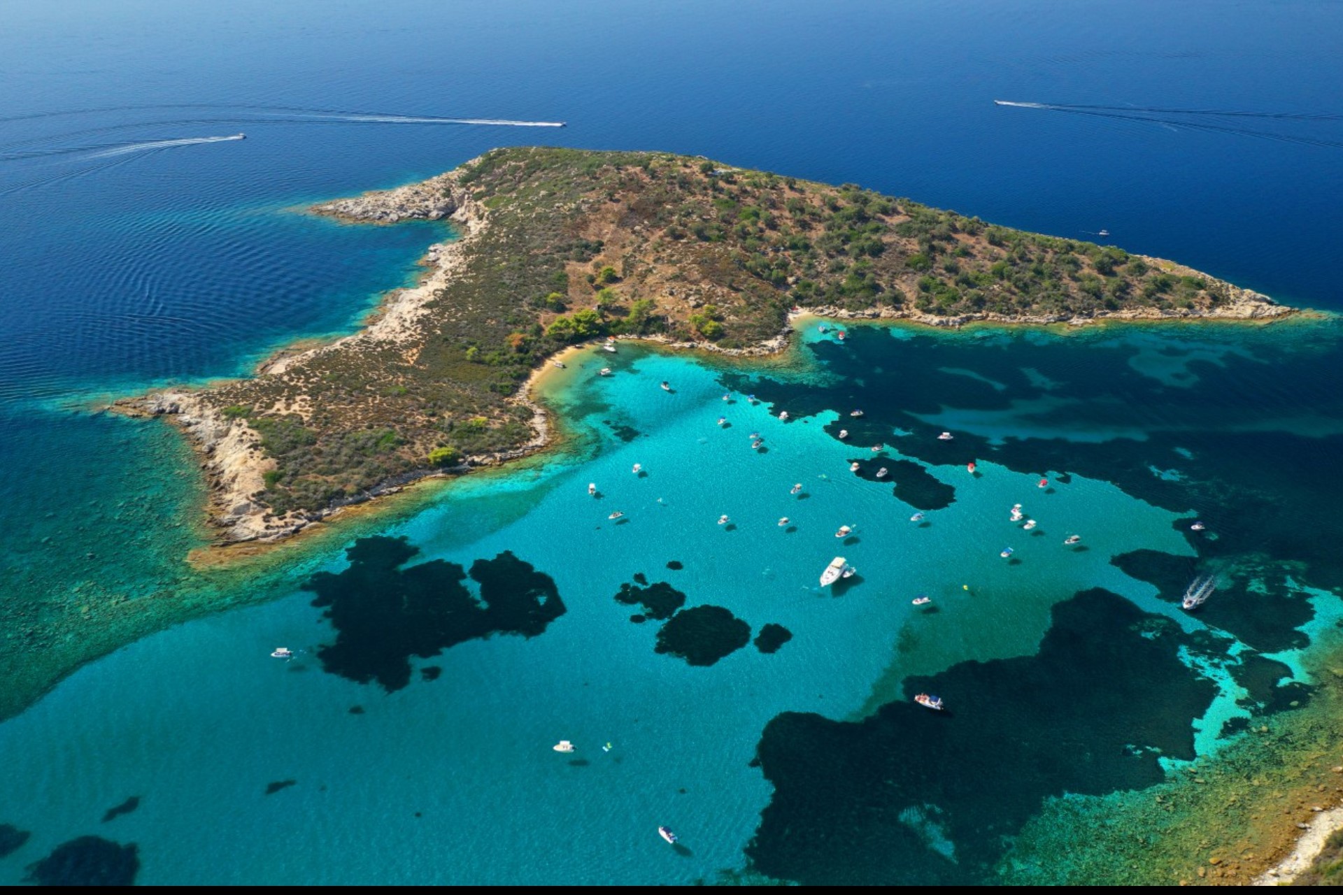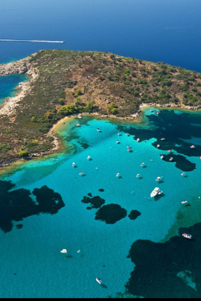 Uninhabited until the 1950s, Diaporos Island was soon discovered by discerning beach lovers. It remains all about the coastline here, which unfolds in a montage of spectacular sands and coves. Among them is Kryfto Bay, a lagoon-like inlet in the north, which is home to endless secret snorkelling spots, sunbathing alcoves, and places to drop anchor on the yacht. There's also Myrsini Beach, also known as White Beach or Hawaii due to its glinting white stone and vibrant blue waters. And then there's Koumaroudes Beach, which faces back towards the mainland to give some of the calmest swimming conditions around.