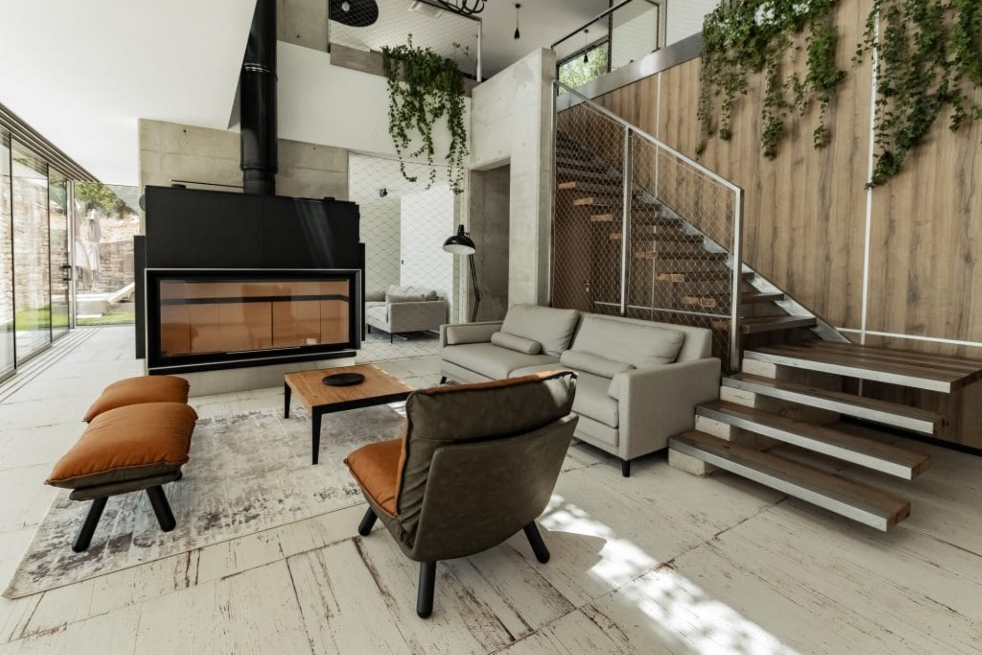 On the ground floor, the main living room features plush sofas surrounding a cosy fireplace, perfect for cooler evenings. The first floor is home to a spacious kitchen and dining area with direct access to the barbecue terrace. With sliding glass doors, guests can enjoy delicious meals whilst taking in spectacular views.