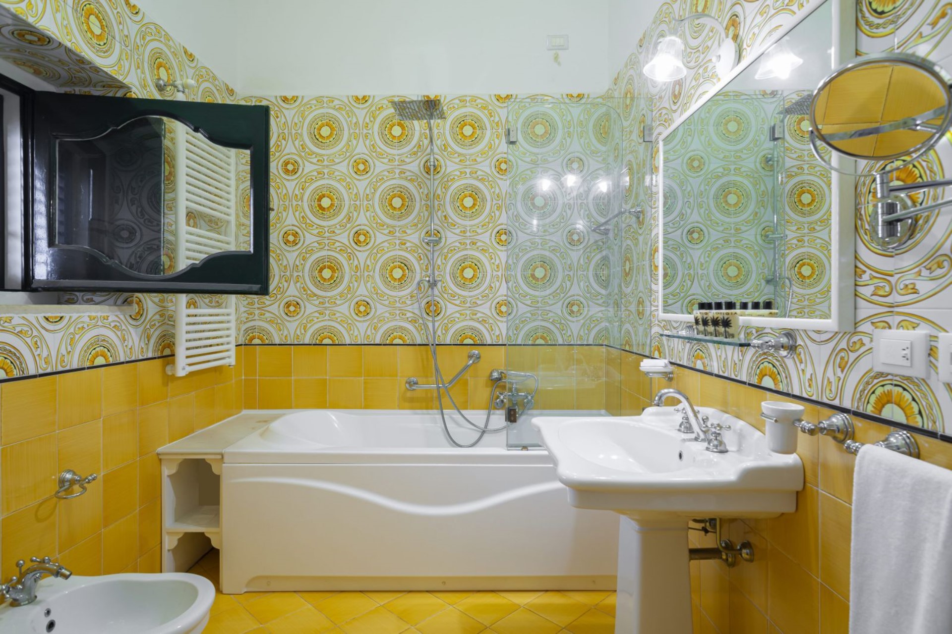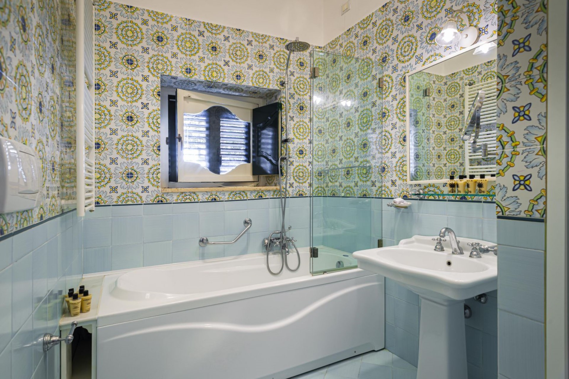 Suite 4 – double bed, frescoed ceilings, en-suite bathroom with bathtub & shower, terrace access, and sea views