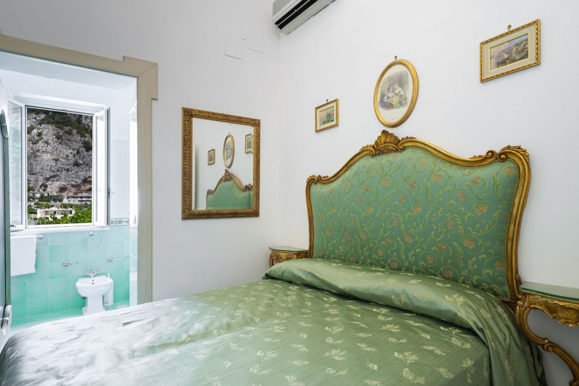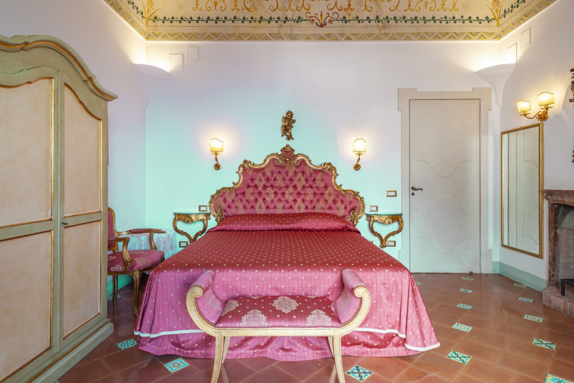 Suite 2 – double bed, frescoed ceilings, en-suite bathroom with bathtub & separate shower, terrace access, and sea views