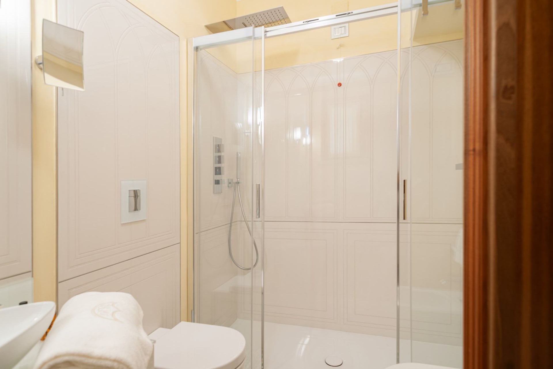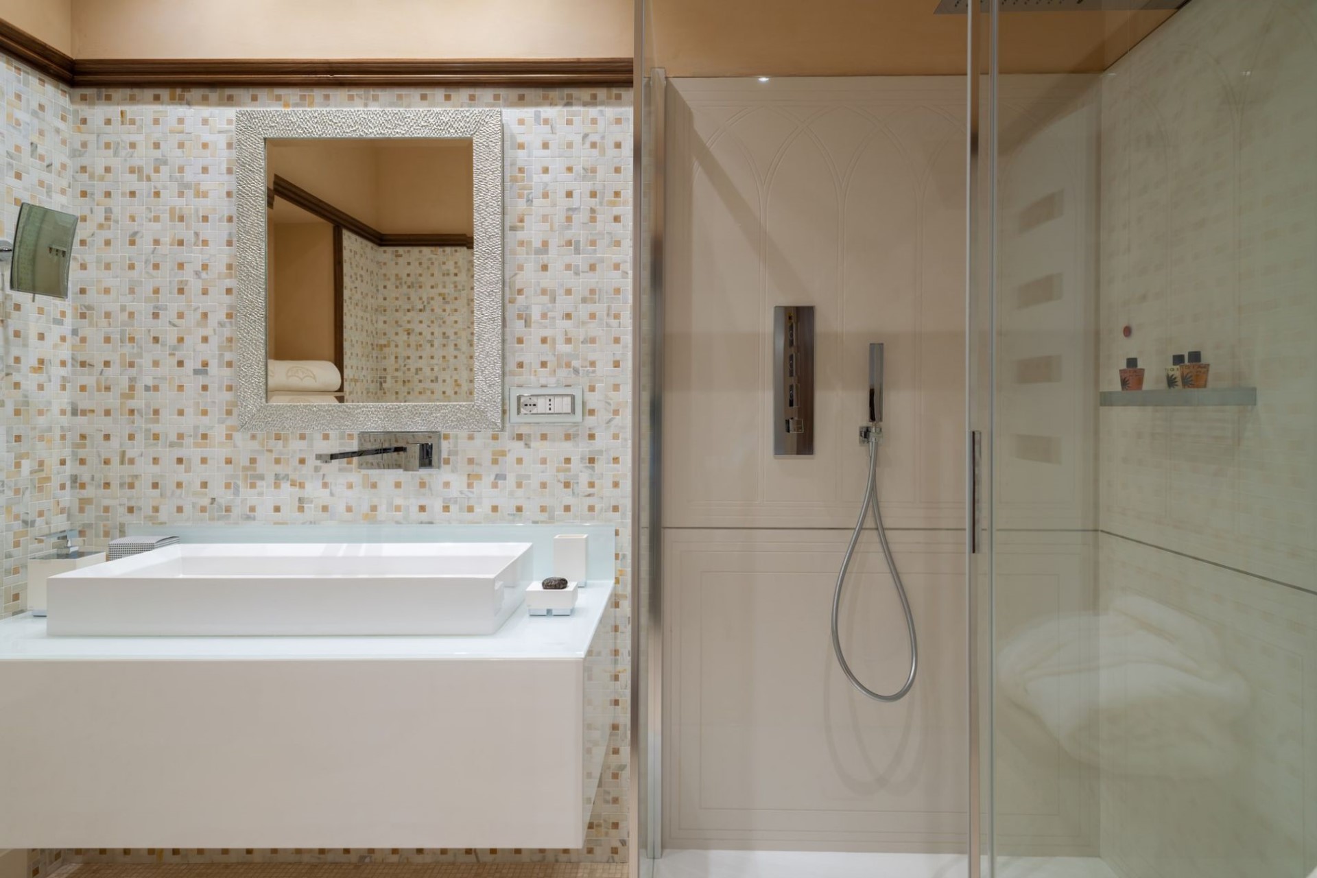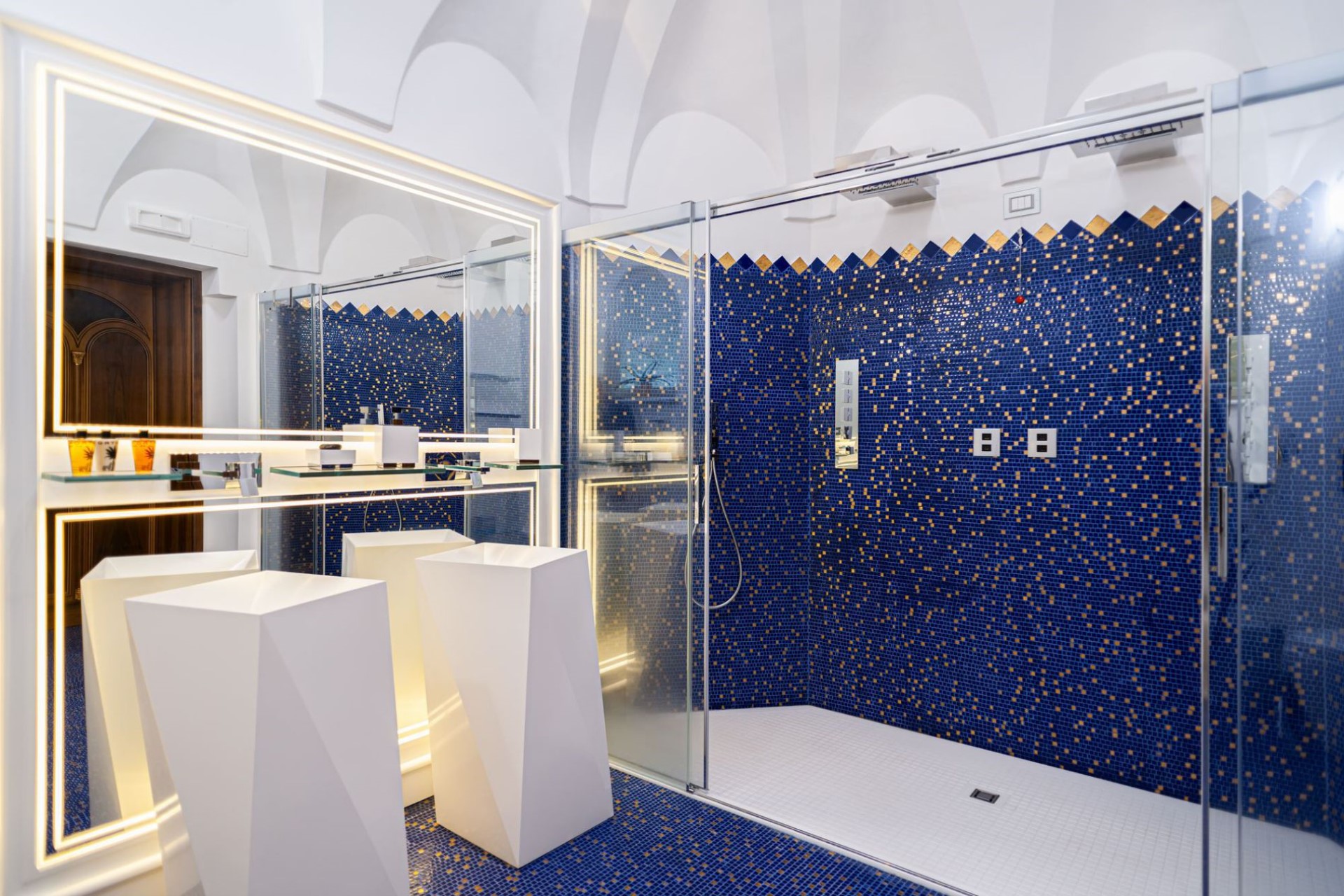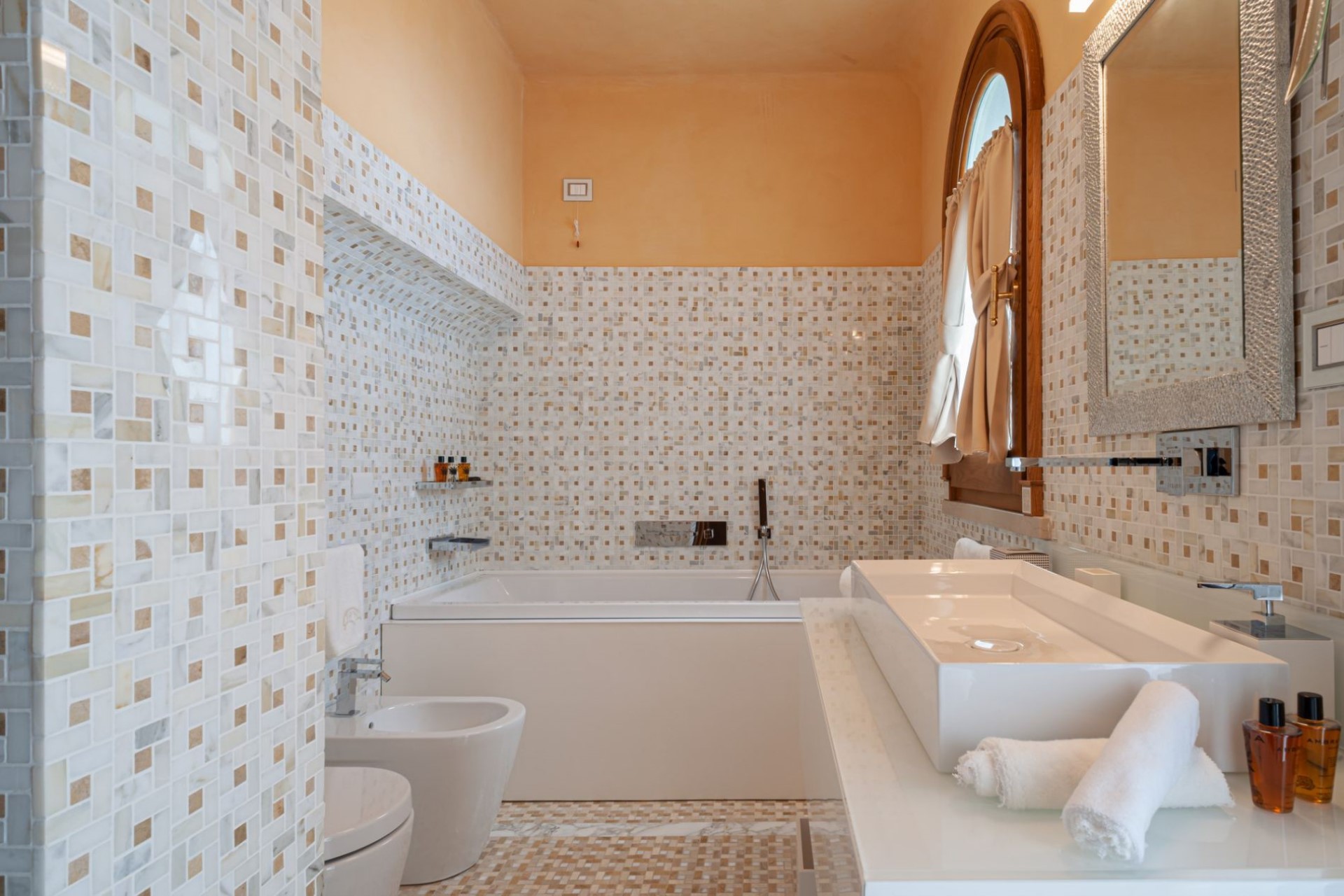 The historic villa has been expertly restored, retaining its traditional architectural elements including vaulted ceilings, arched windows, and tiled corridors. The décor and furnishings are by local artisans and have been beautifully paired with antiques including gold-plated door handles, goldsmith cabinet doors, and Murano glass lamps, as well as a mix of traditional and contemporary art throughout.