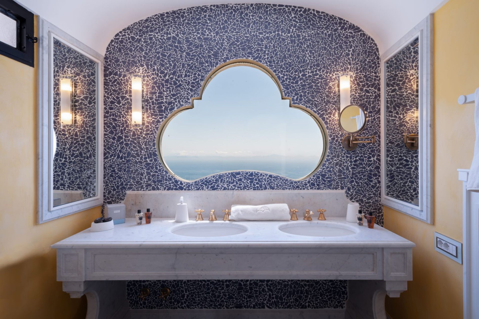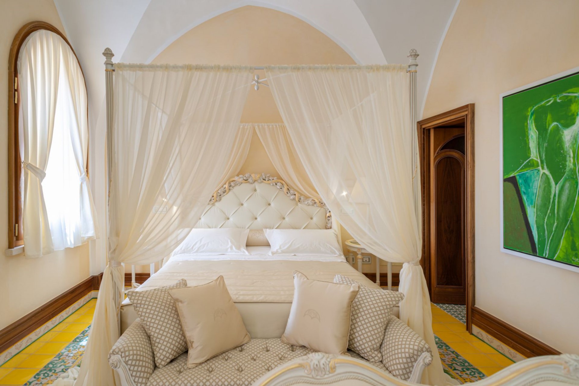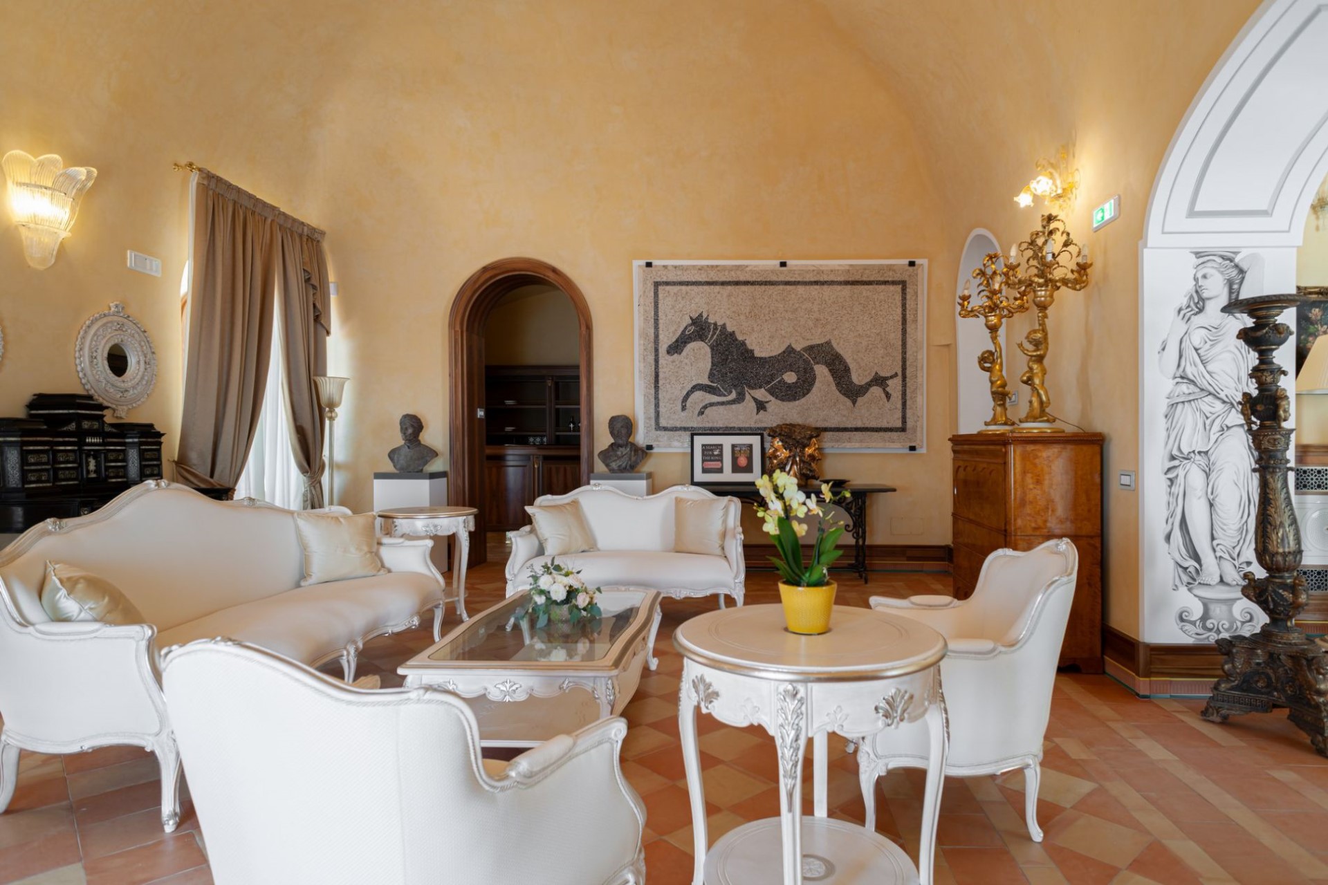 Several living rooms are located throughout the property, including a sea-view room with beautiful frescoed ceilings and a cosy fireplace, and a separate lounge with a bar made from beautifully-inlaid wood. The fully-equipped kitchen can be used by both staff and guests alike to prepare delicious Italian feasts.