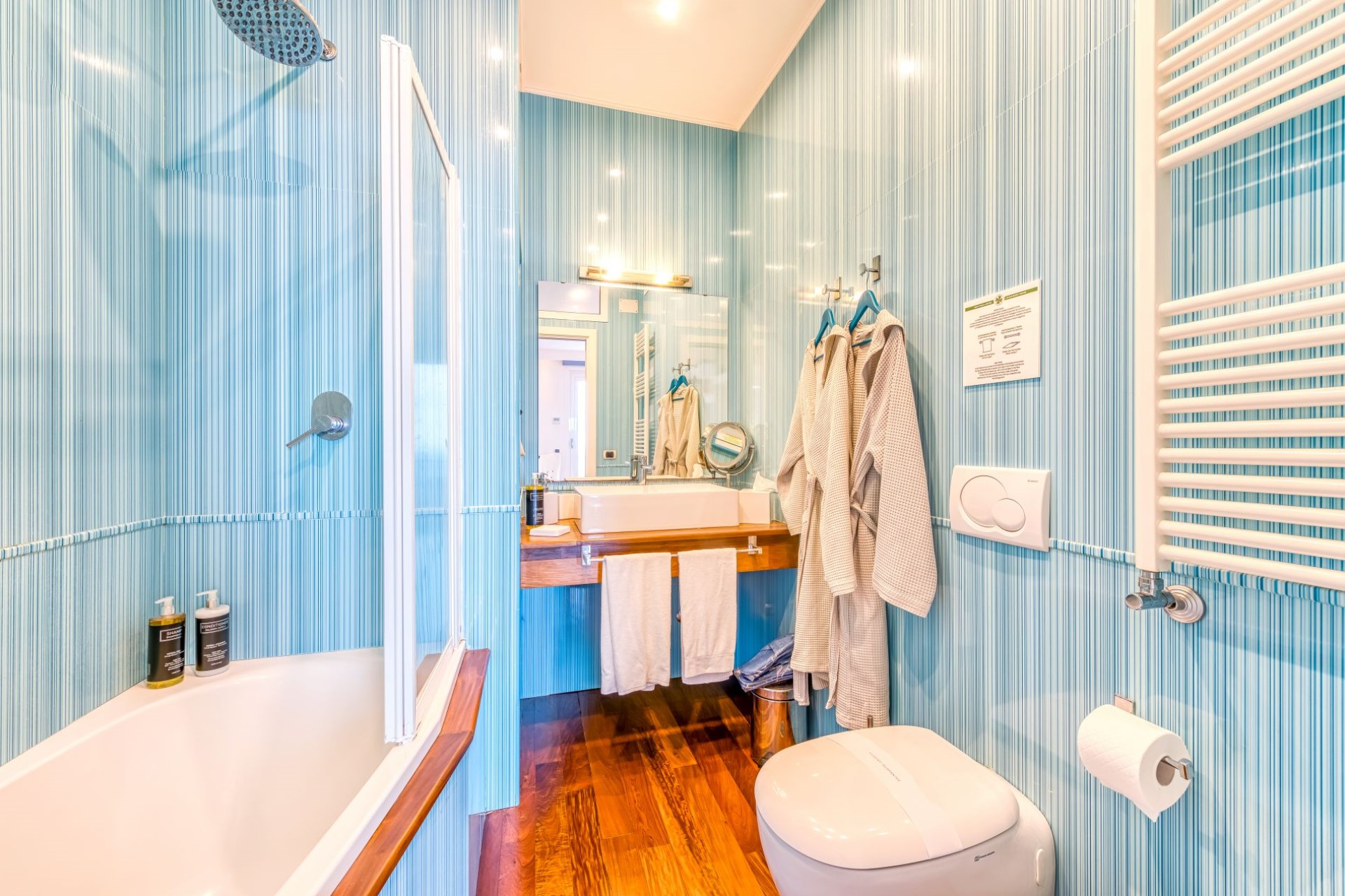 Bedroom 3 – twin beds (converted to one king-size bed on request), en-suite bathroom with bathtub, and shared terrace with outdoor Jacuzzi & sea views