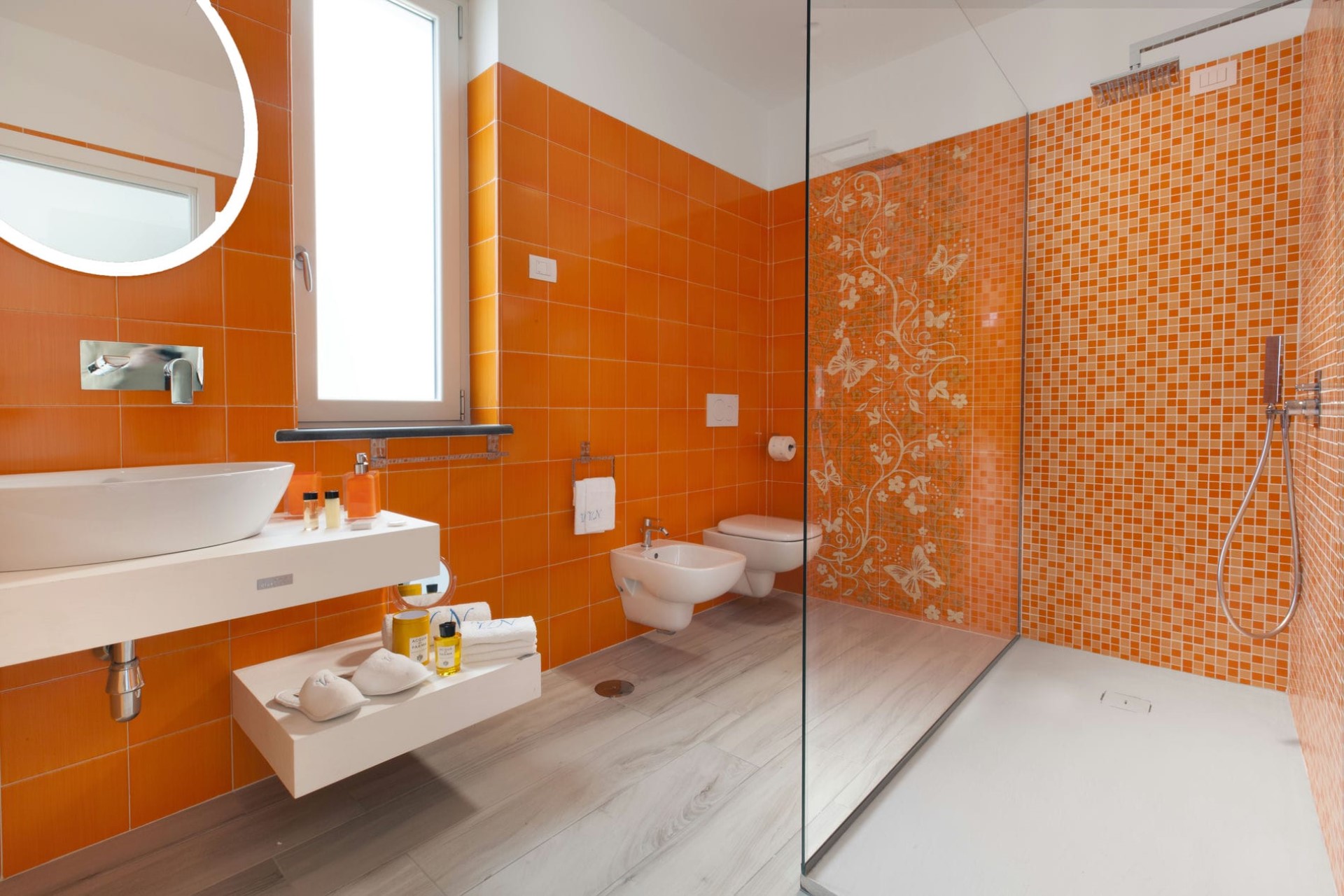 Orange Bedroom – queen size bed, en-suite bathroom with shower, and private balcony with sea views