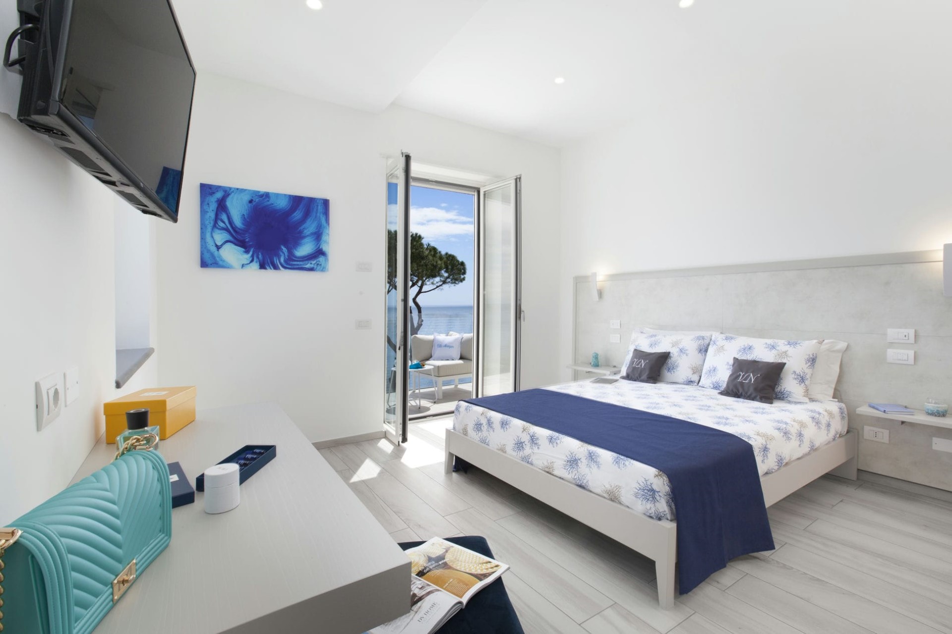 Deep Blue Bedroom – queen size bed, en-suite bathroom with shower, balcony access, and sea views