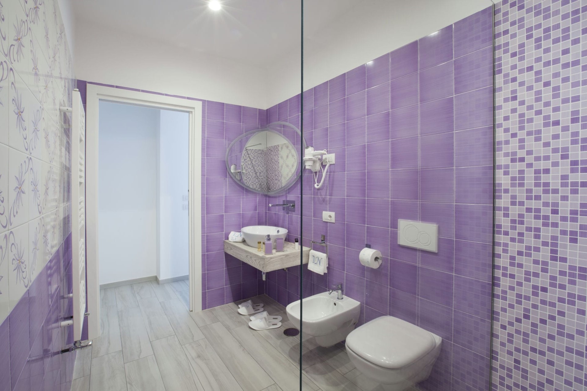 Lilac Bedroom – queen size bed, en-suite bathroom with shower, balcony access, and sea views