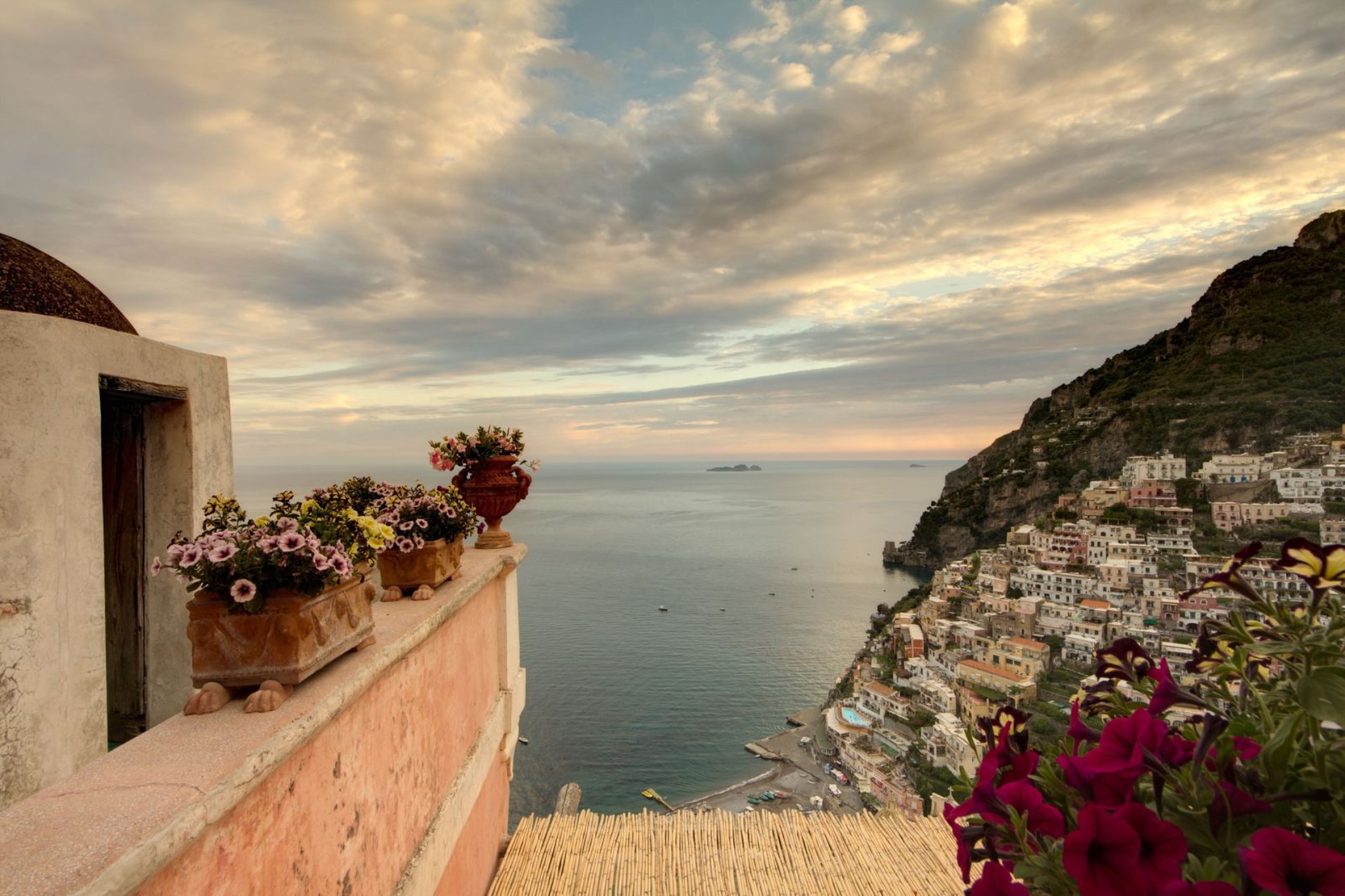 Villa San Giacomo is located in Positano, which is the iconic representation of an Amalfi town, with buildings clinging in tiers to the rock face. The white of the buildings are a perfect canvas for the bright flowers which decorate the houses and the small artisans’ shops with their multi-hued cloths.
