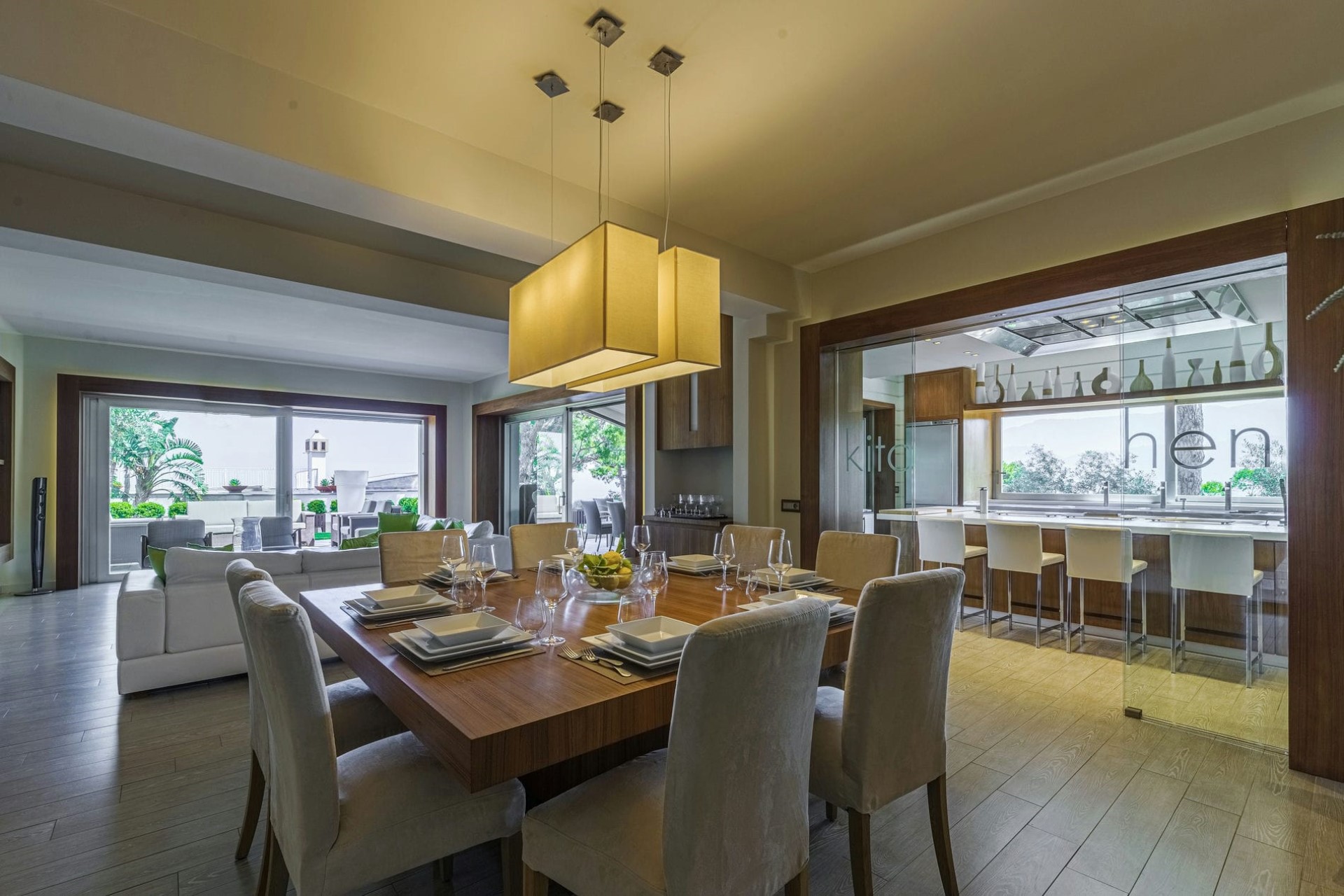The dining room boasts a large wooden table and chairs with access to the fully-equipped kitchen with breakfast bar. Both the kitchen and the living room lead onto an outdoor dining area with a glass table, ideal for more intimate or romantic dinners.