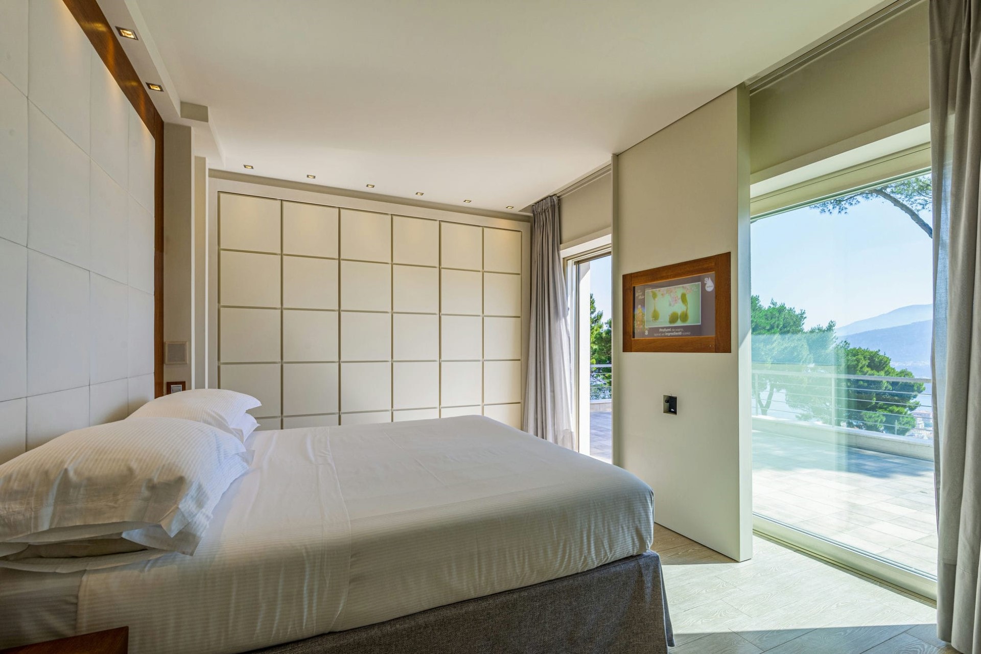 Bedroom 4 (Master) – double bed, en-suite bathroom with jet bathtub/shower, balcony access, and sea views