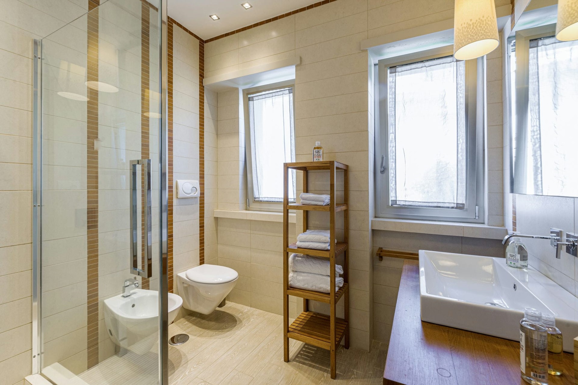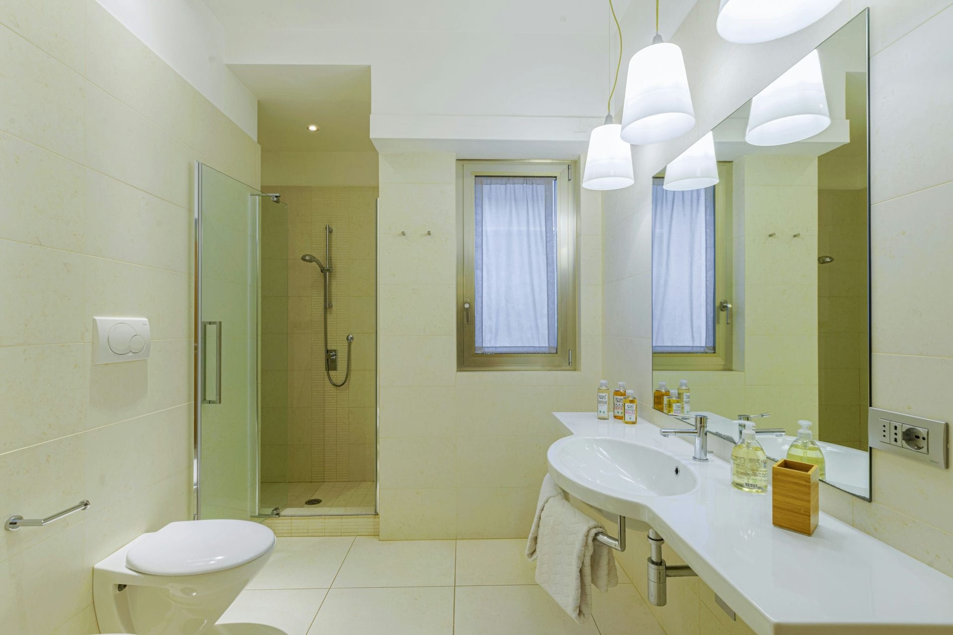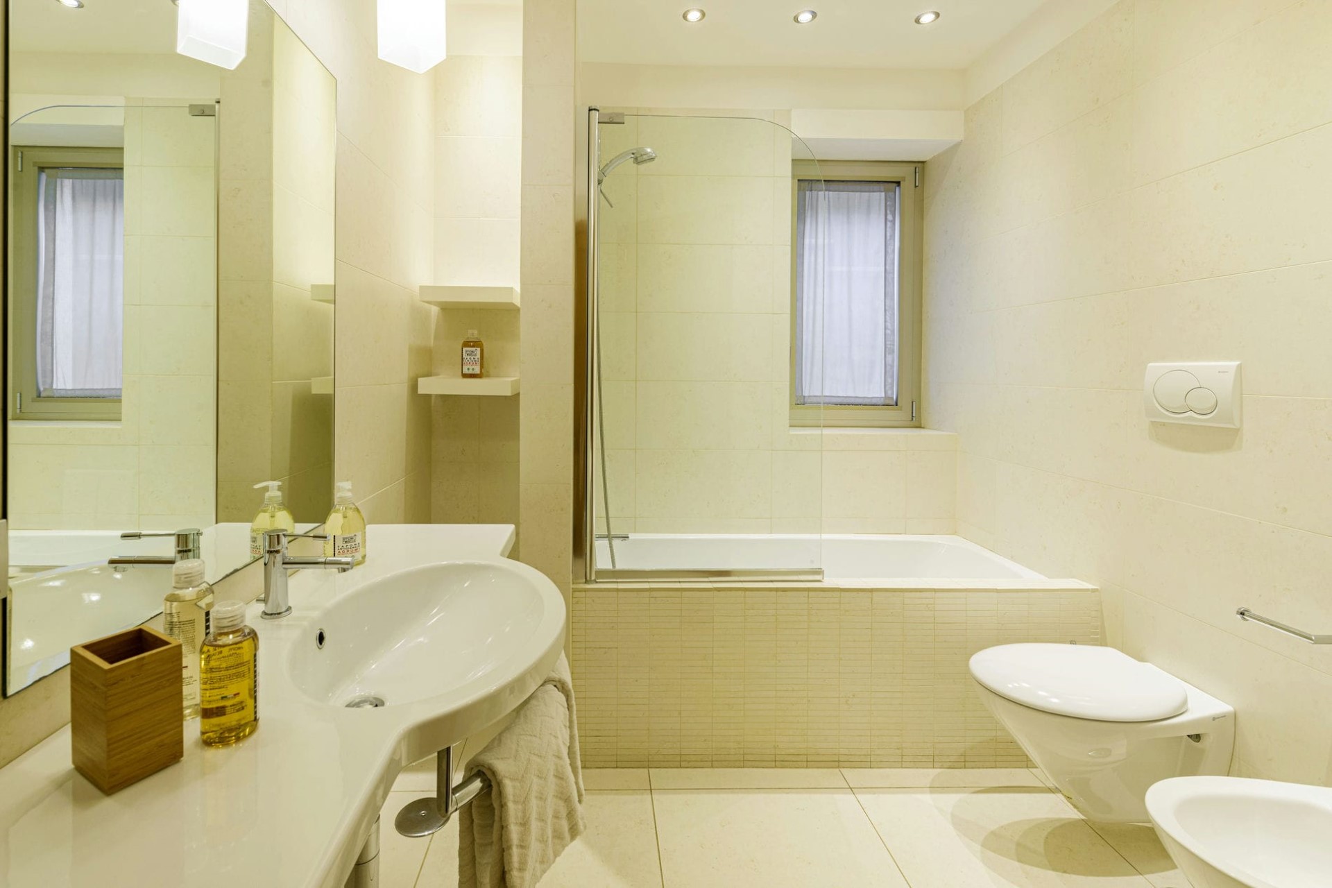 Bedroom 2 – double bed (converted to twins, on request), en-suite bathroom with bathtub/shower, and terrace access