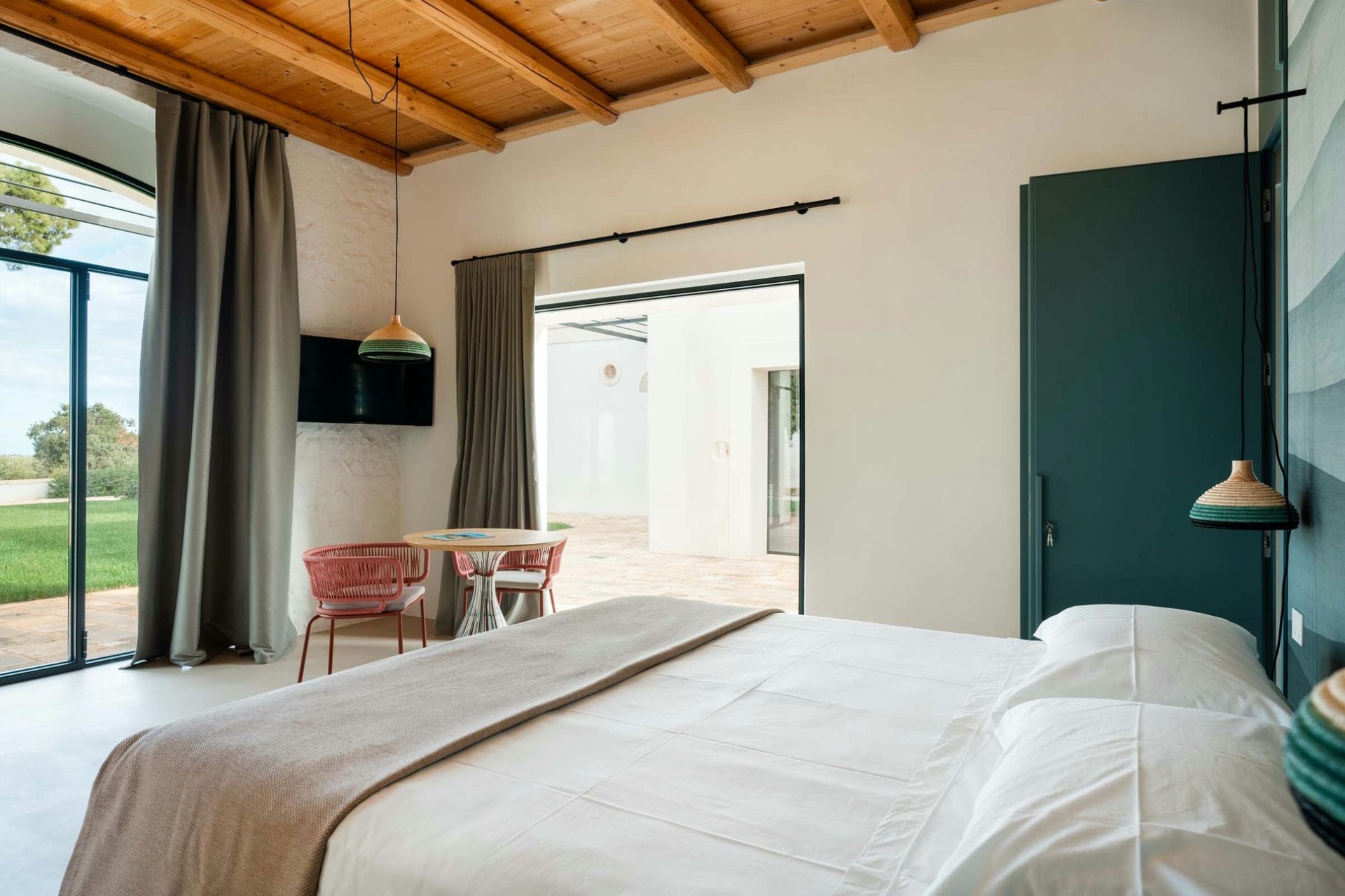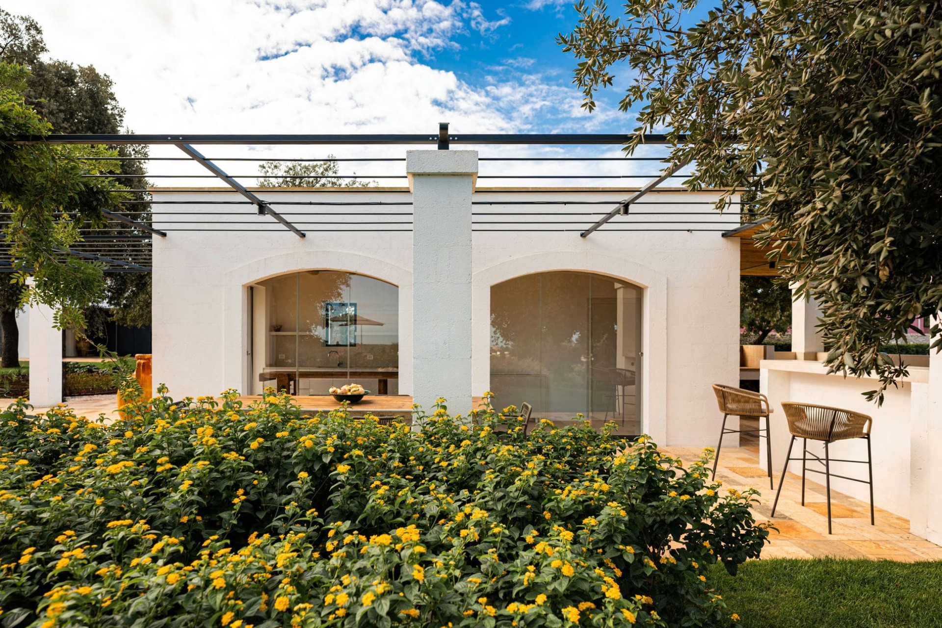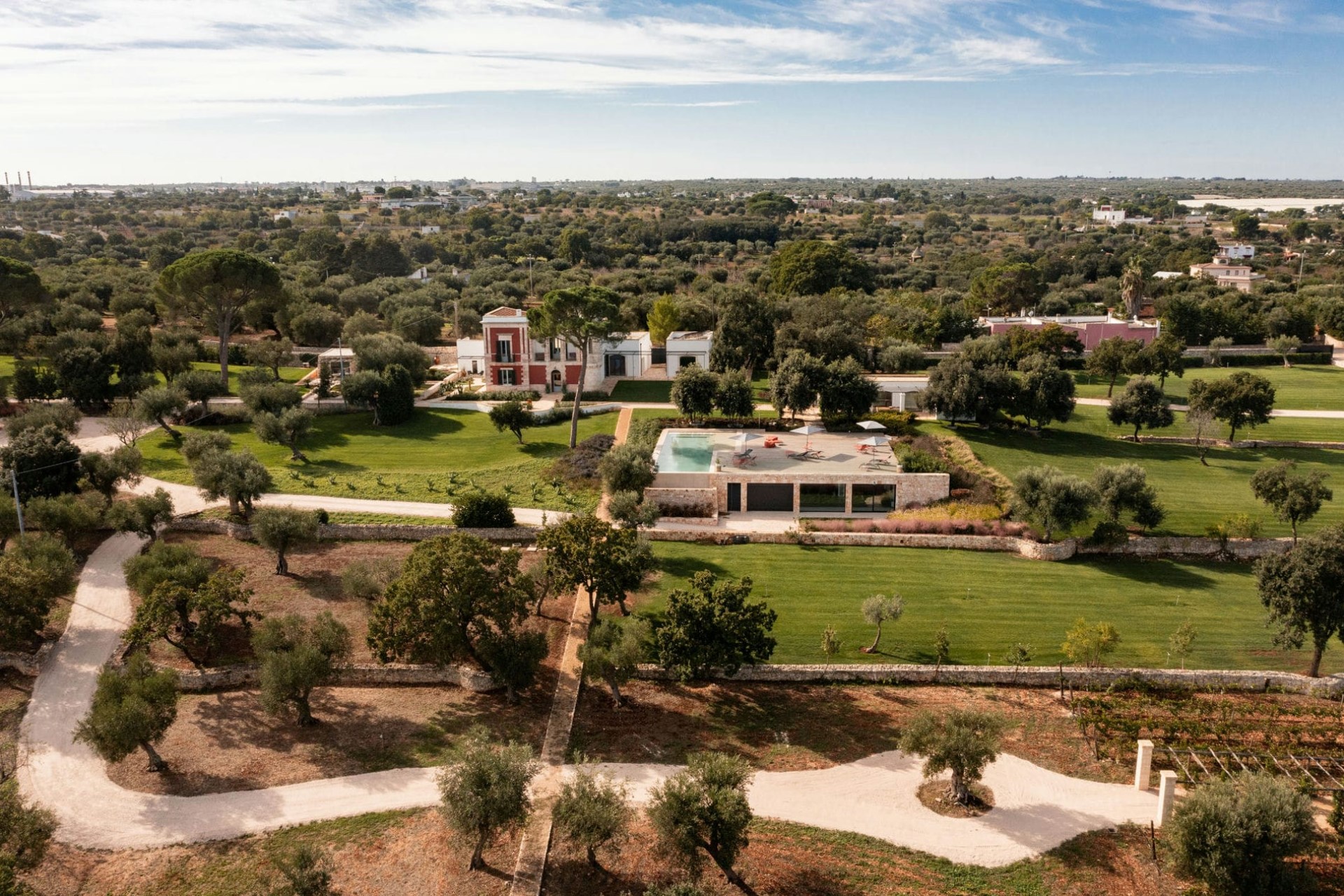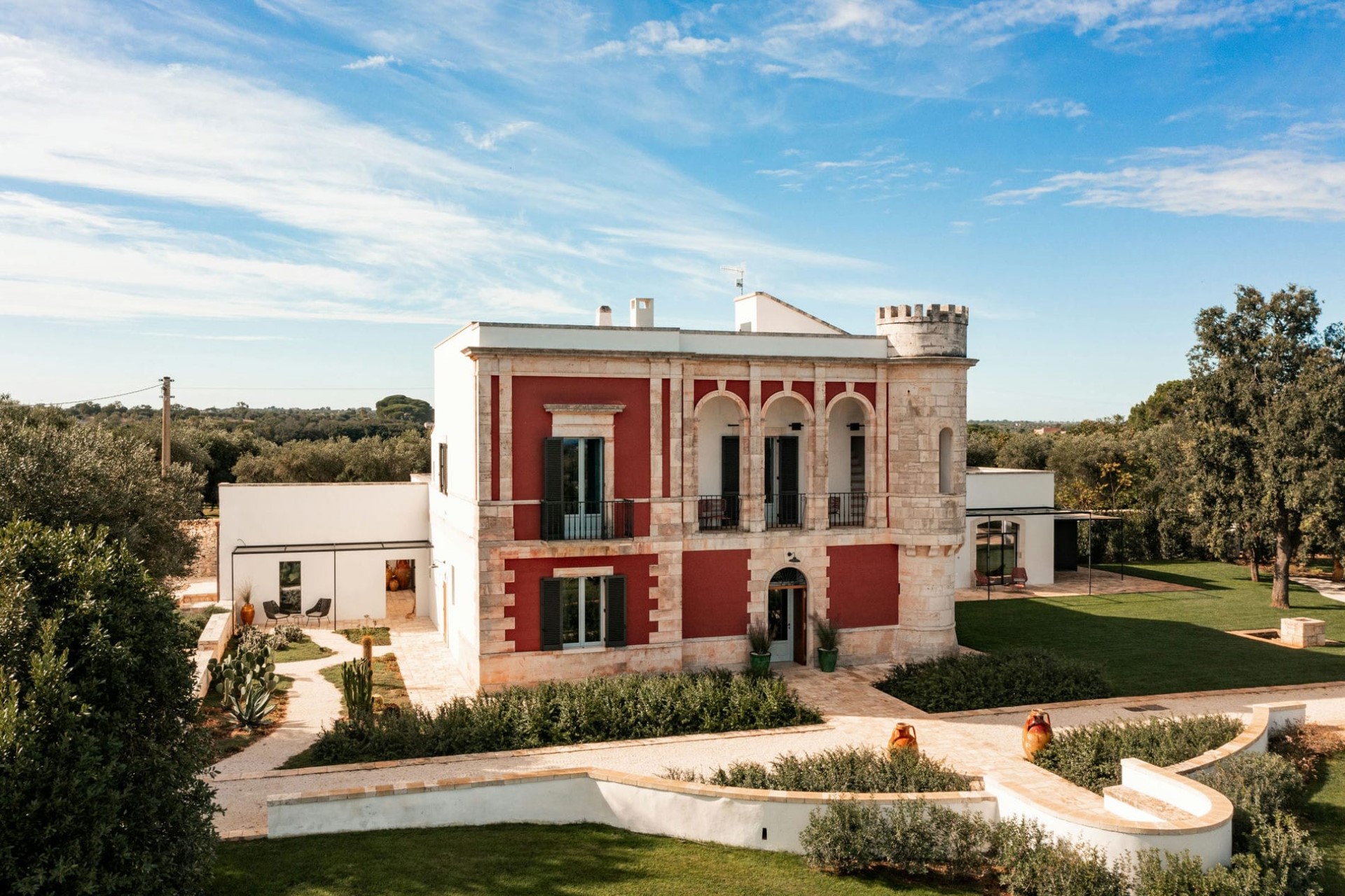 Bordered by its own vineyard, the estate’s sprawling grounds, with manicured lawns and landscaped gardens, offer a private and tranquil oasis for enjoying the Apulian sunshine.