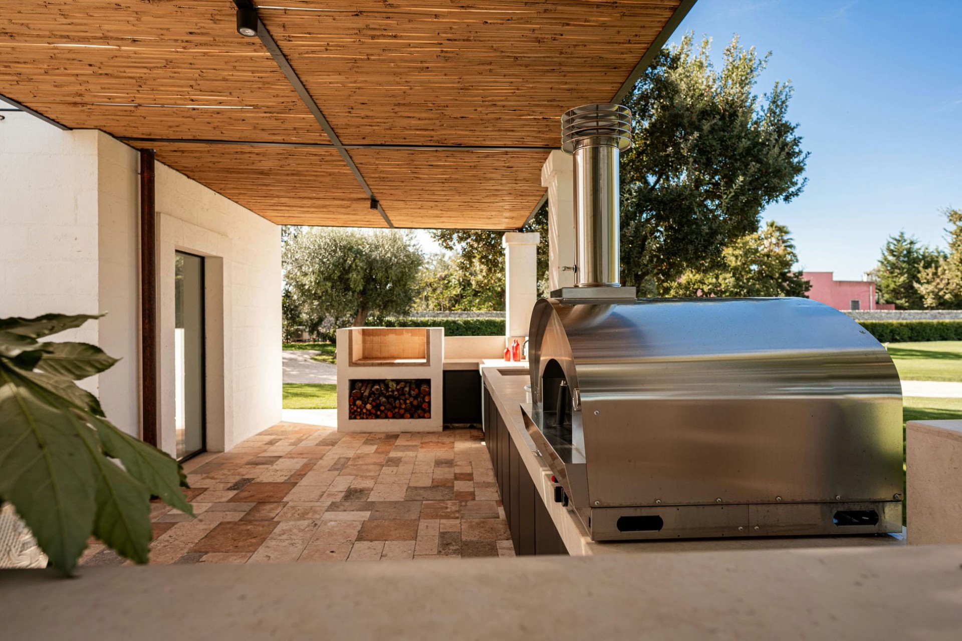 The outdoor dining area, nestled in the gardens, is a perfect spot for guests to enjoy convivial feasts in the fresh countryside air. A fully equipped outdoor kitchen is complemented by a separate barbecue area featuring a charcoal barbecue and an electric pizza oven.