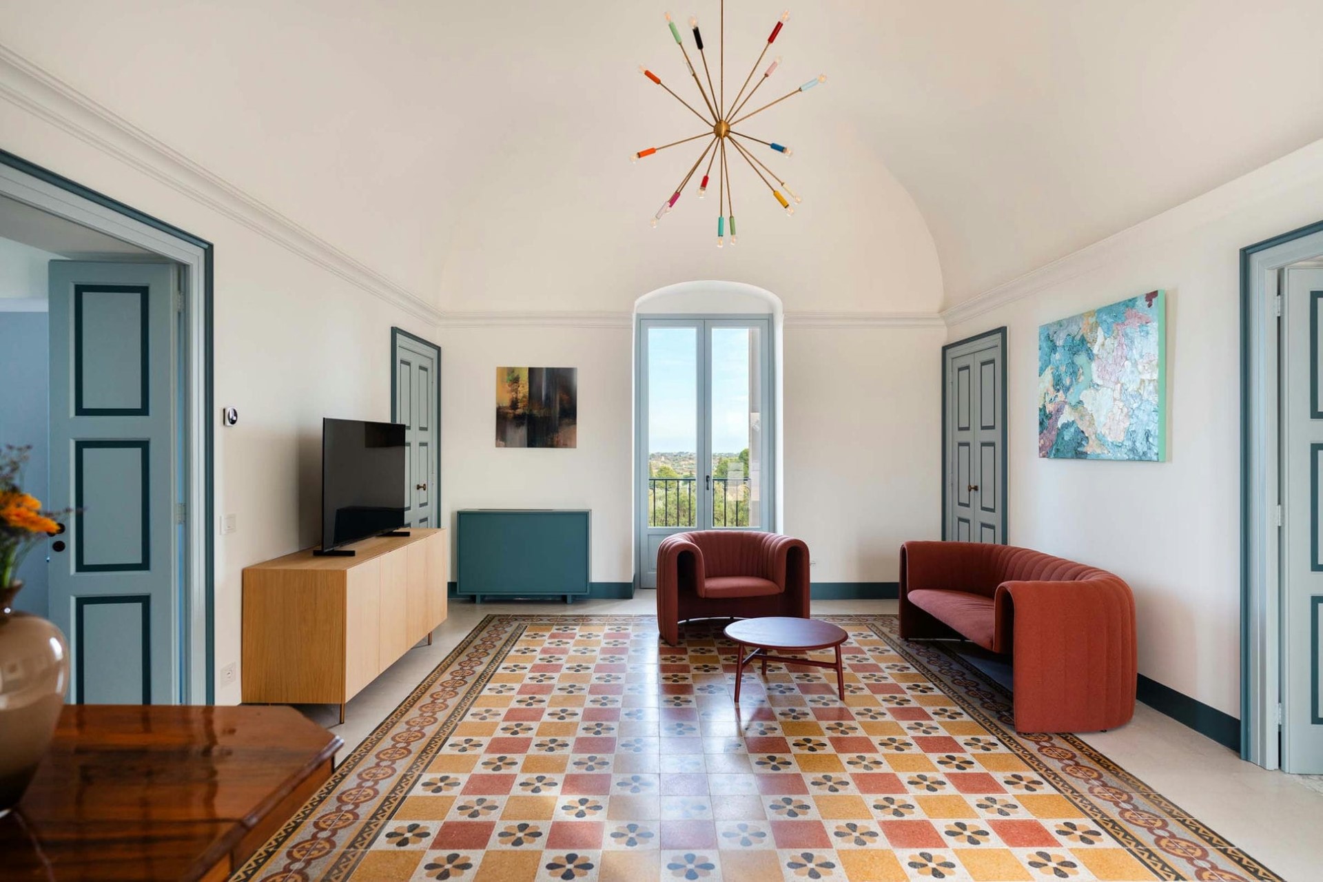The villa’s terraces and balconies, offering serene views of the surrounding countryside, provide tranquil spaces for guests to enjoy a morning coffee or dive into a holiday read in peace and solitude, fostering a sense of relaxation and tranquillity.