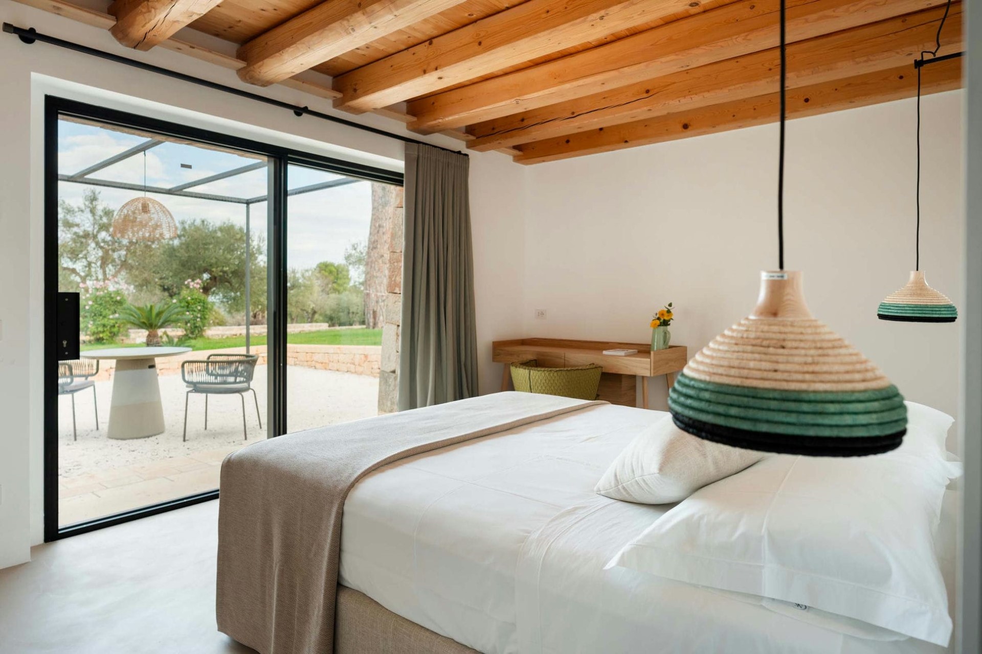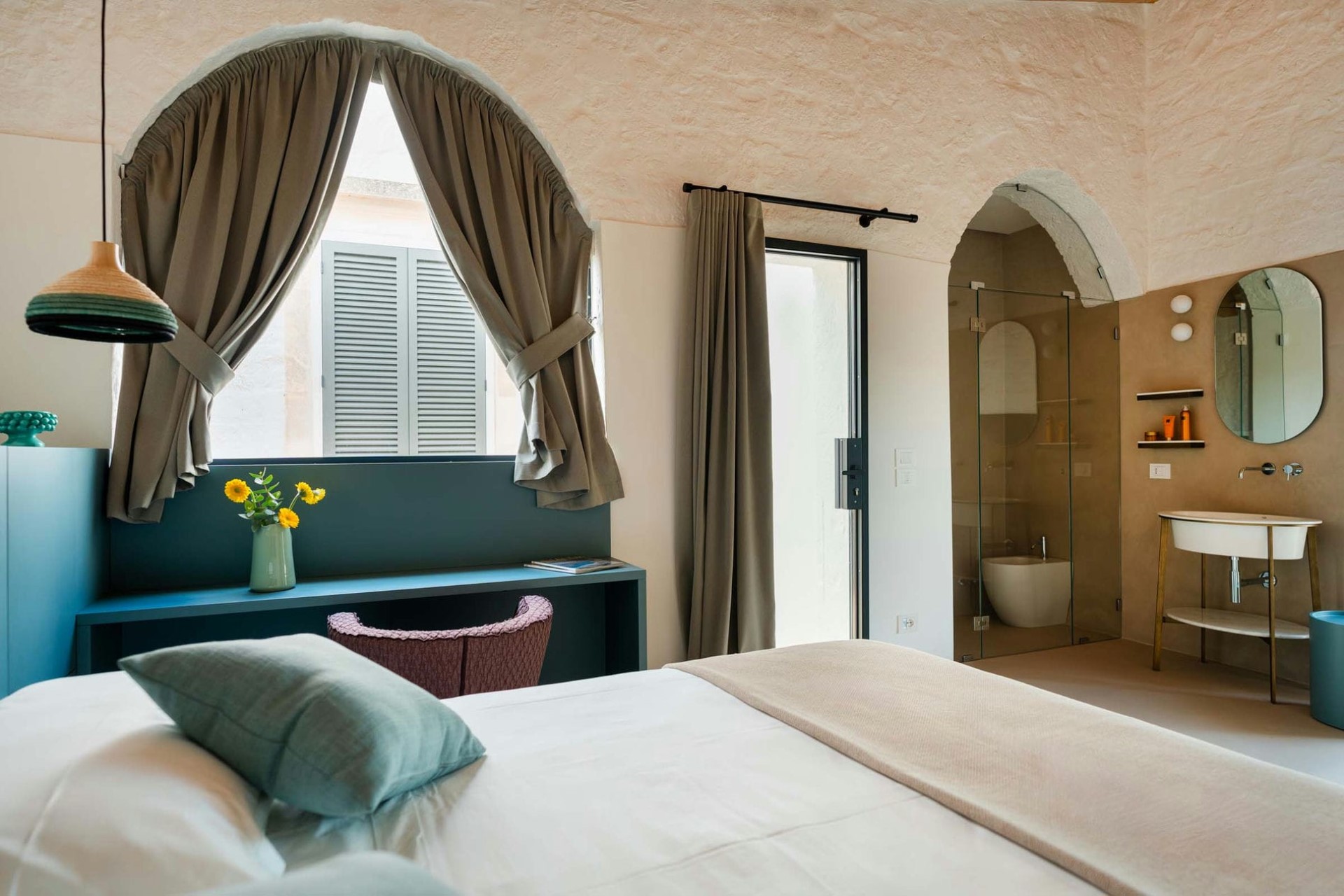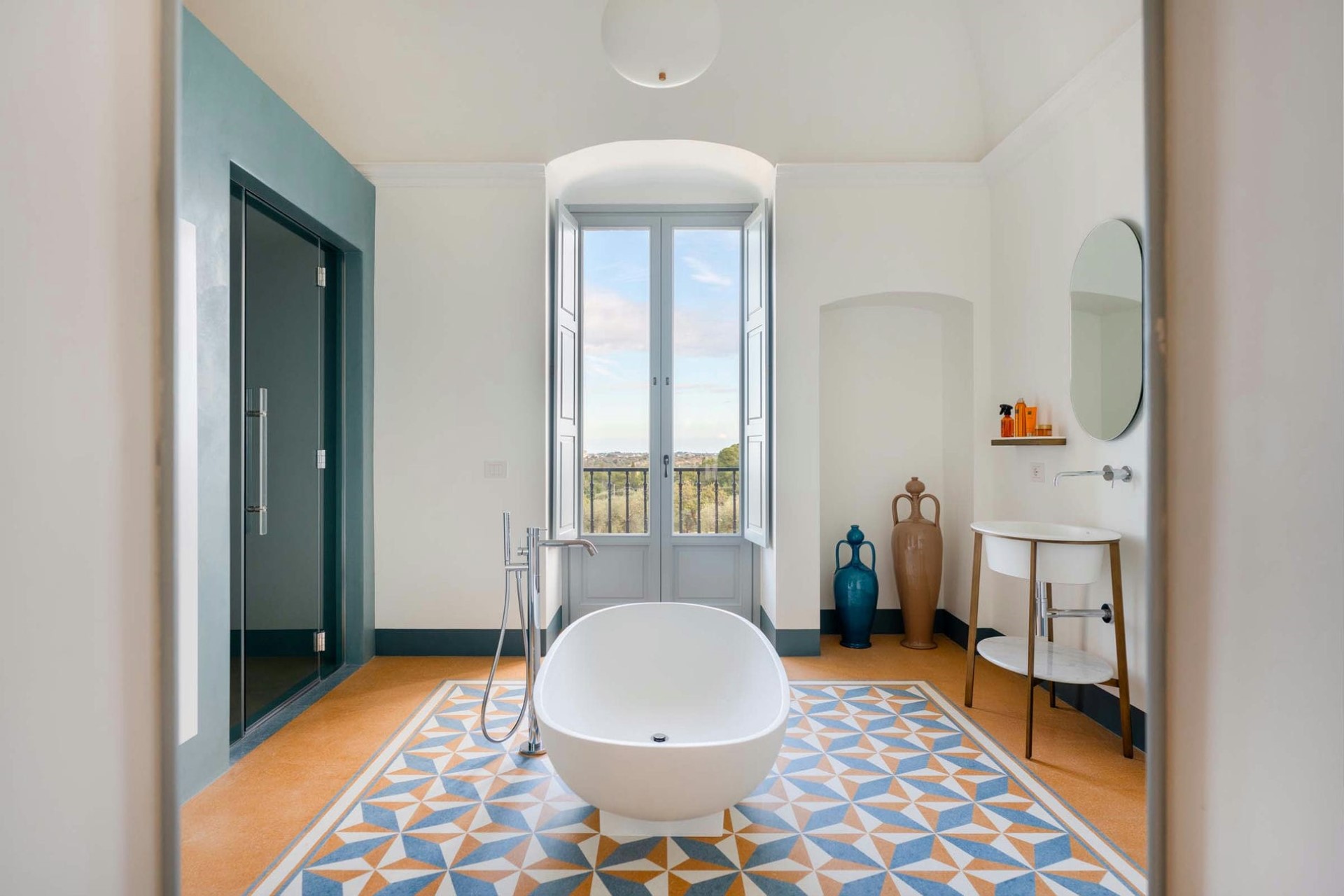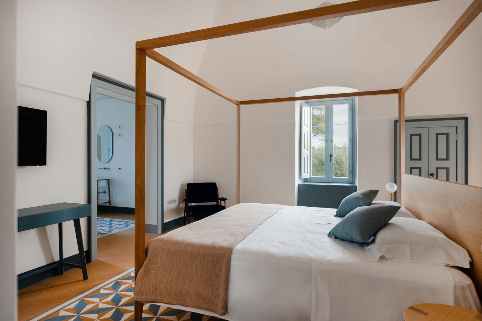 Master Bedroom – king-size bed, en-suite bathroom with hammam & bathtub/shower, and private balcony with countryside views
