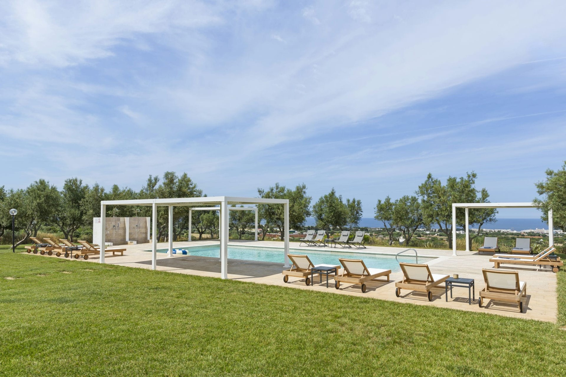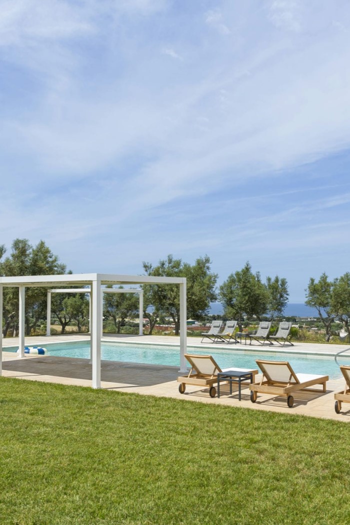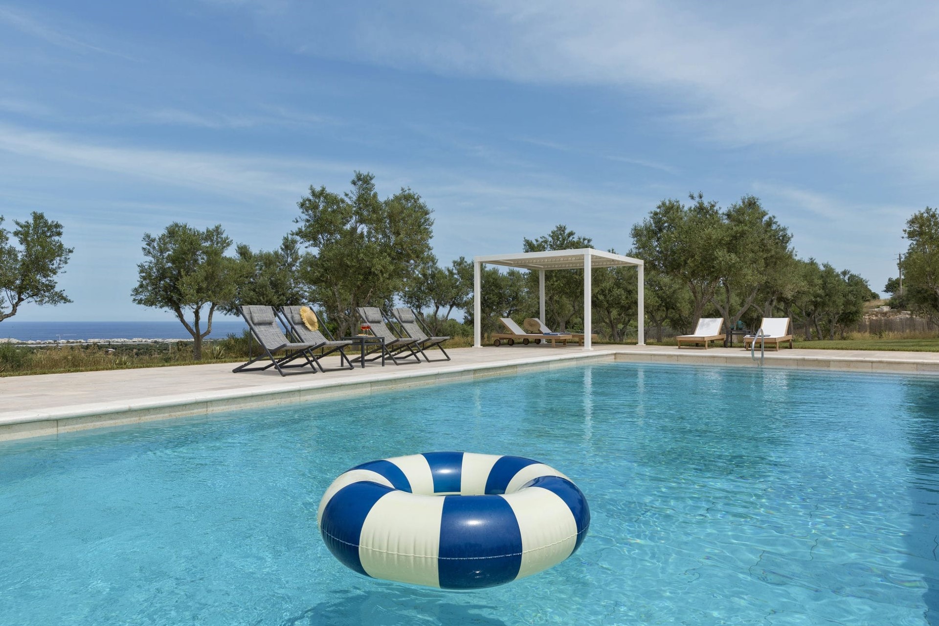At the far end of the garden, a 13-metre swimming pool offers respite from the Apulian sunshine. After a refreshing dip, guests can lie on poolside sun loungers and enjoy the sea views.
