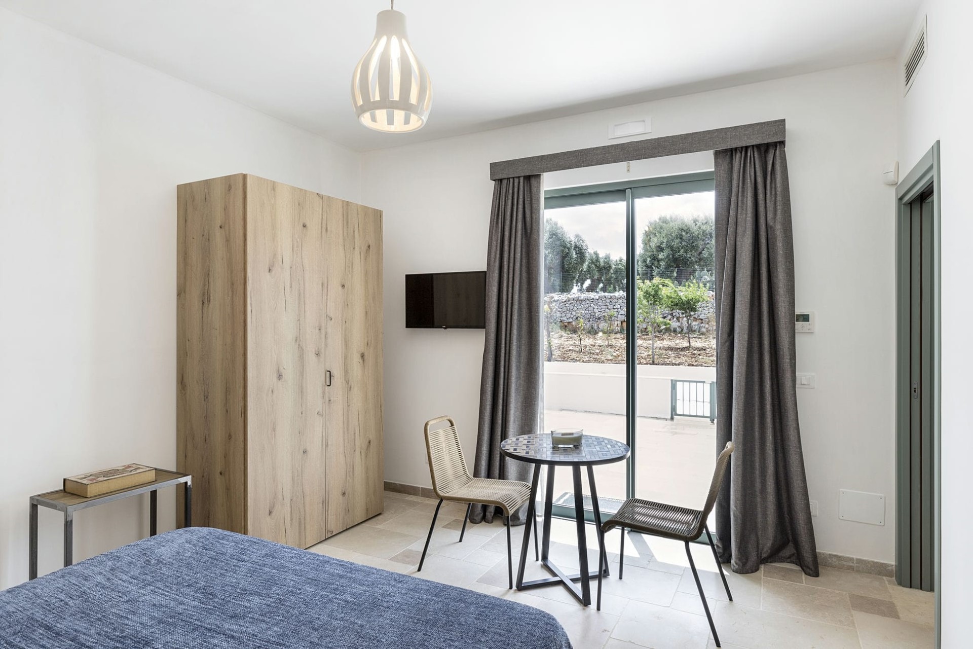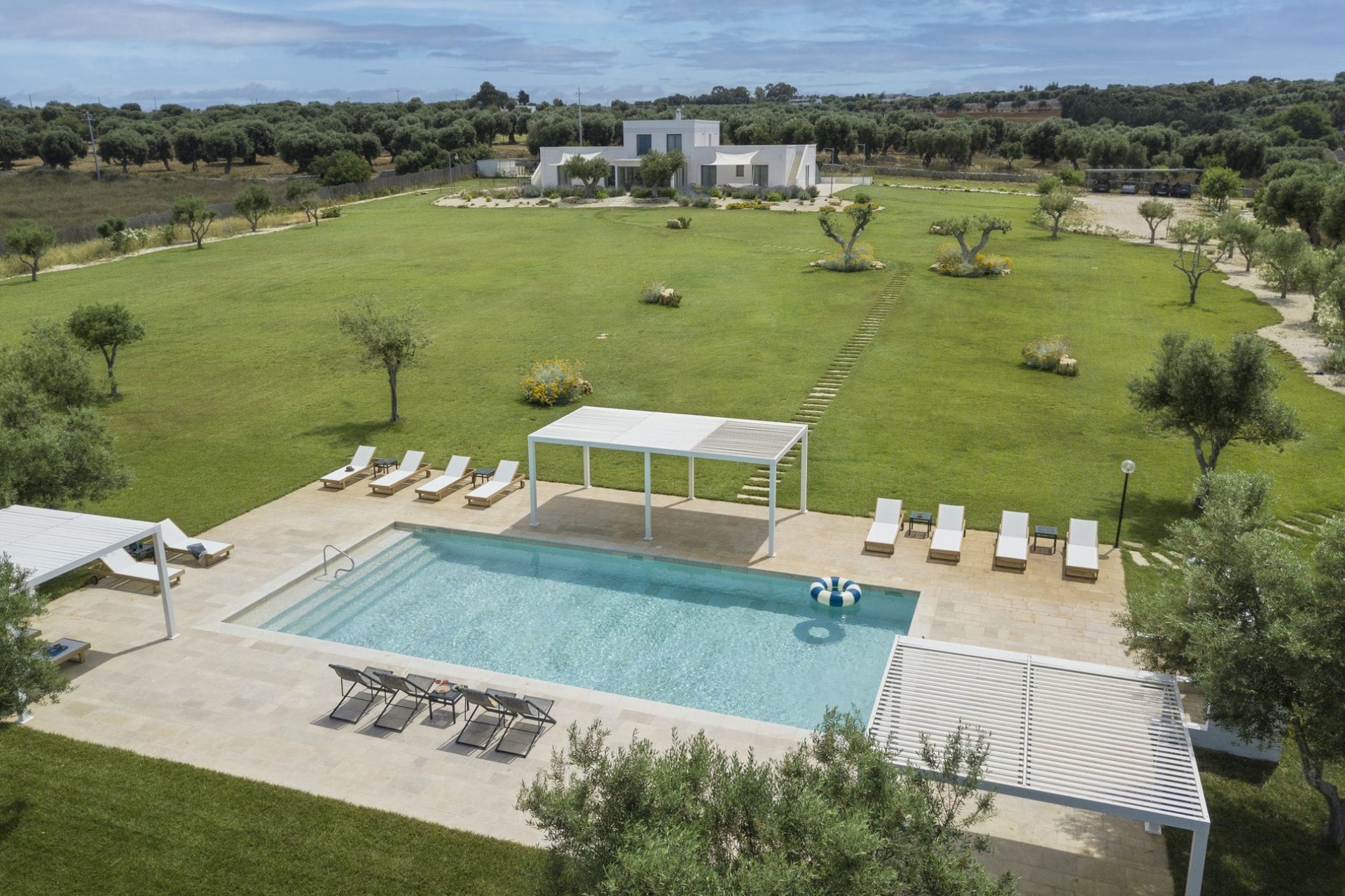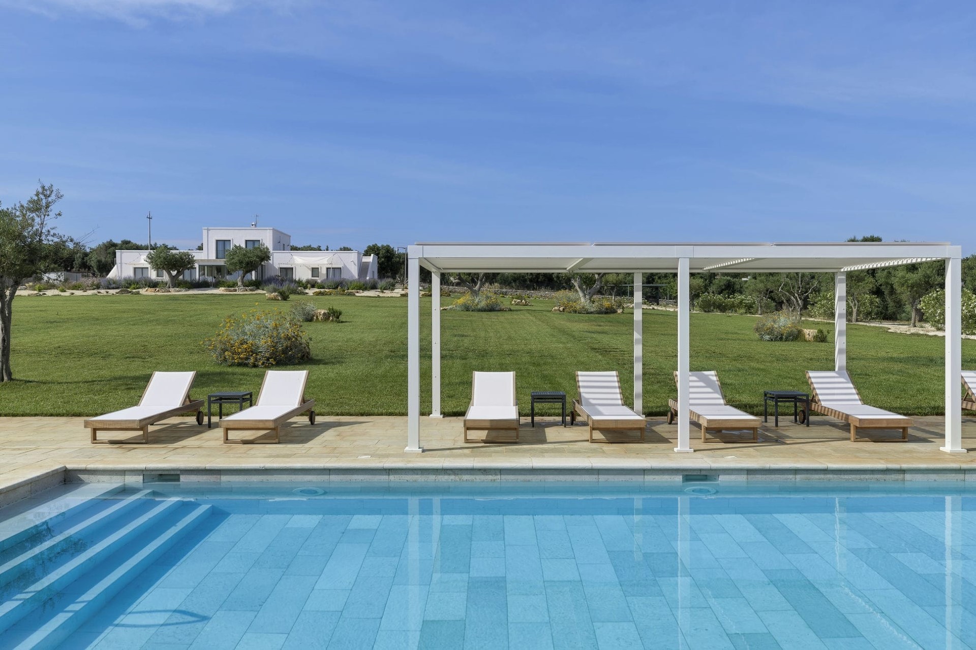 At the far end of the garden, a 13-metre swimming pool offers respite from the Apulian sunshine. After a refreshing dip, guests can lie on poolside sun loungers and enjoy the sea views.