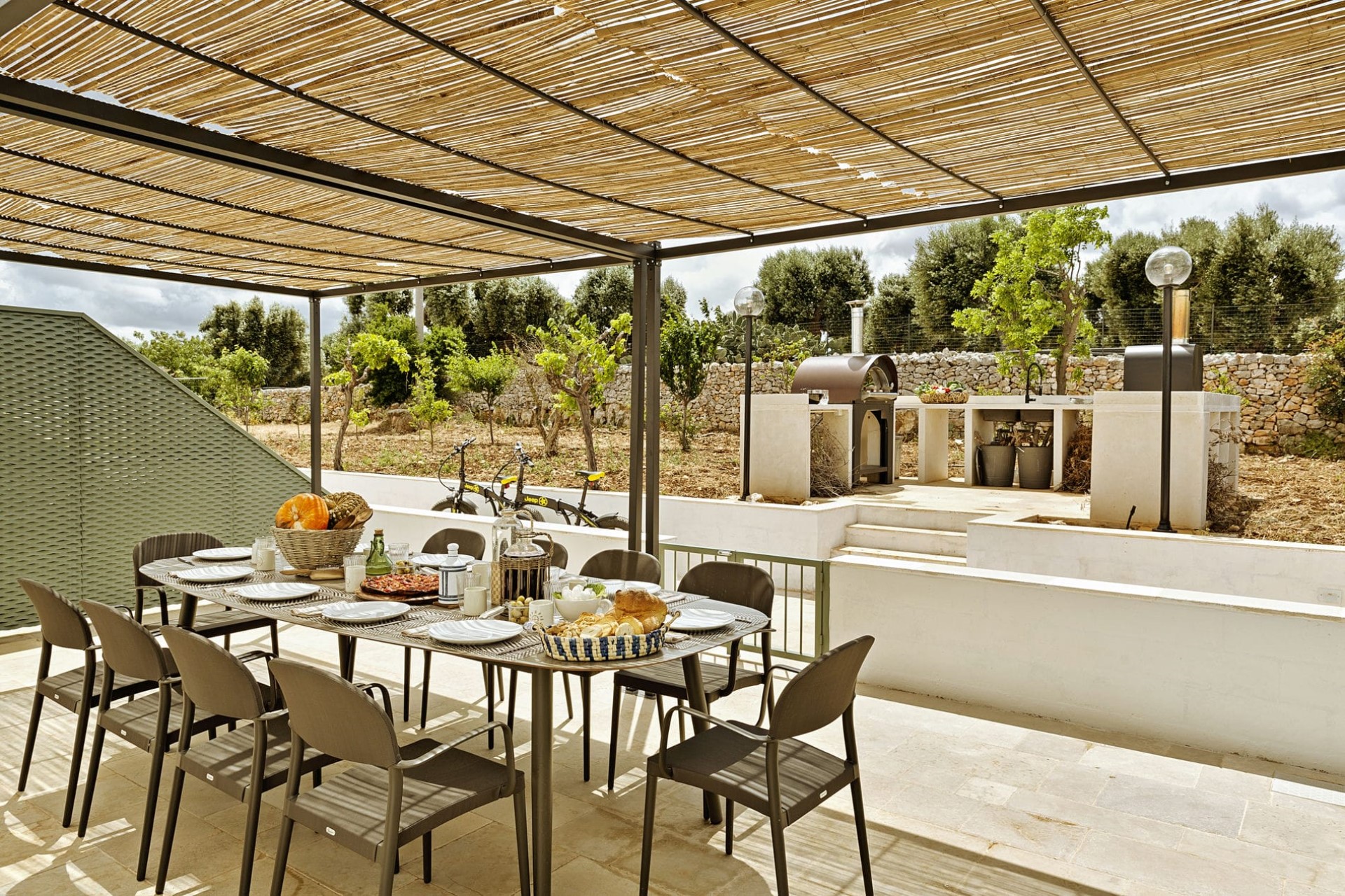 A paved terrace surrounds the villa, with a sun-shaded outdoor lounge on one side and an outdoor dining table on the other. The villa also features an outdoor kitchen with a barbecue and pizza oven for relaxed al fresco dining.