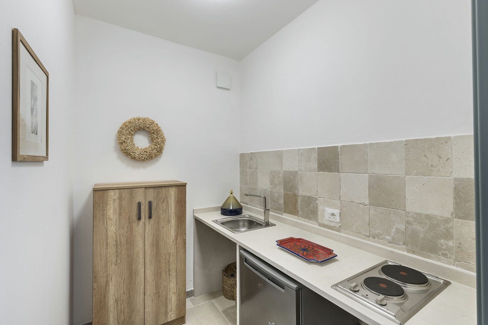 Suite 5 – double bed and private bathroom with shower + living room with double sofa bed, private bathroom with shower, kitchenette, and roof terrace access