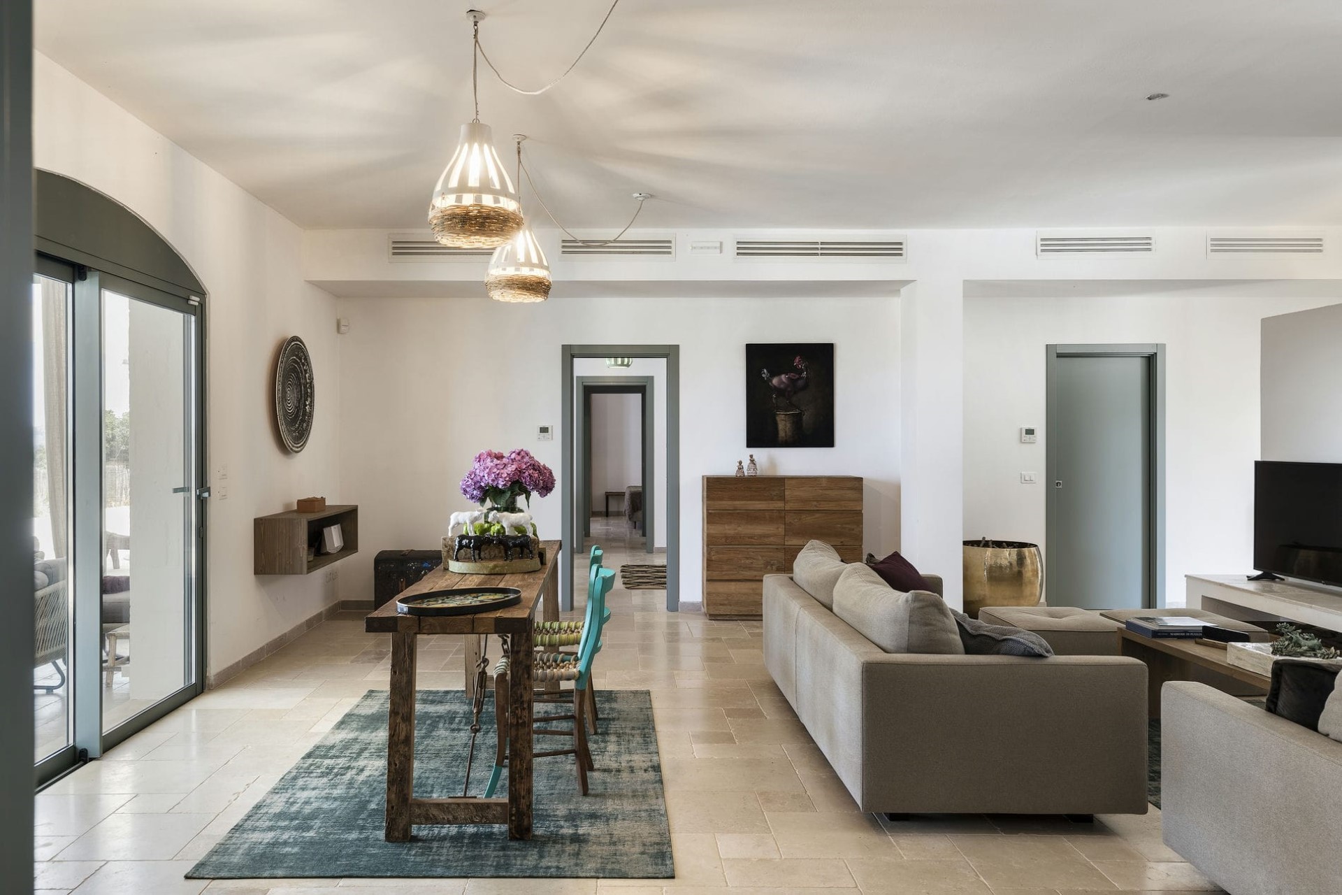 Expansive lawns spread across the estate, while olive, citrus, and centuries-old carob trees form a lush perimeter. As the gentle sea breeze drifts in from the coast, the fragrances of rosemary, juniper, and lavender fill the air, creating a serene atmosphere.