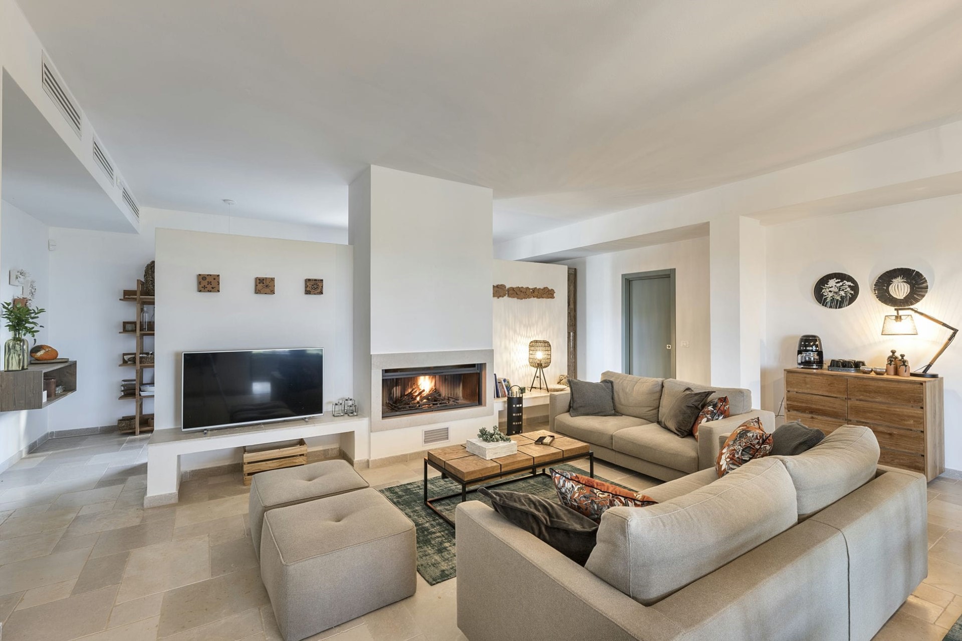 On cooler evenings, guests can head to the main lounge room, which is furnished with plush sofas, a flat-screen TV, and a cosy fireplace. Hidden behind this is the villa’s well-equipped kitchen, which leads out to the rear outdoor dining and barbecue area.