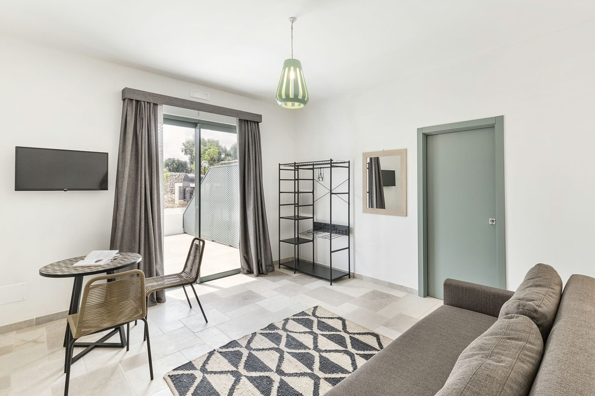Suite 4 – double bed and en-suite bathroom with shower + living room with double sofa bed, en-suite bathroom with shower, and terrace access